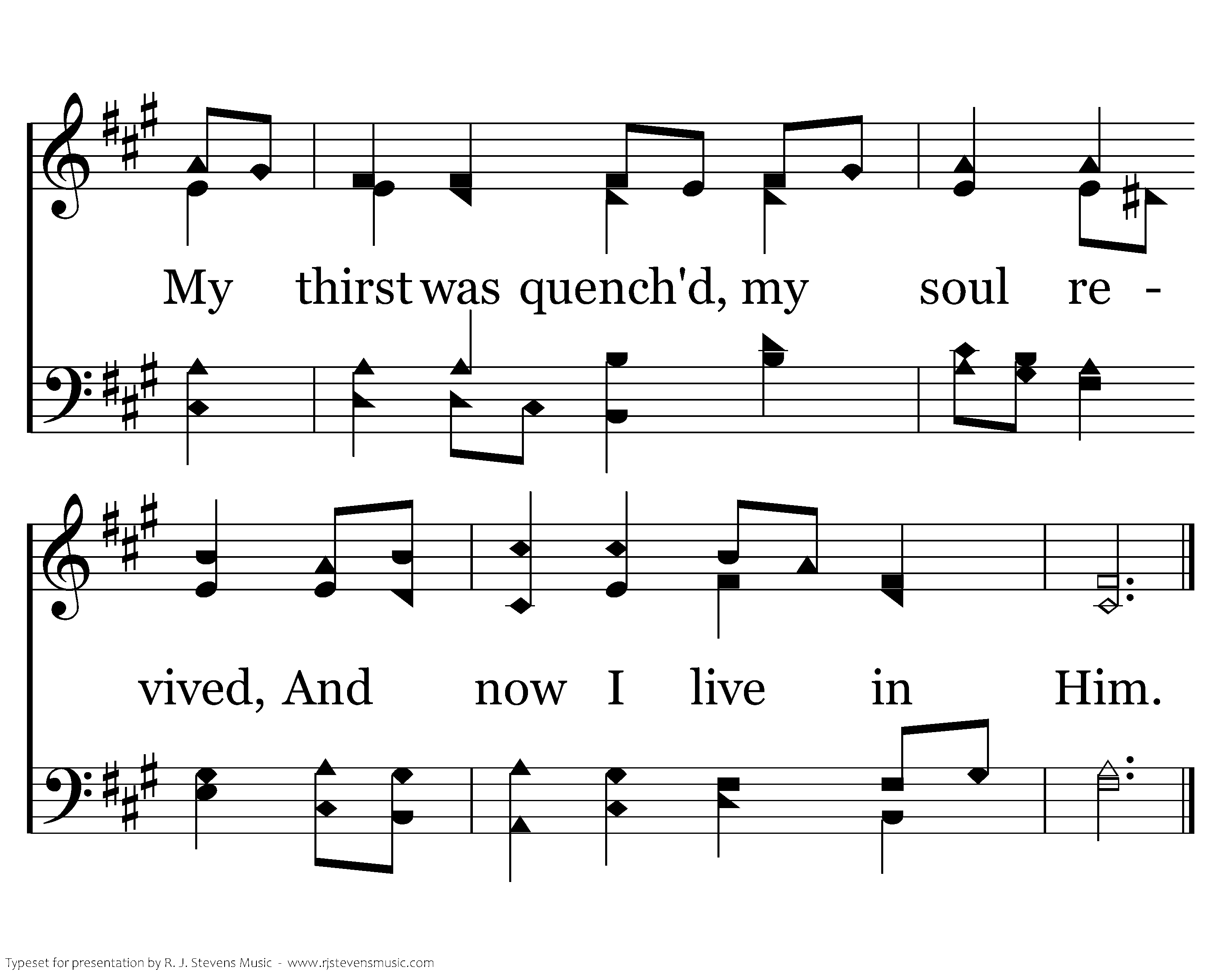 I heard the voice of Jesus say, "Behold, I freely give The living water, thirsty one, Stoop down, and drink, and live." I came to Jesus and I drank Of that lifegiving stream; My thirst was quench'd, my soul revived, And now I live in Him.