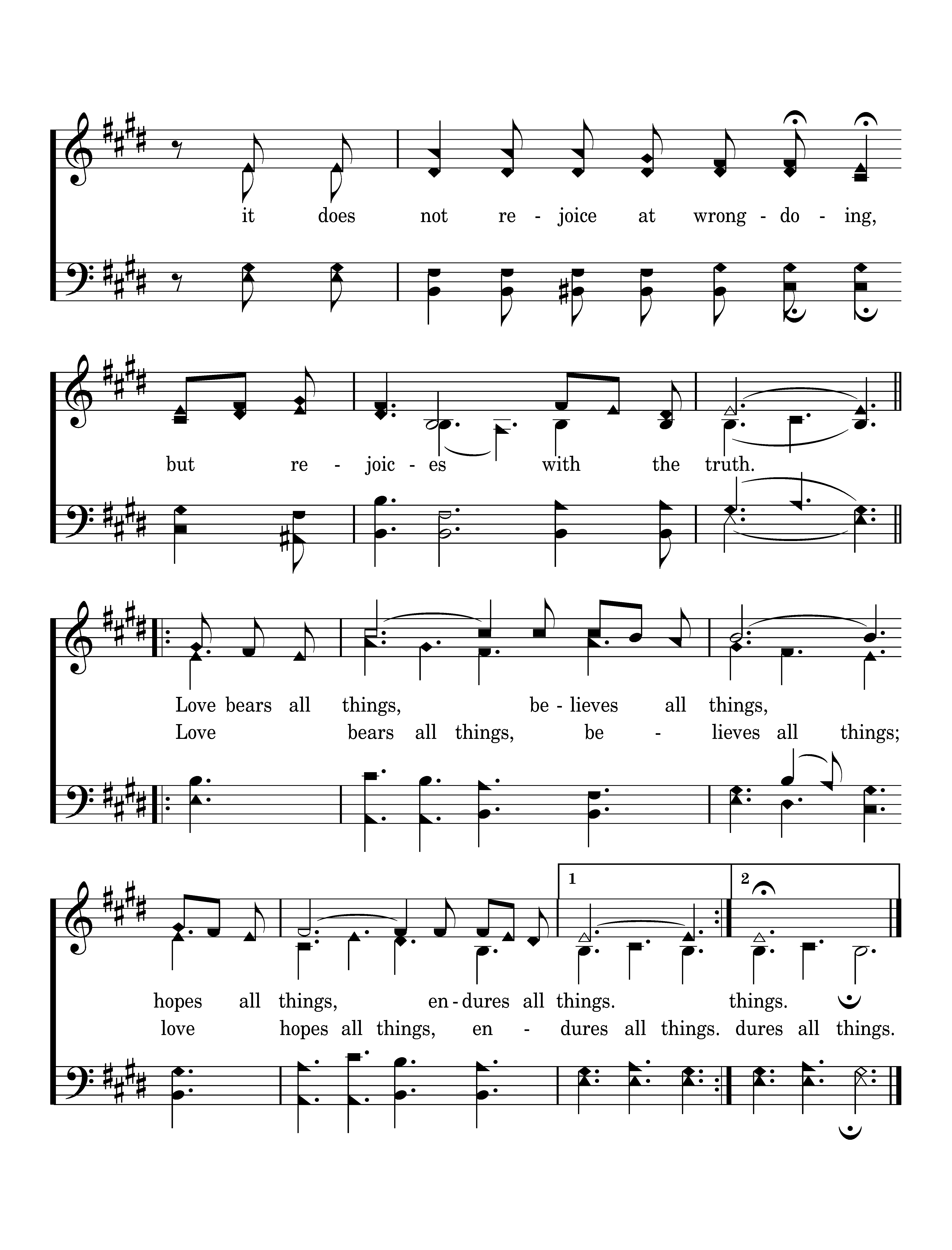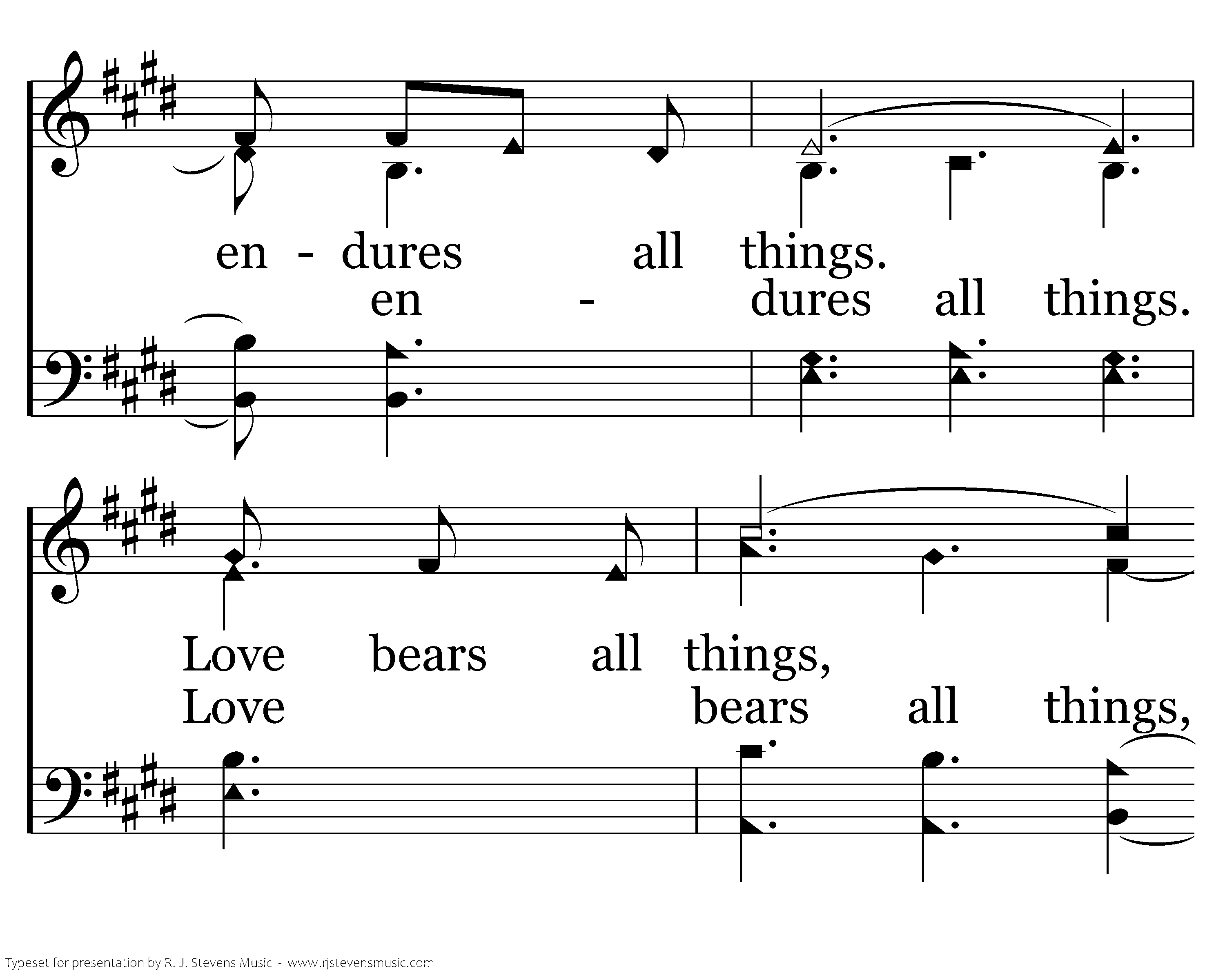 Love is patient and kind; love does not envy or boast; it is not arrogant or rude. It does not insist on its own way; it is not irritable or resentful; it does not rejoice at wrongdoing, but rejoices with the truth. Love bears all things, believes all things, hopes all things, endures all things. Love bears all things, believes all things, hopes all things, endures all things.