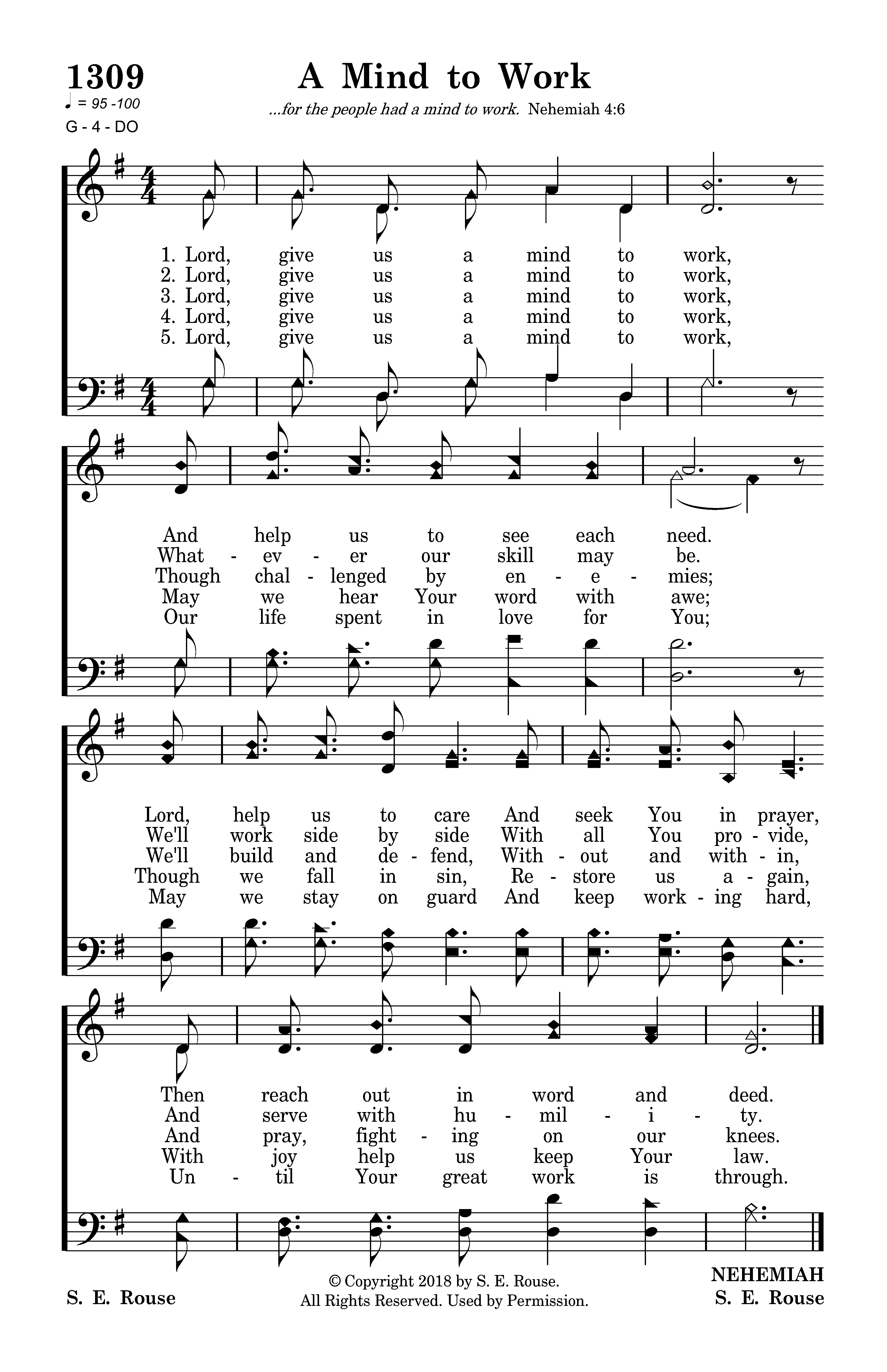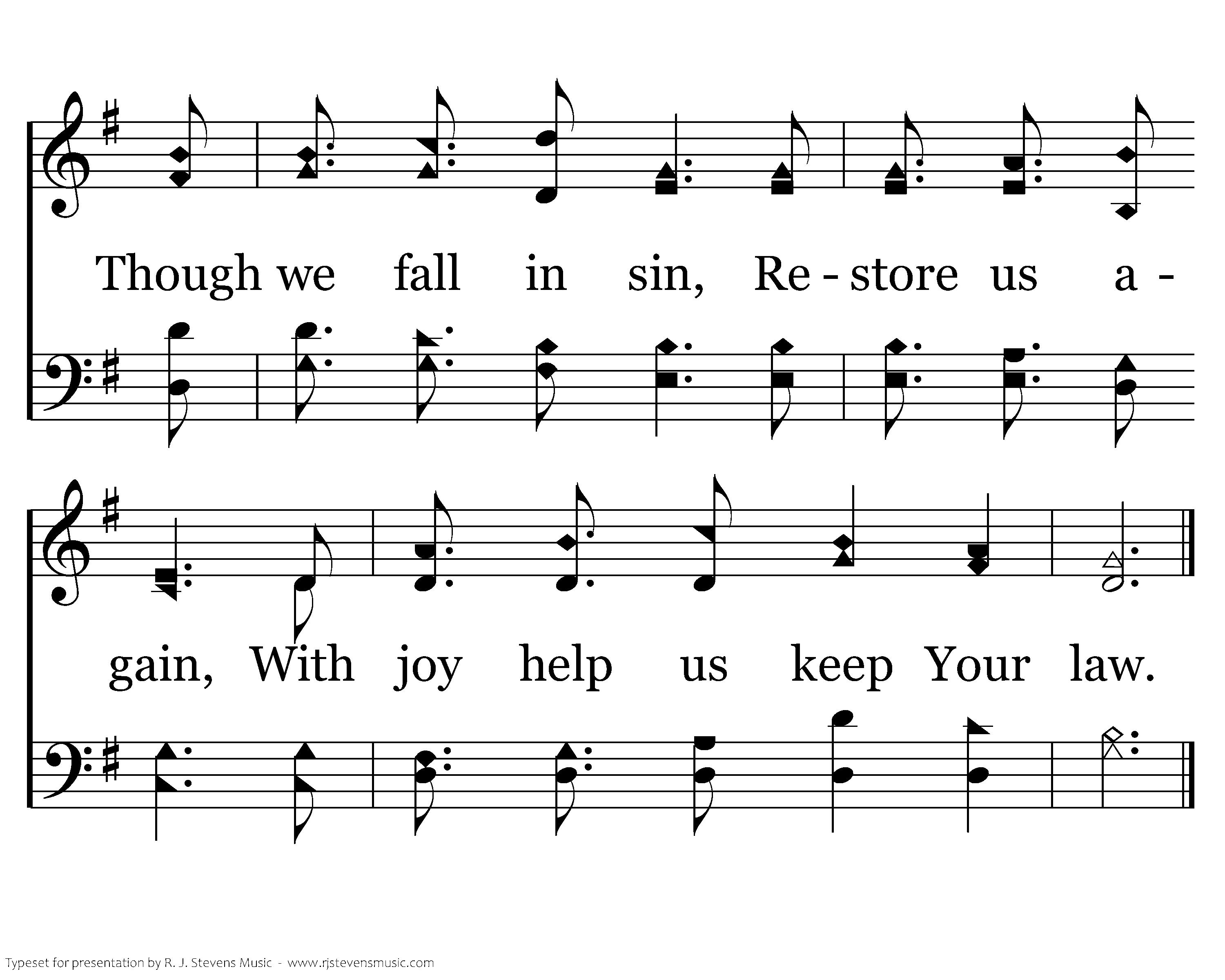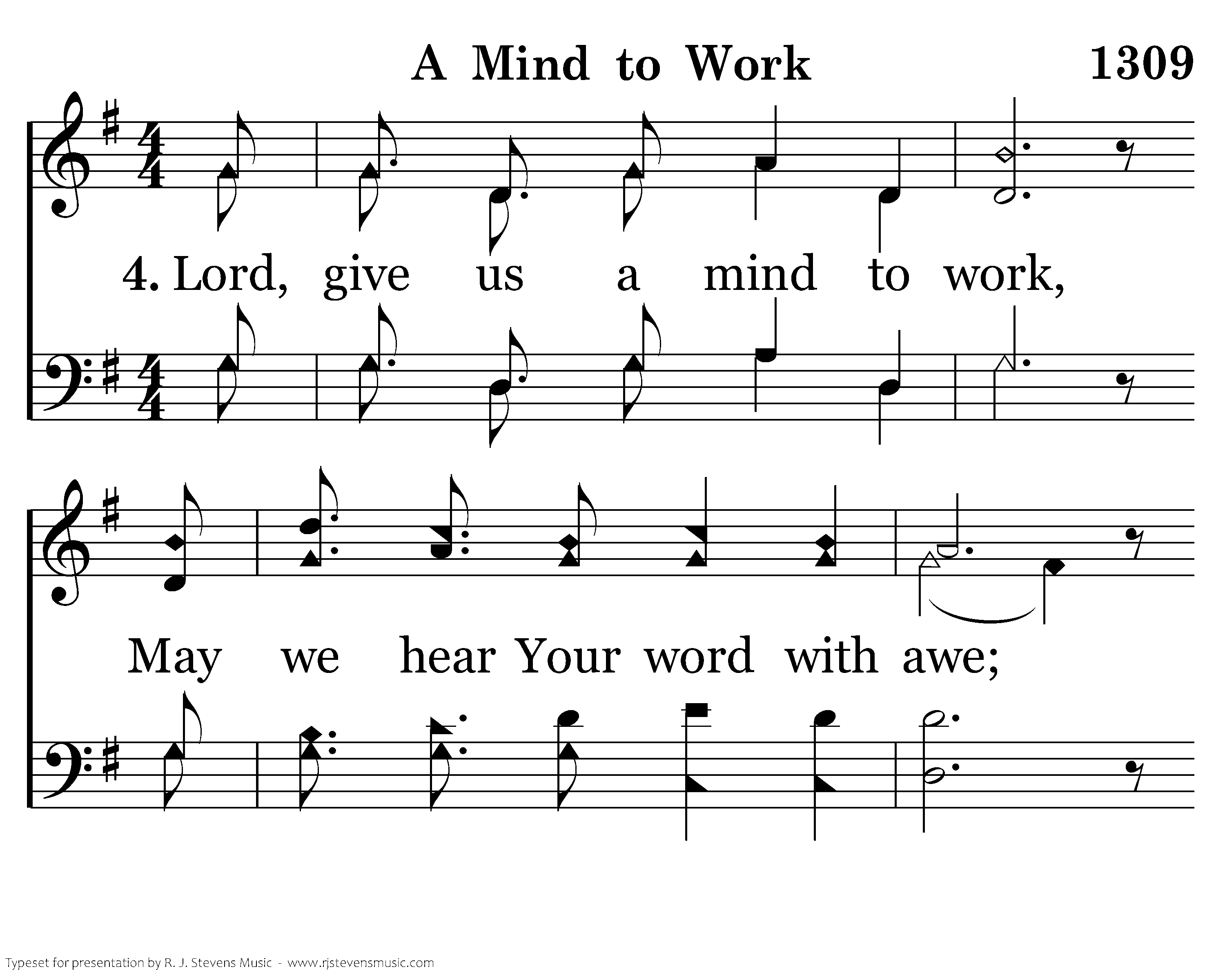 Lord, give us a mind to work, May we hear Your word with awe; Though we fall in sin, Restore us again, With joy help us keep Your law.