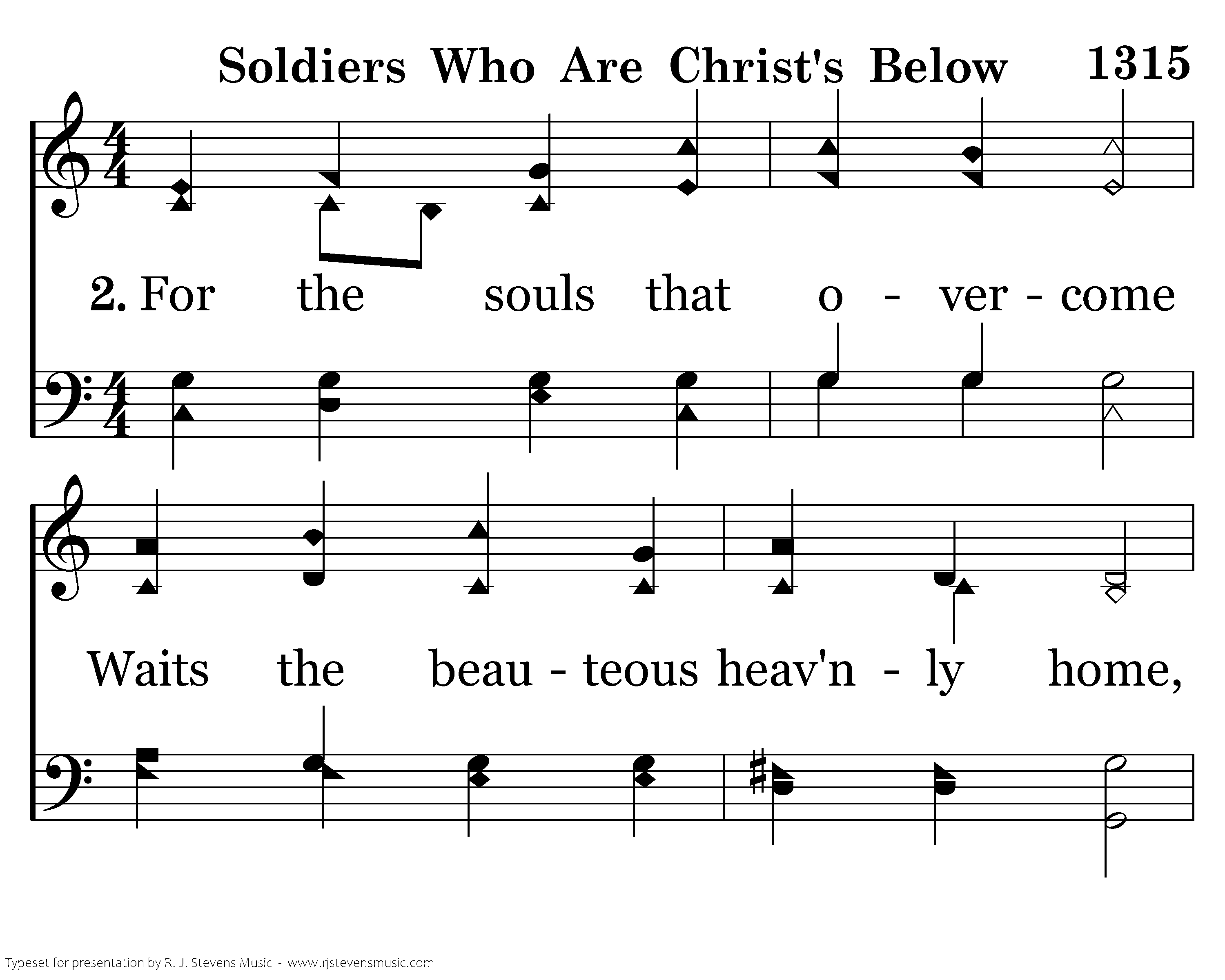 Soldiers who are Christ's below, Strong in faith resist the foe: Boundless is the pledged reward Unto them who serve the Lord.