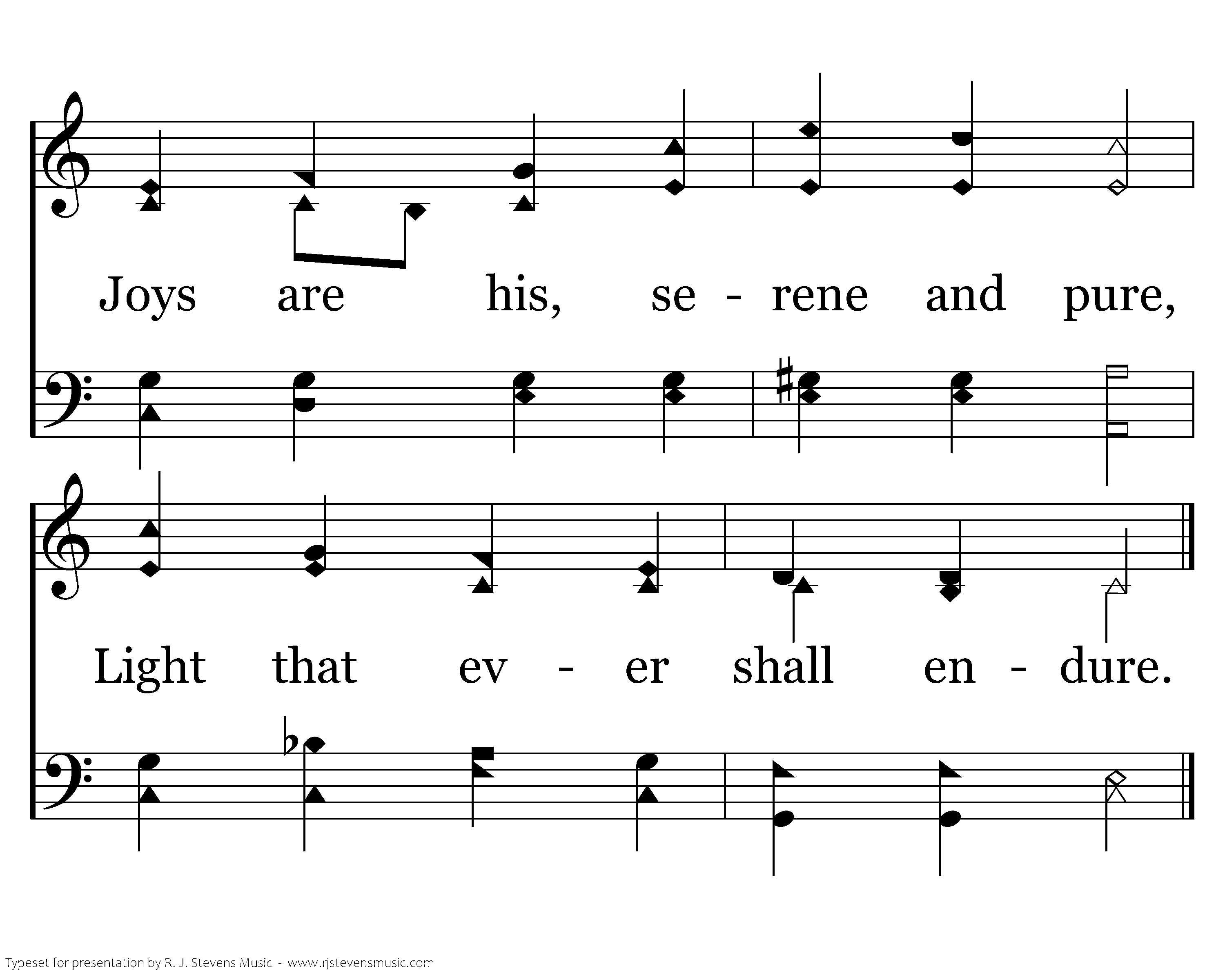 ’Tis no palm of fading leaves That the conqu'ror’s hand receives; Joys are his, serene and pure, Light that ever shall endure.