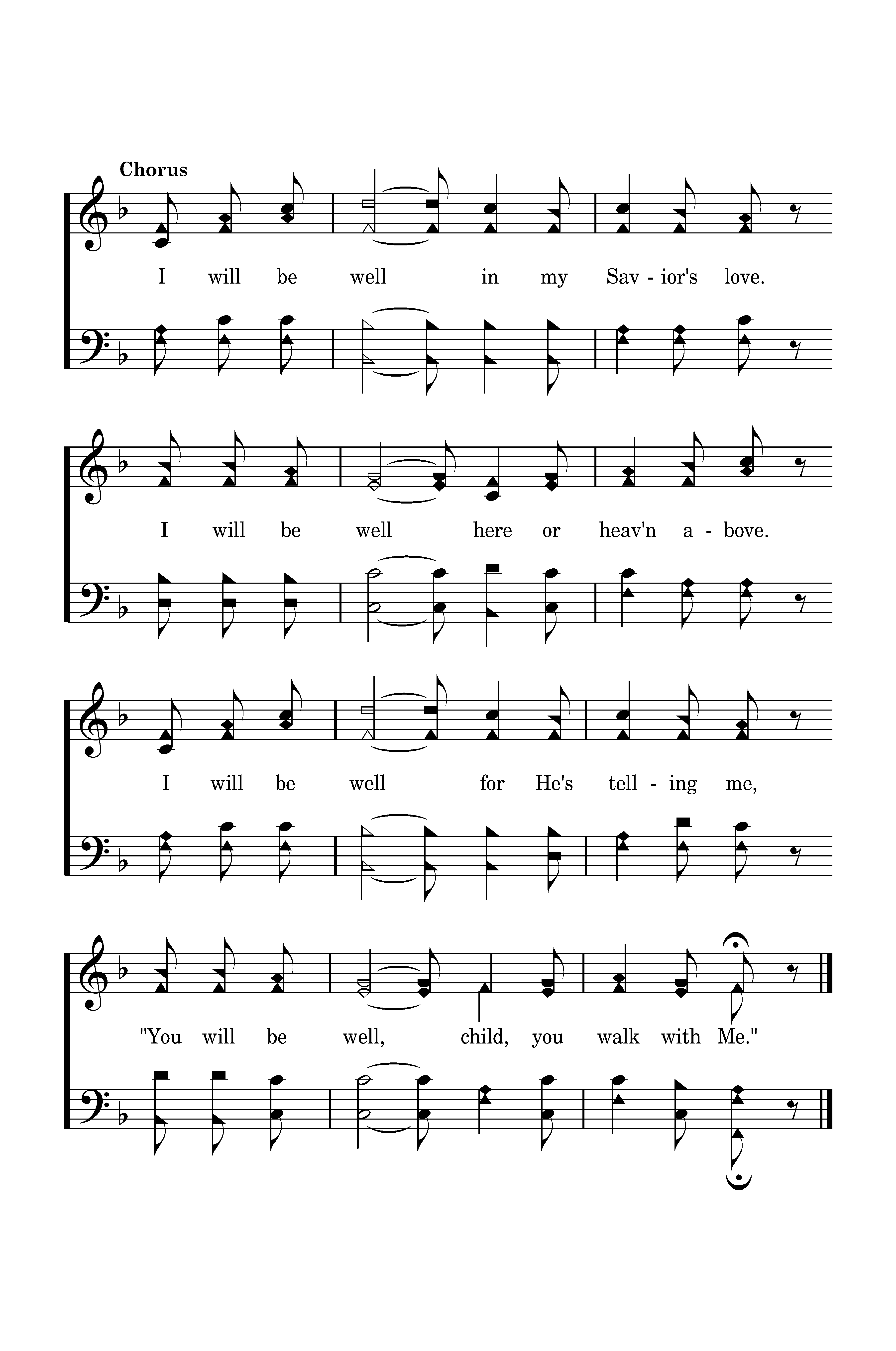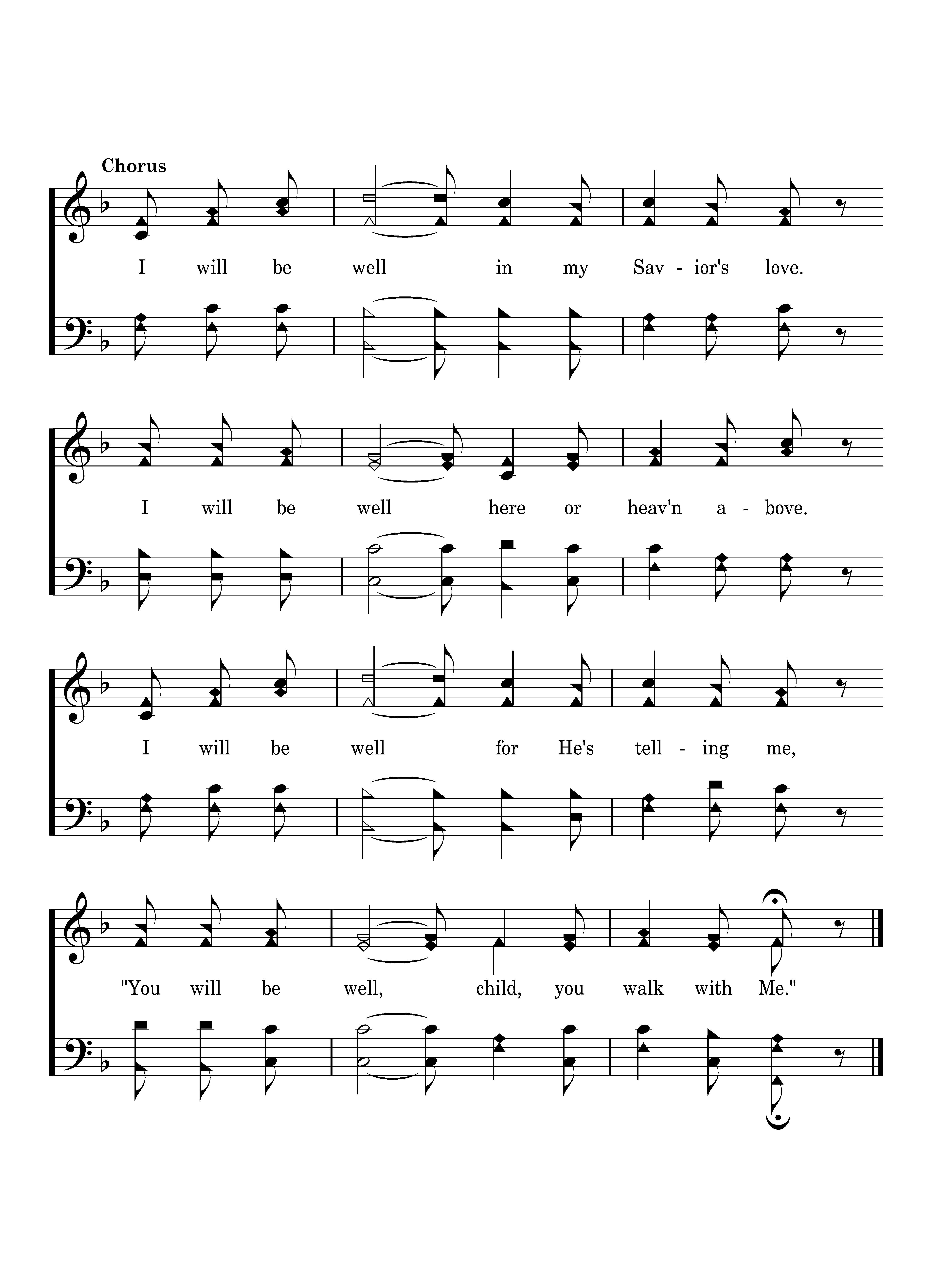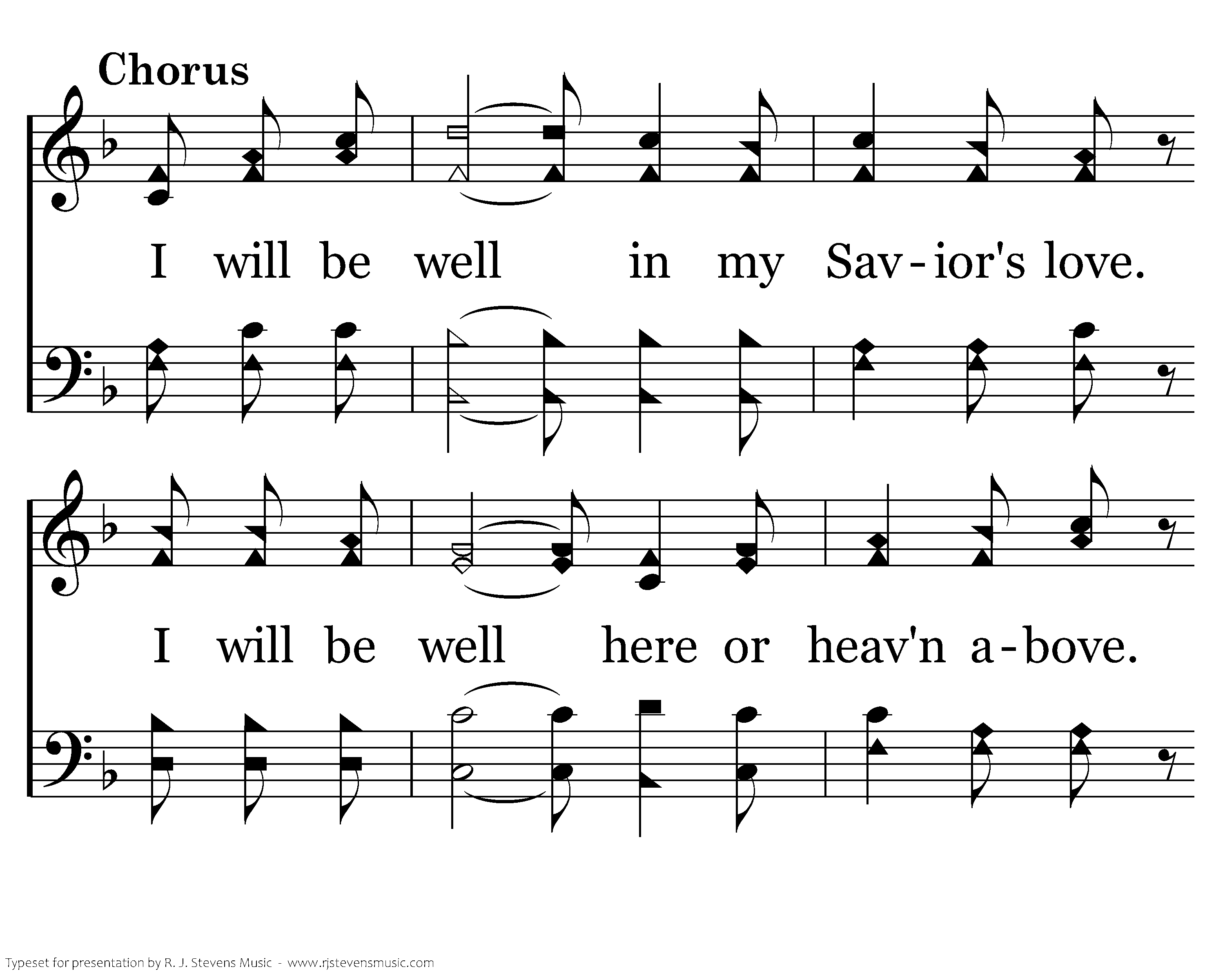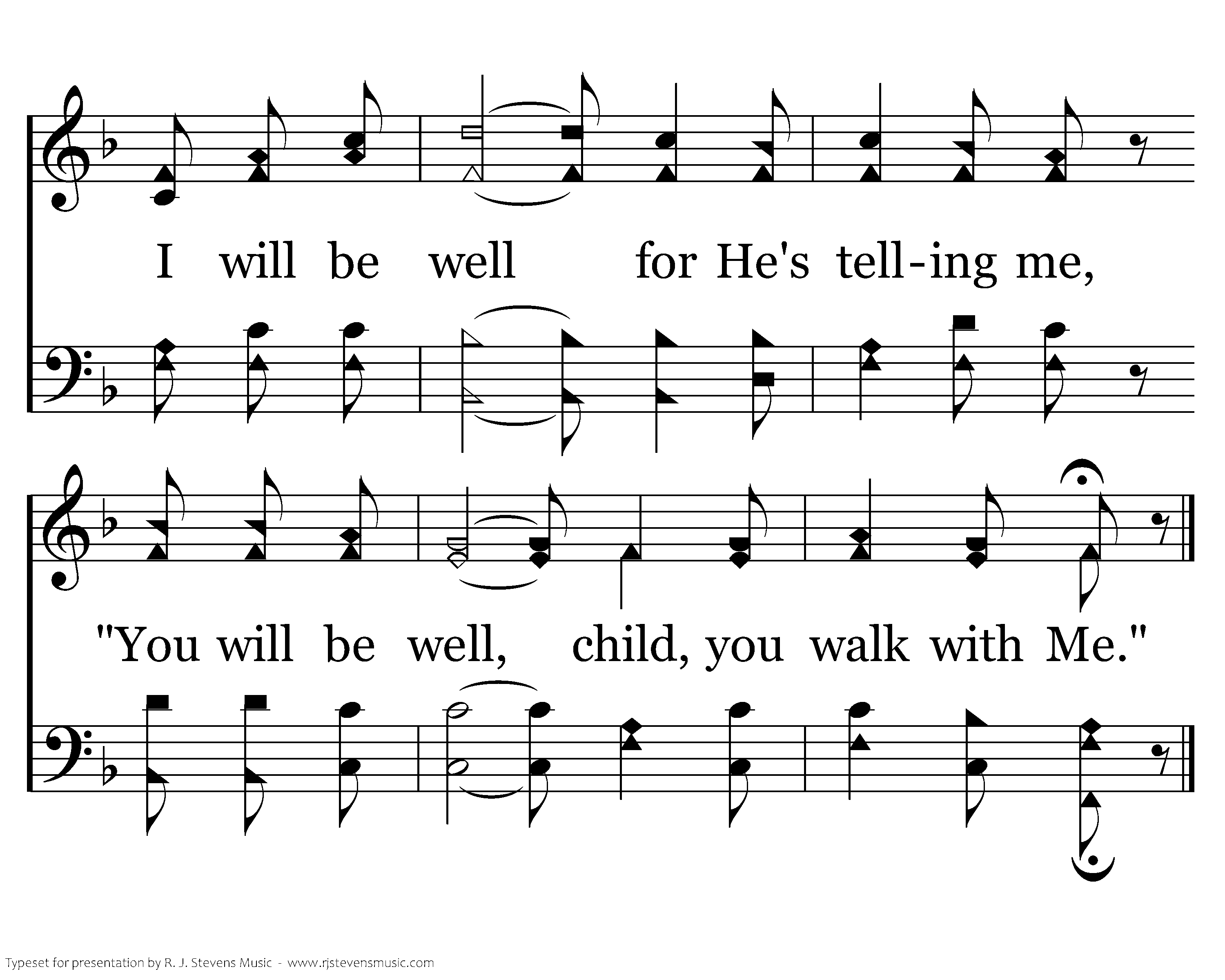I will be well in my Savior's love. I will be well here or heav'n above. I will be well for He's telling me, "You will be well, child, you walk with Me."