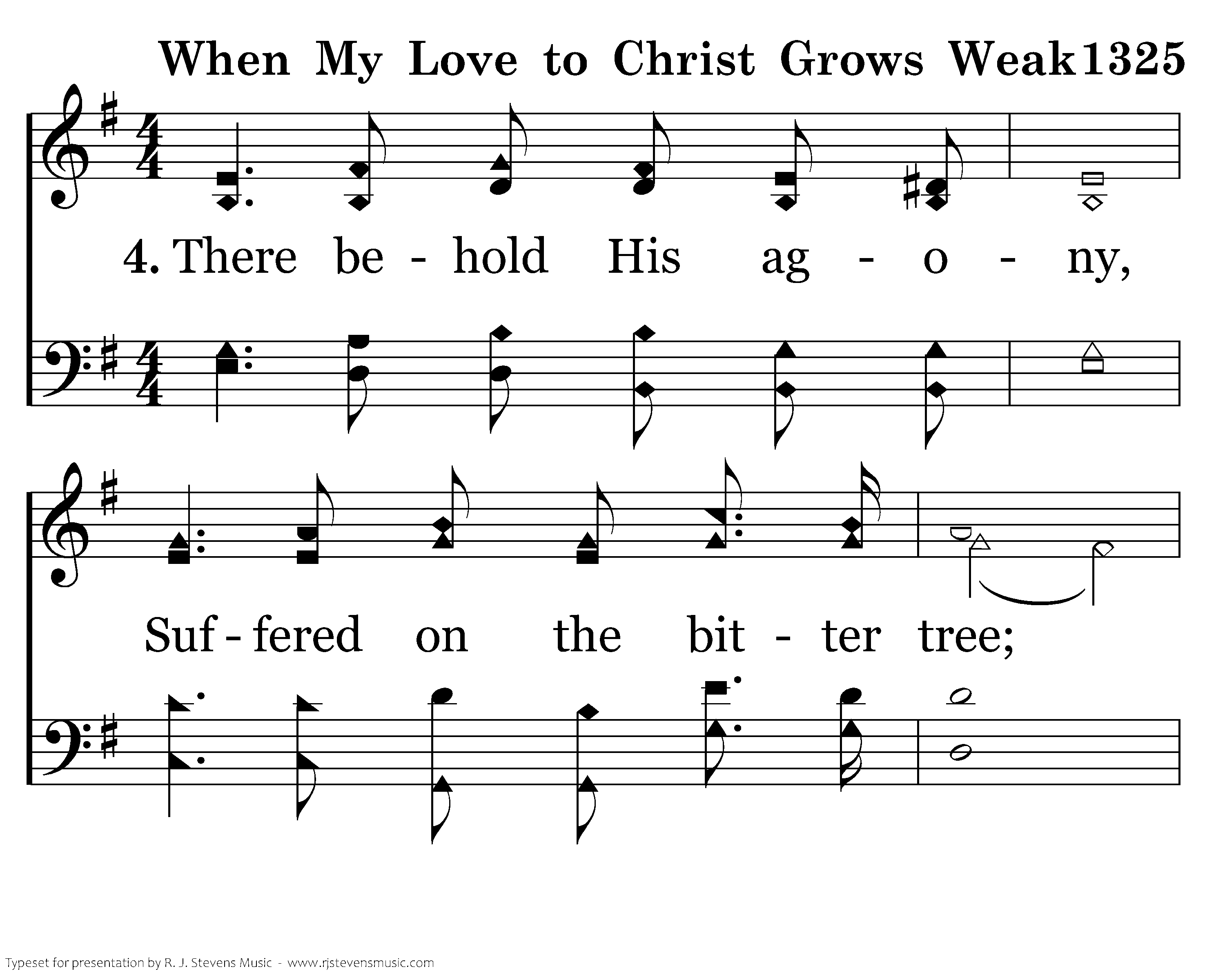 There behold His agony, Suffered on the bitter tree; See His anguish, see His faith, Love triumphant still in death.