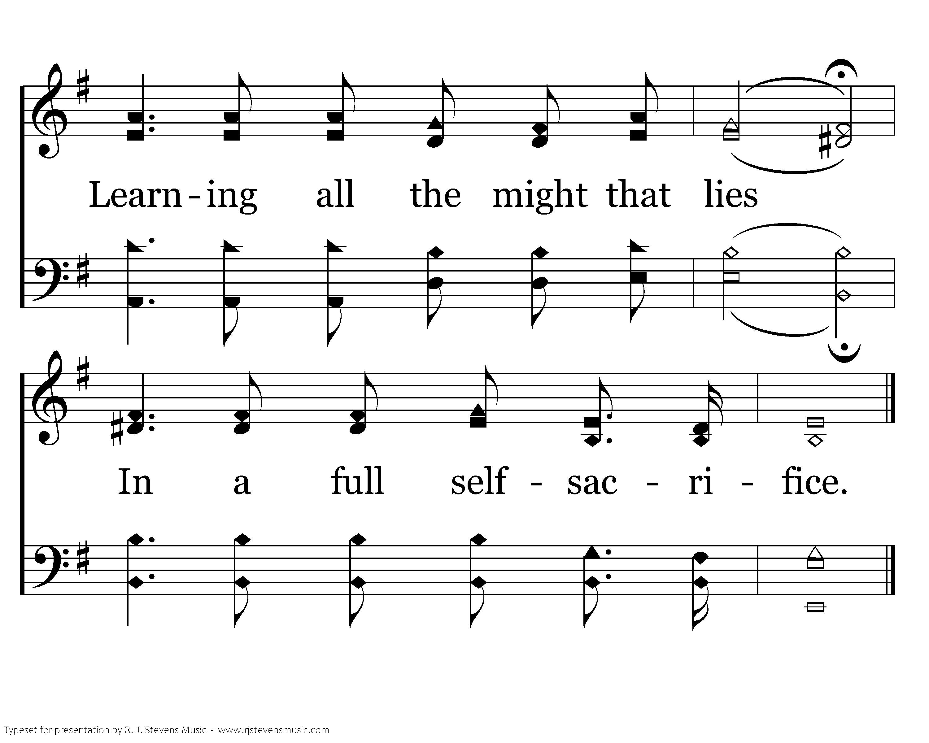 Then to life I turn again, Learning all the worth of pain, Learning all the might that lies In a full selfsacrifice.