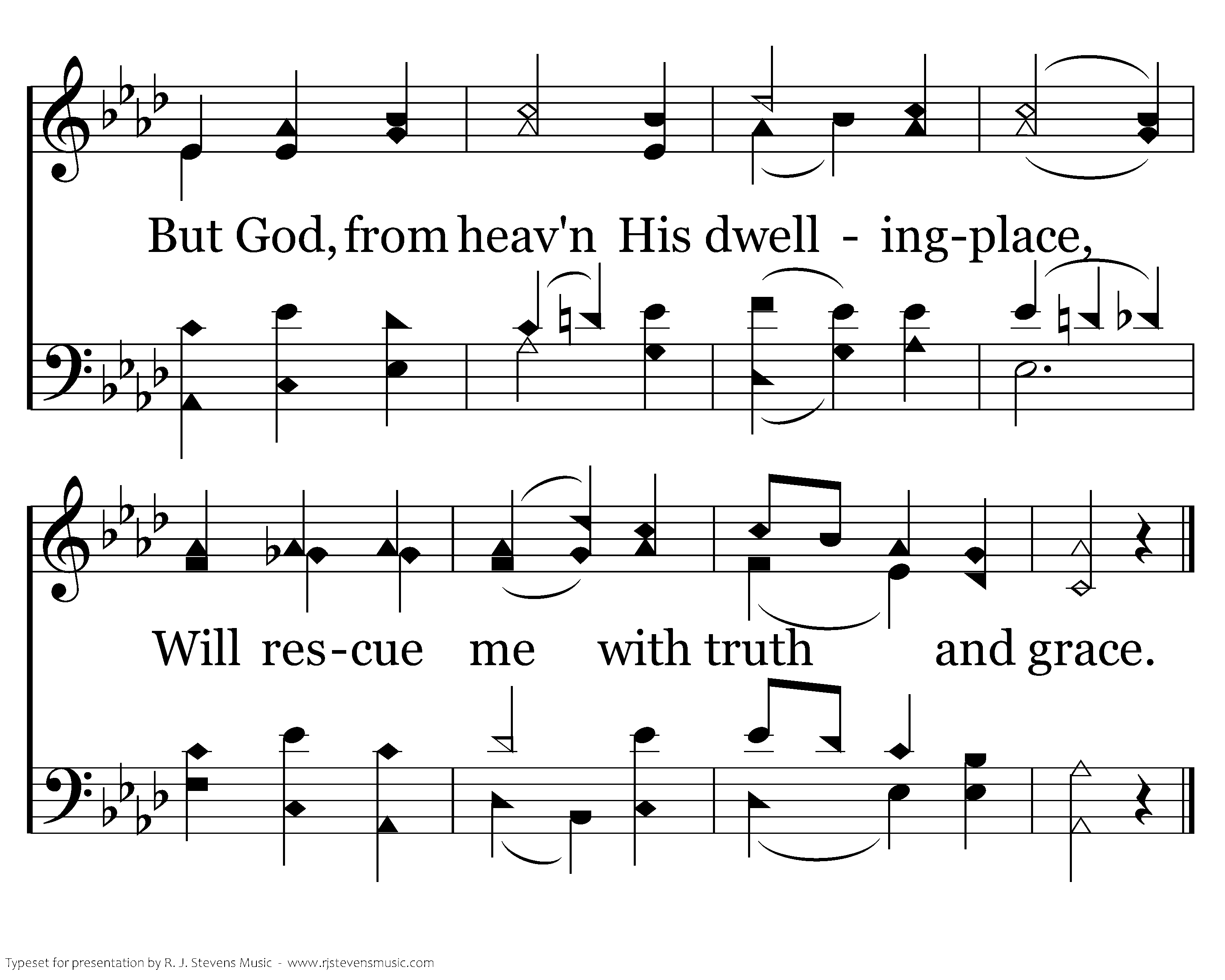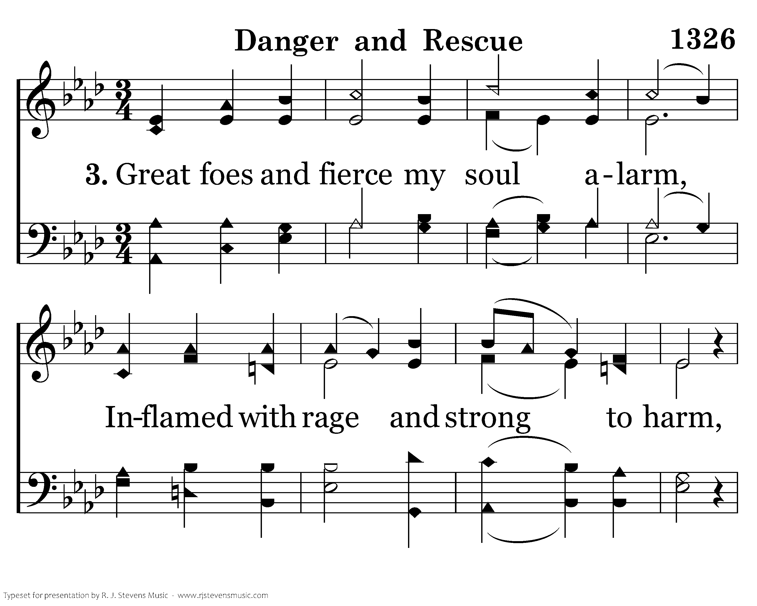 Great foes and fierce my soul alarm, Inflamed with rage and strong to harm, But God, from heav'n His dwellingplace, Will rescue me with truth and grace.