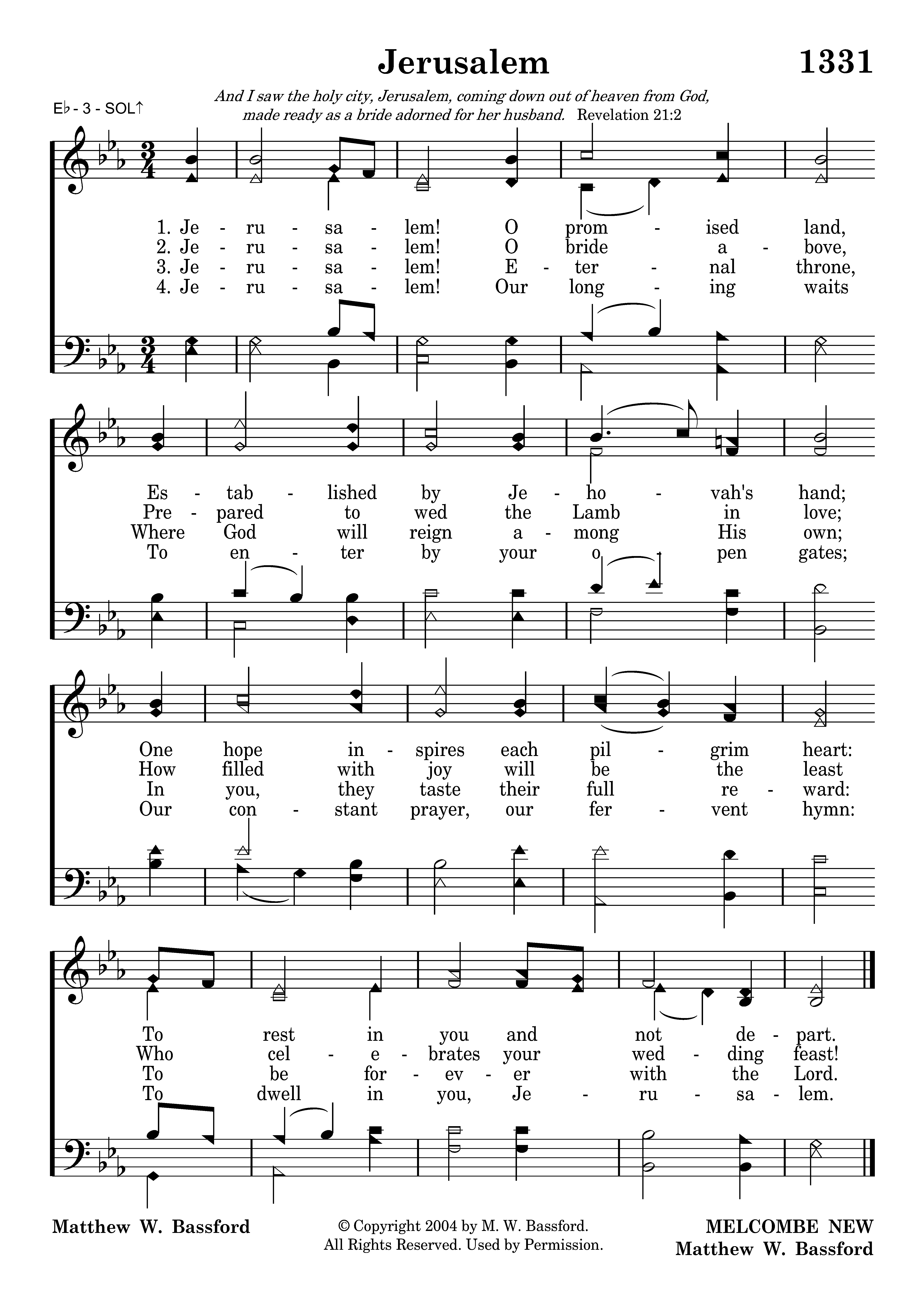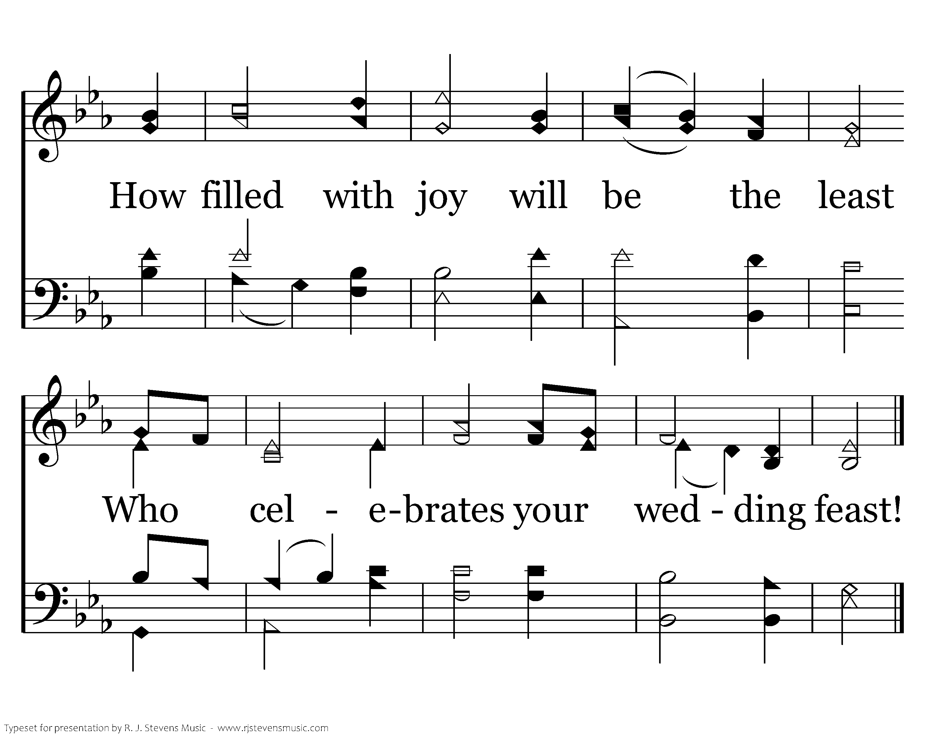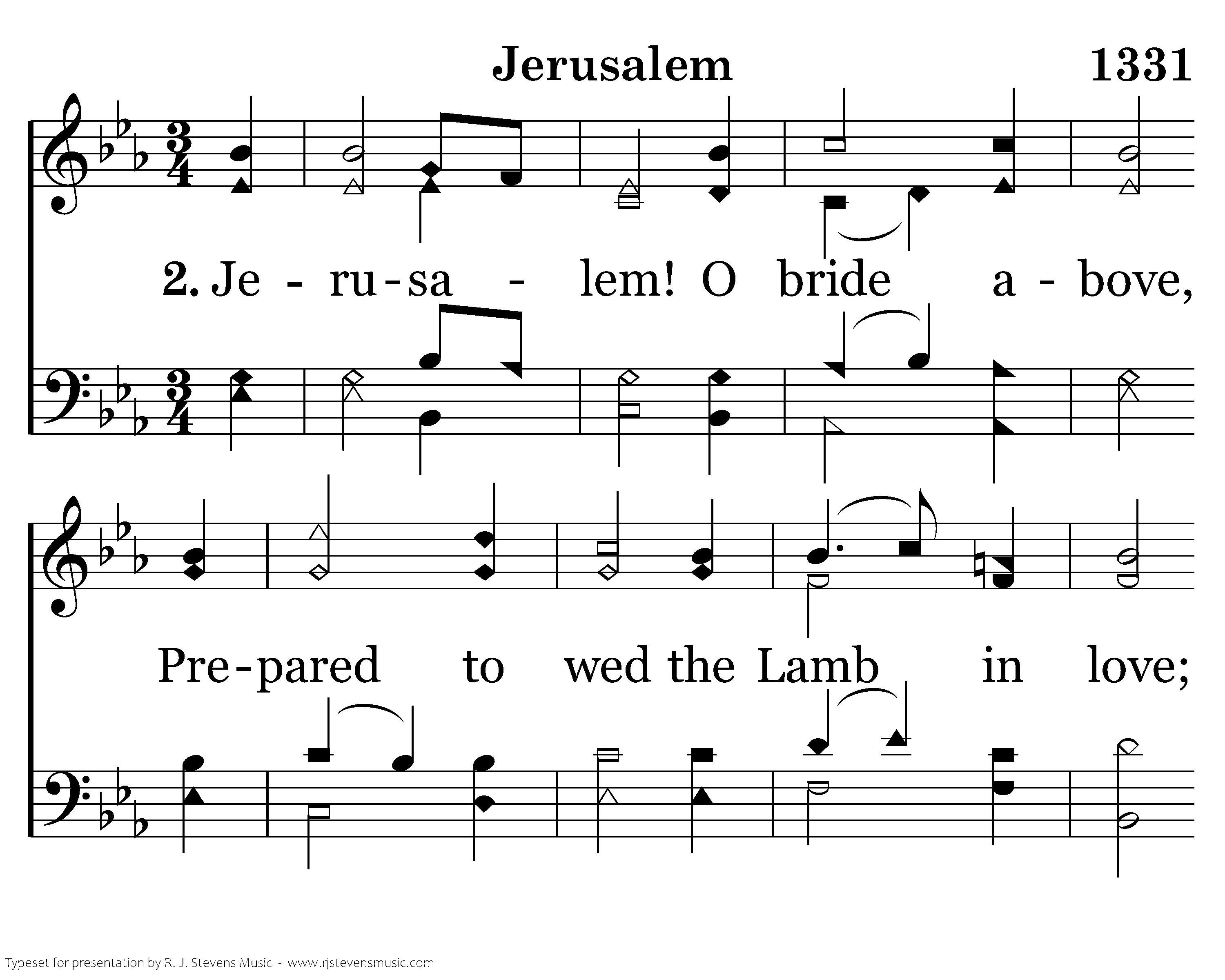 Jerusalem! O bride above, Prepared to wed the Lamb in love; How filled with joy will be the least Who celebrates your wedding feast!