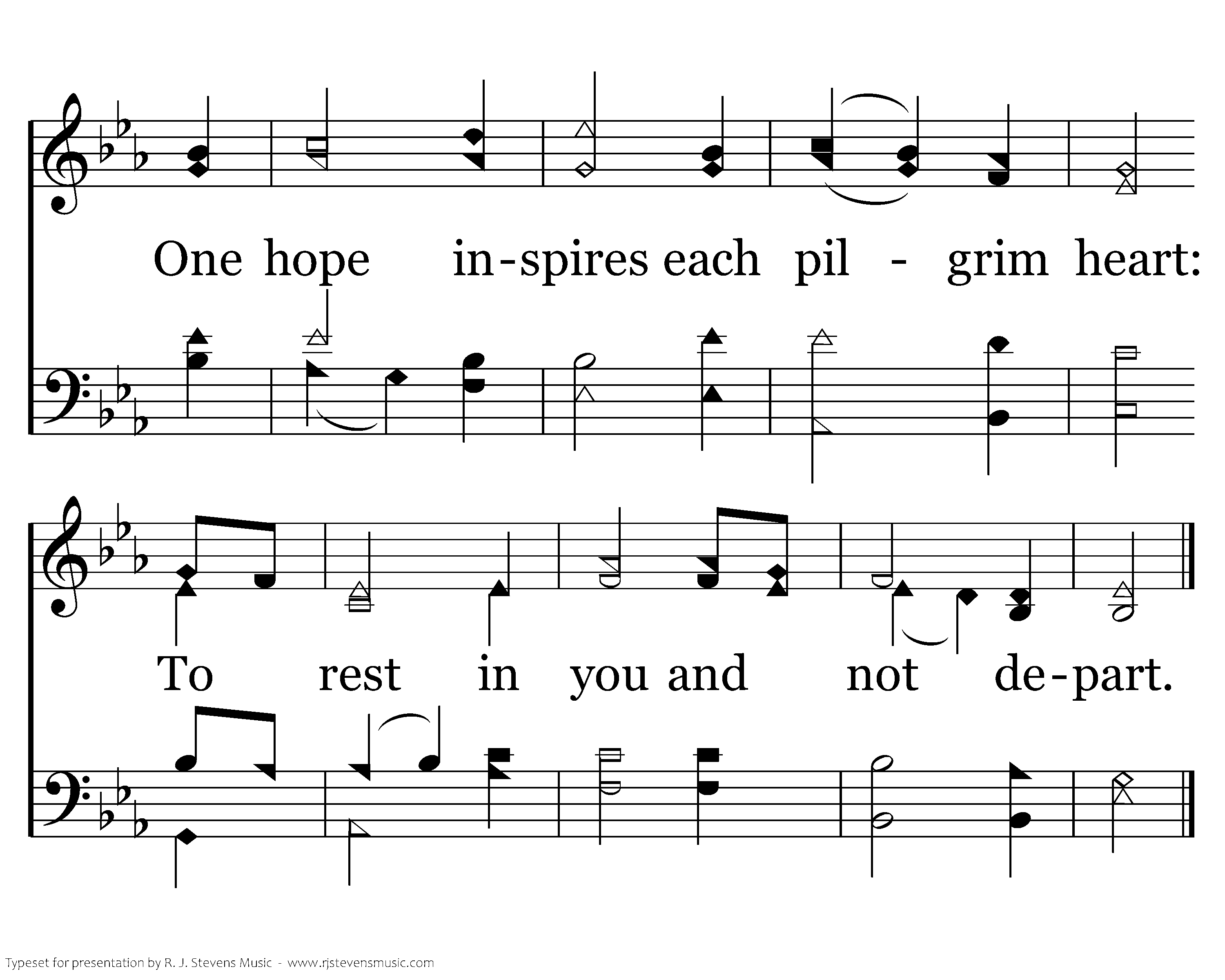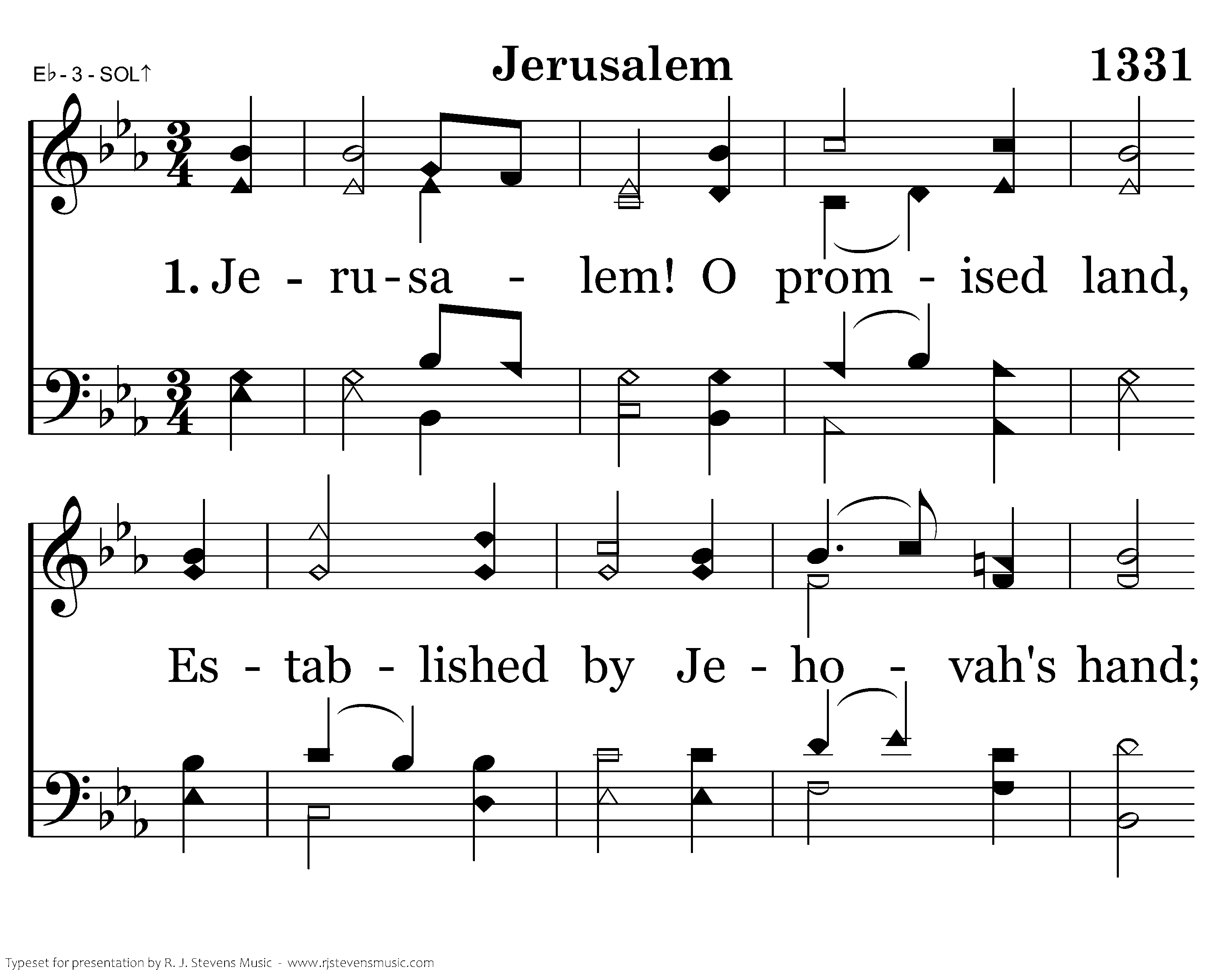 Jerusalem! O promised land, Established by Jehovah's hand; One hope inspires each pilgrim heart: To rest in you and not depart.