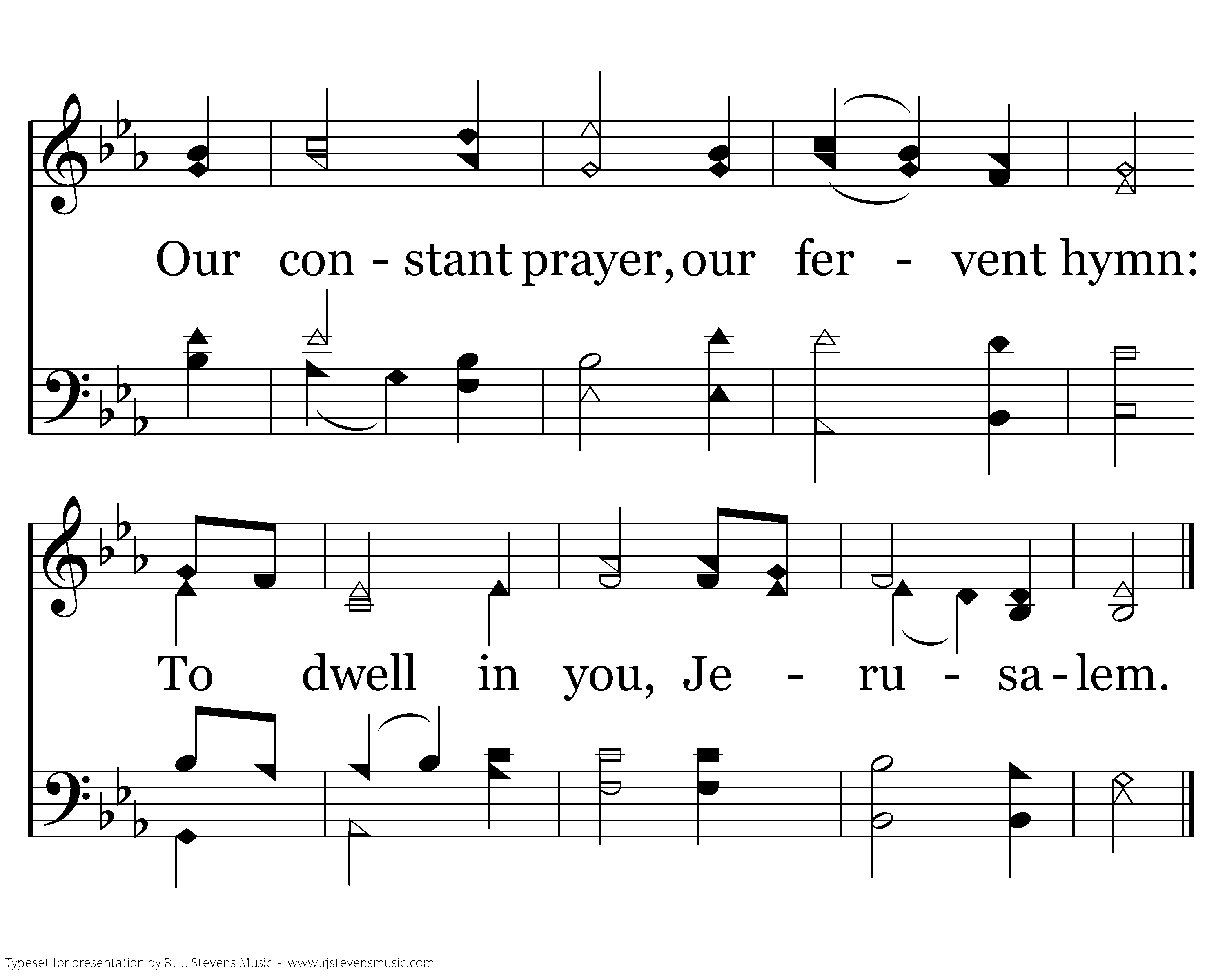 Jerusalem! Our longing waits To enter by your open gates; Our constant prayer, our fervent hymn: To dwell in you, Jerusalem.