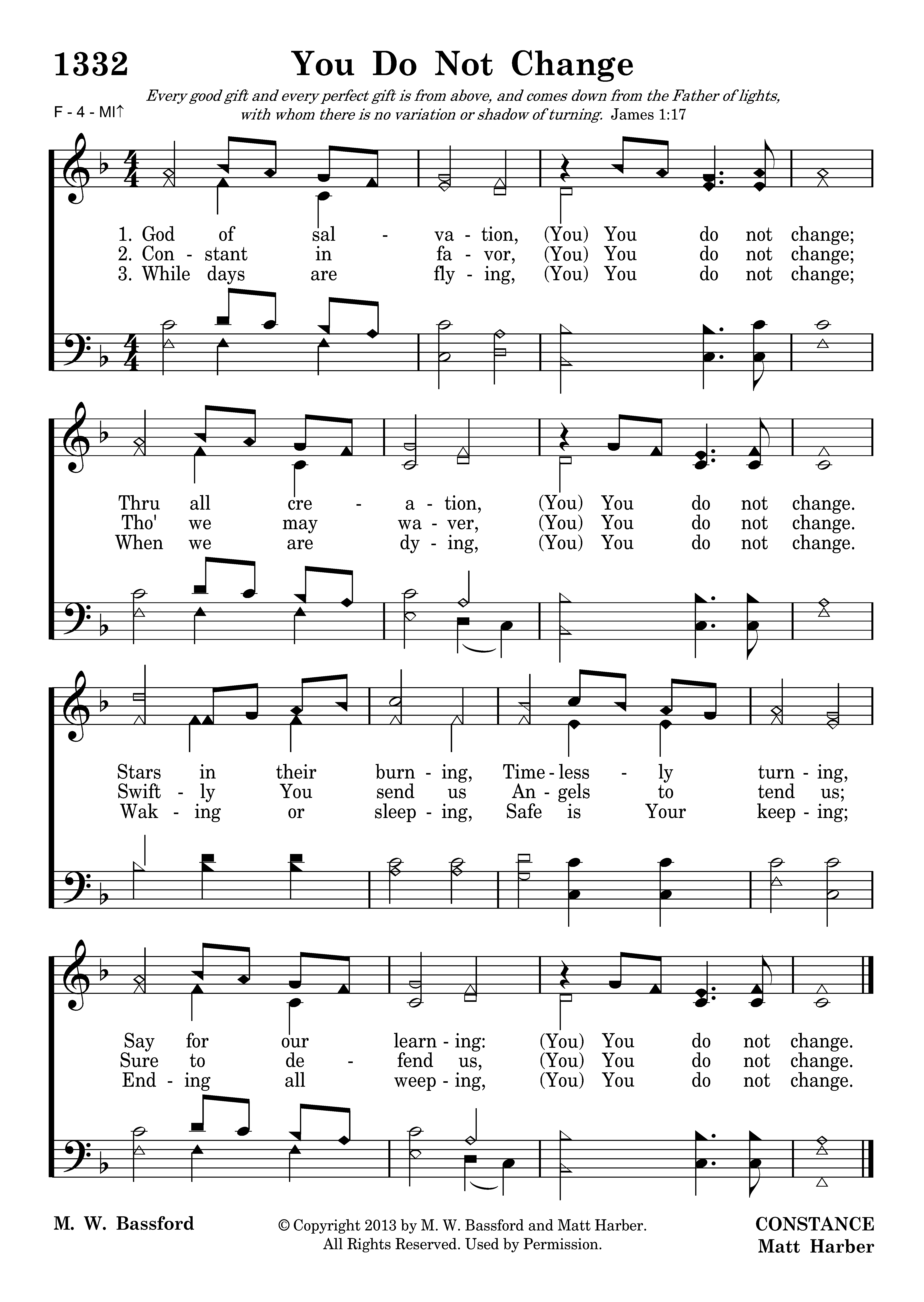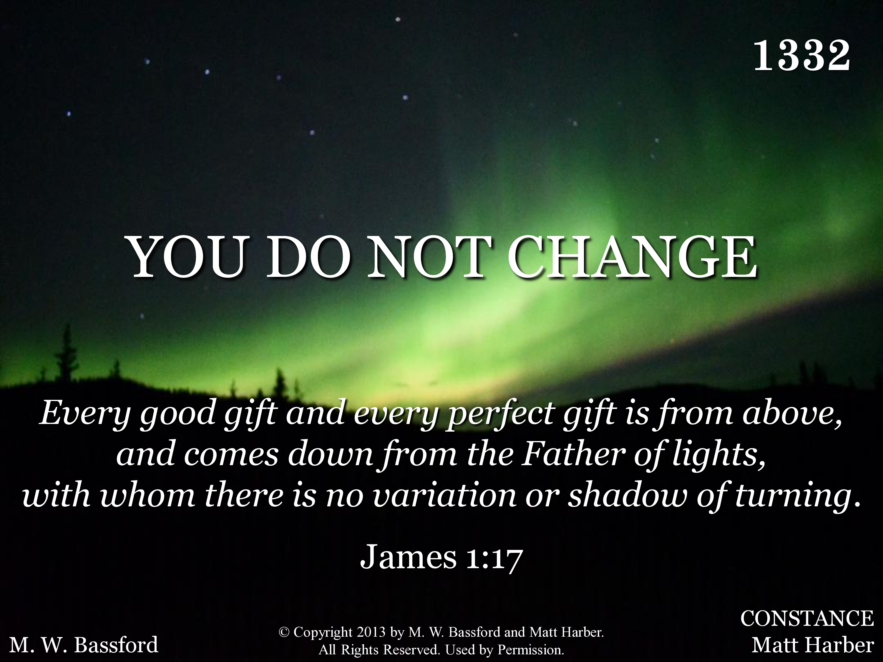 God of salvation, You do not change; Thru all creation, You do not change. Stars in their burning, Timelessly turning, Say for our learning: You do not change.