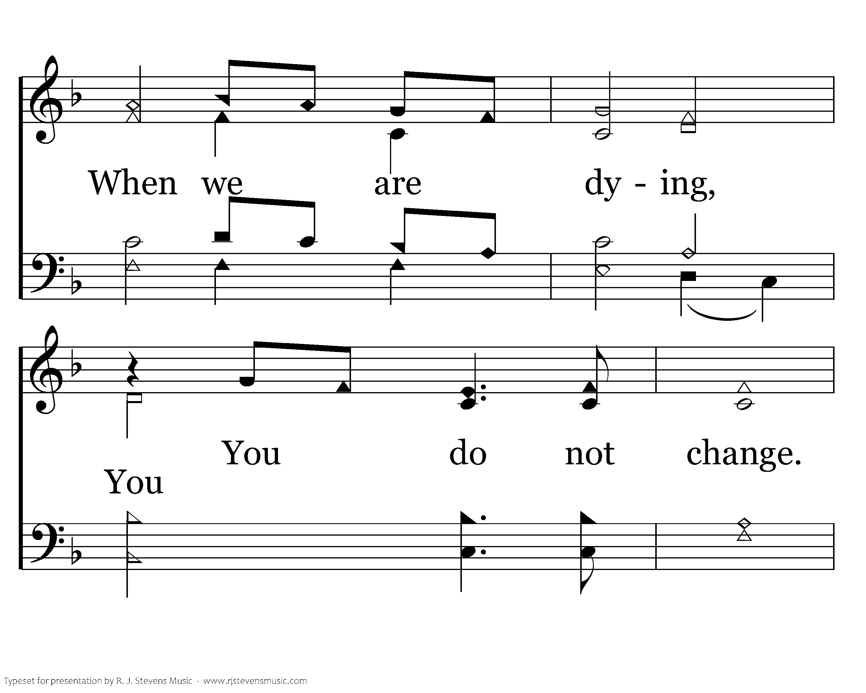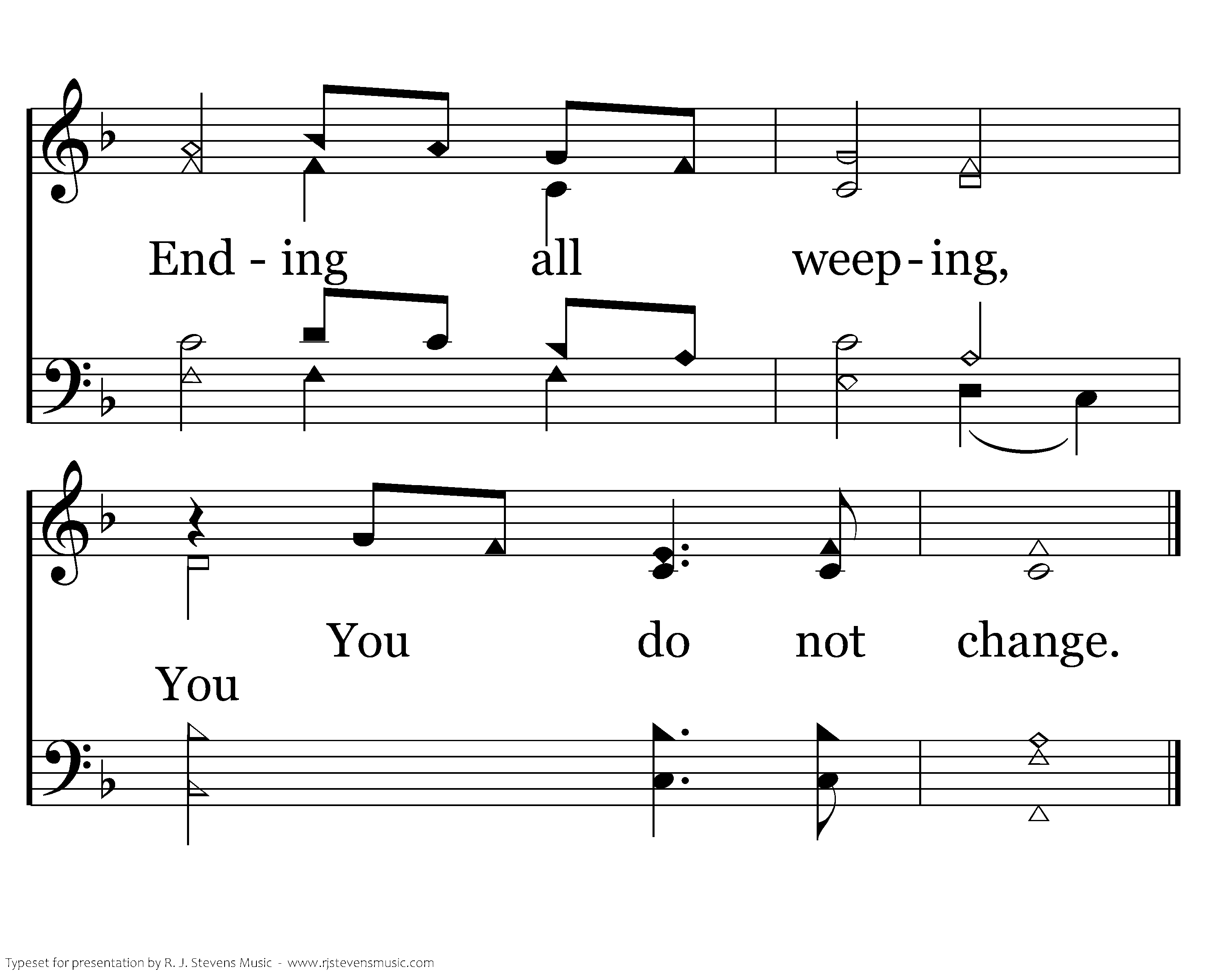 While days are flying, You do not change; When we are dying, You do not change. Waking or sleeping, Safe is Your keeping; Ending all weeping, You do not change.