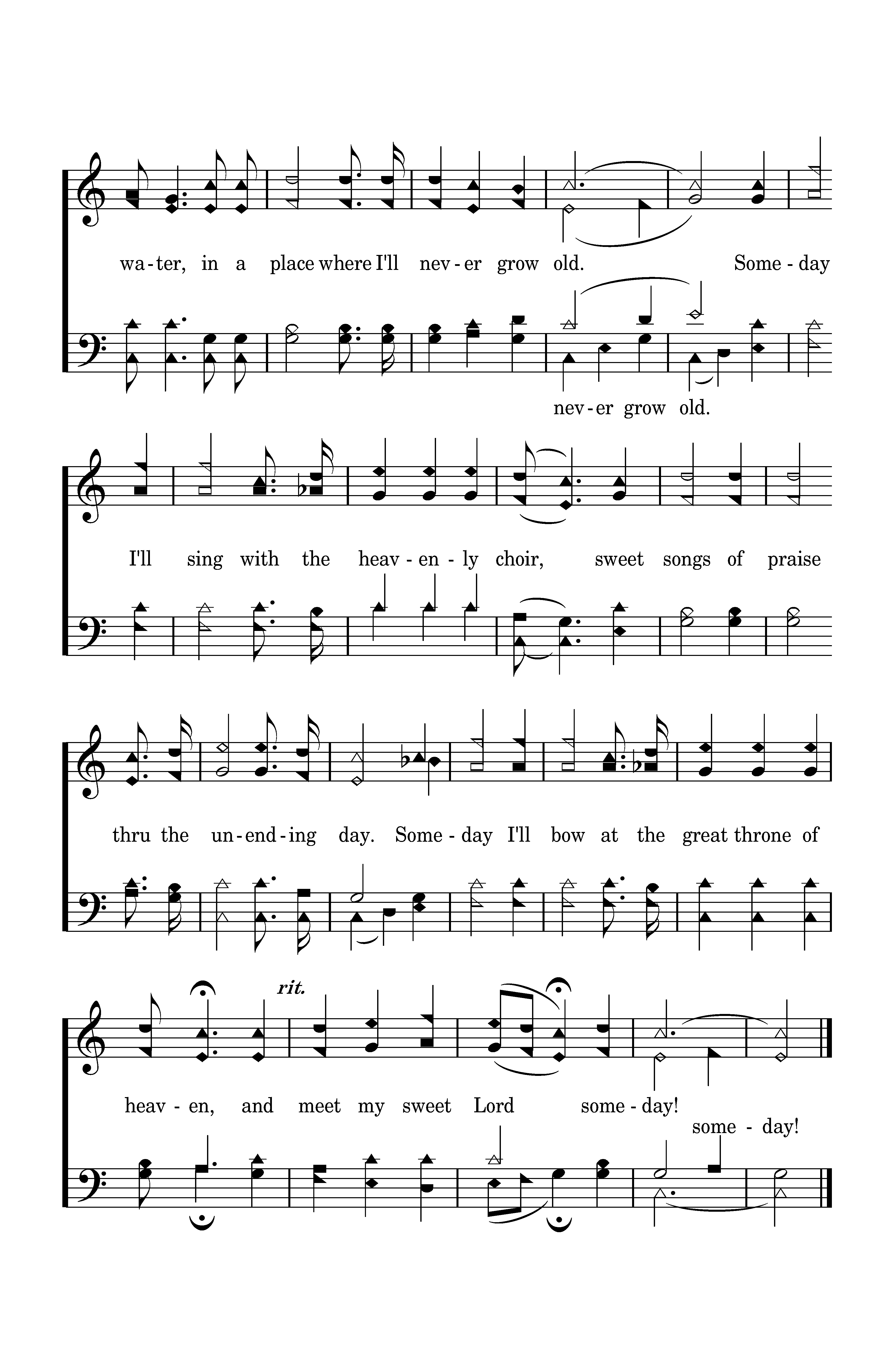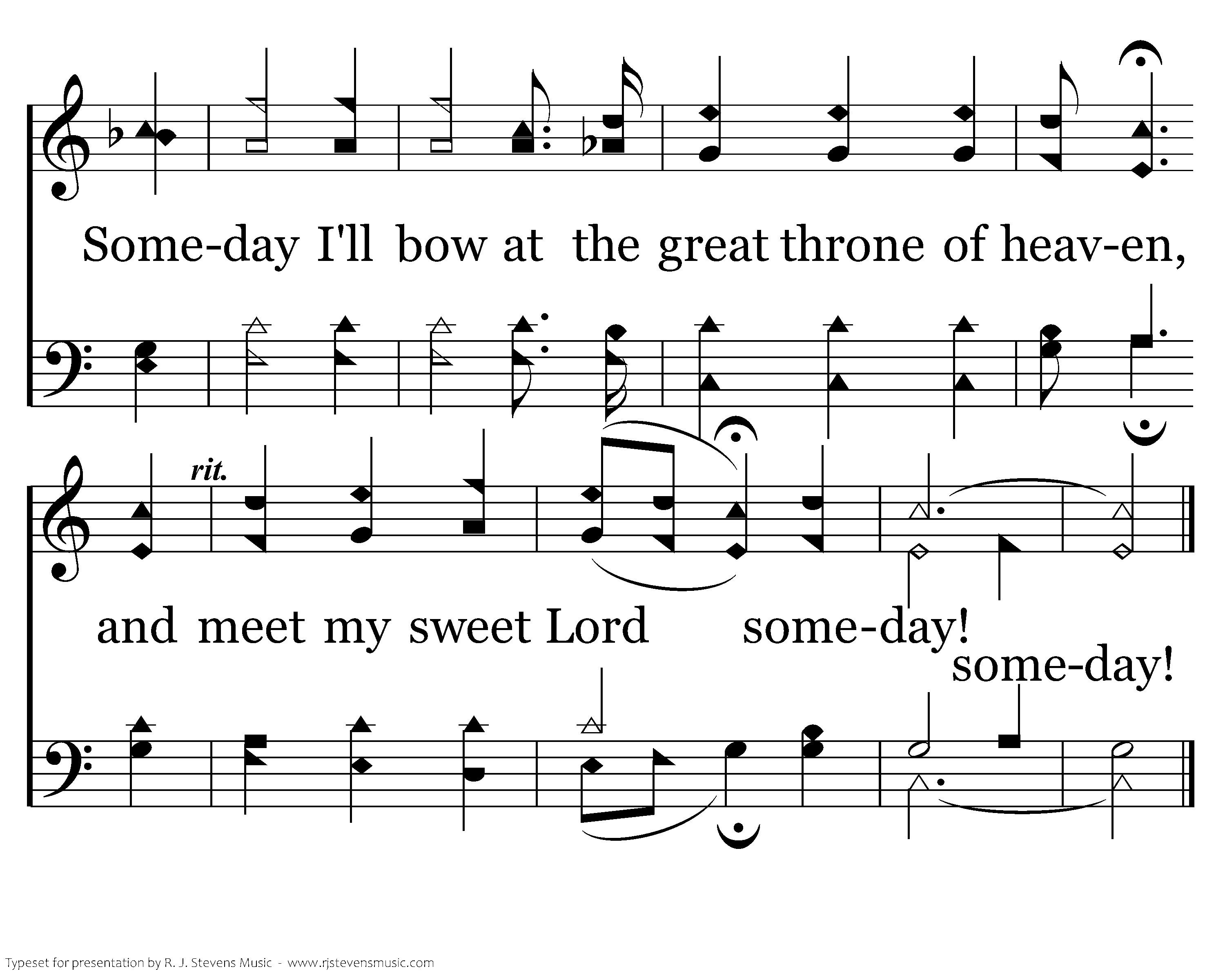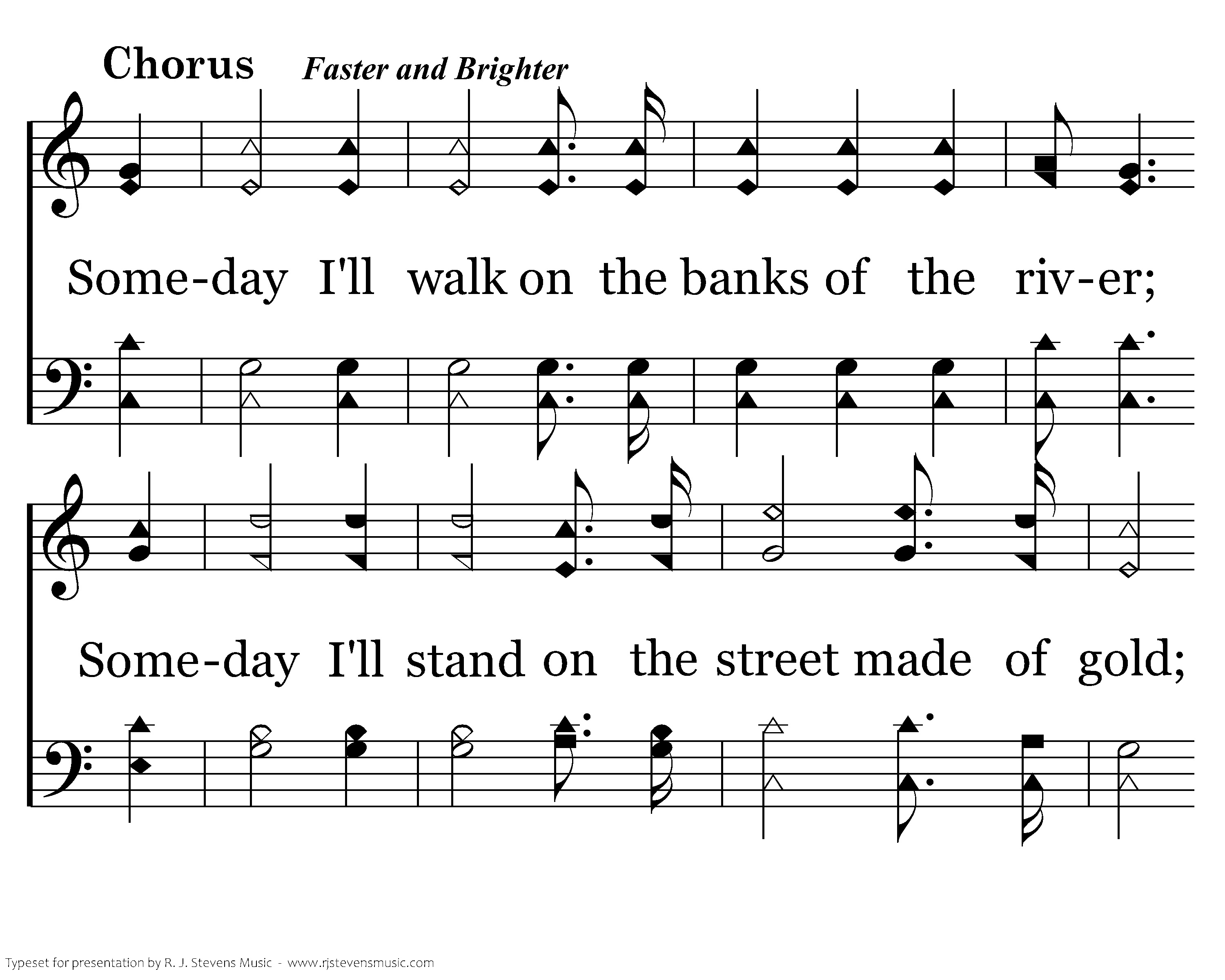 Someday I'll walk on the banks of the river; Someday I'll stand on the street made of gold; Someday I'll drink of the cool living water, in a place where I'll never grow old. Someday I'll sing with the heavenly chorus, sweet songs of praise thru the unending day. Someday I'll bow at the great throne of heaven, and meet my sweet Lord someday!