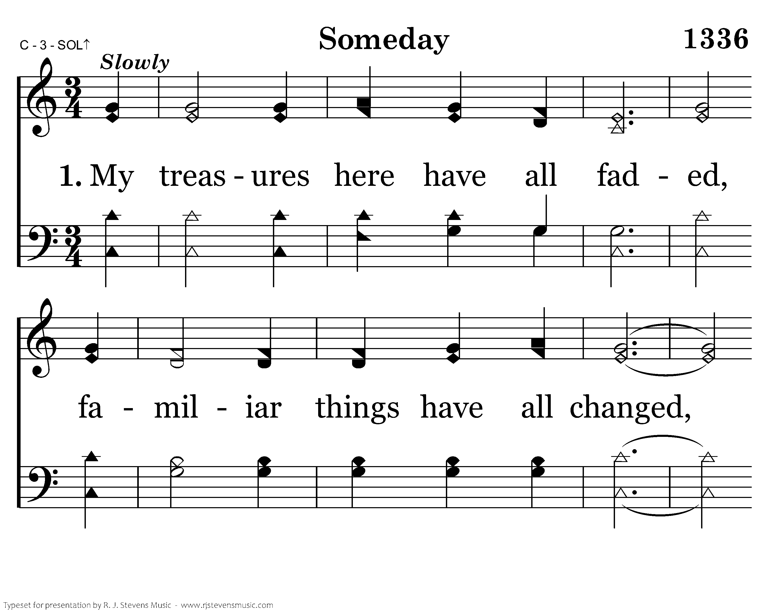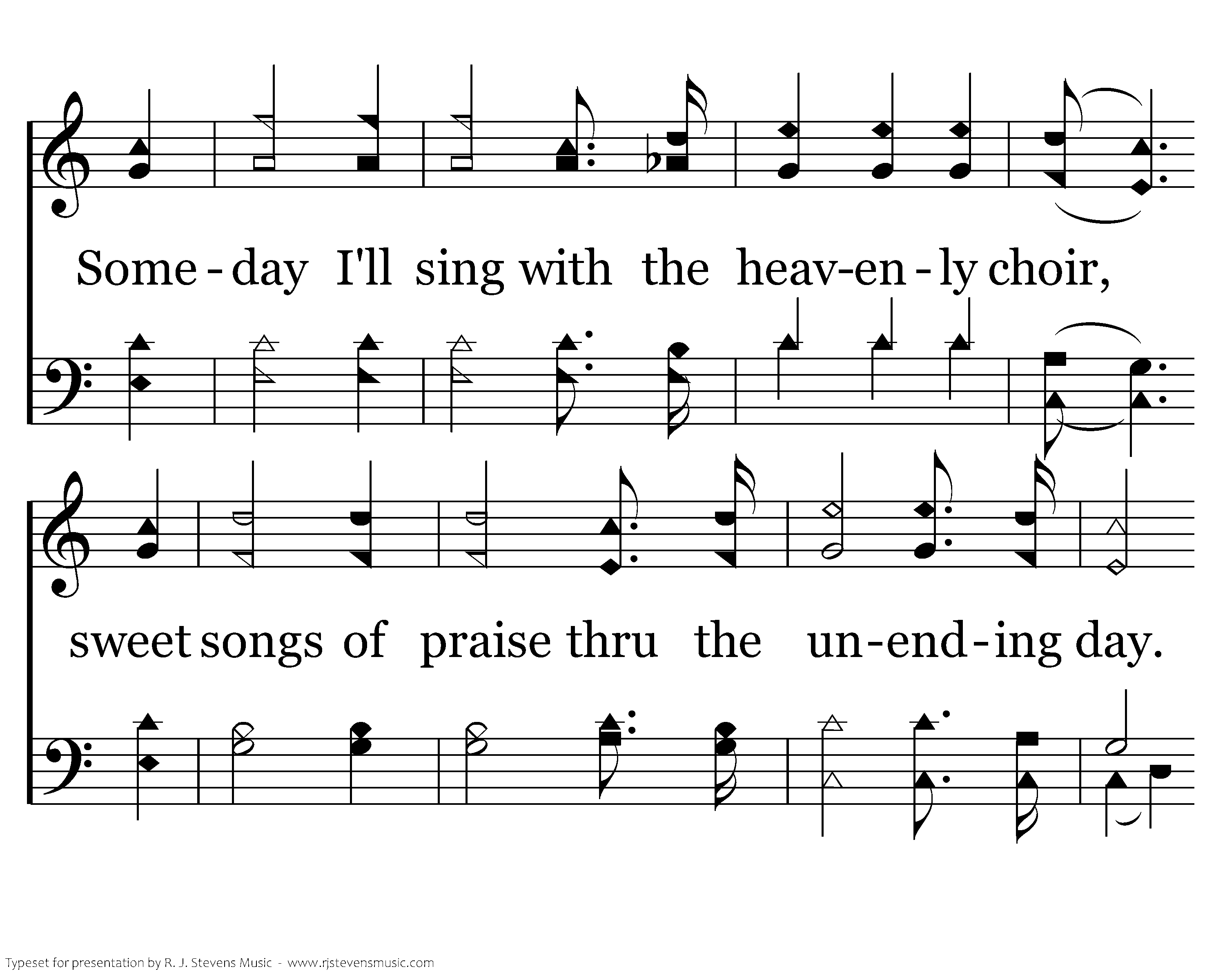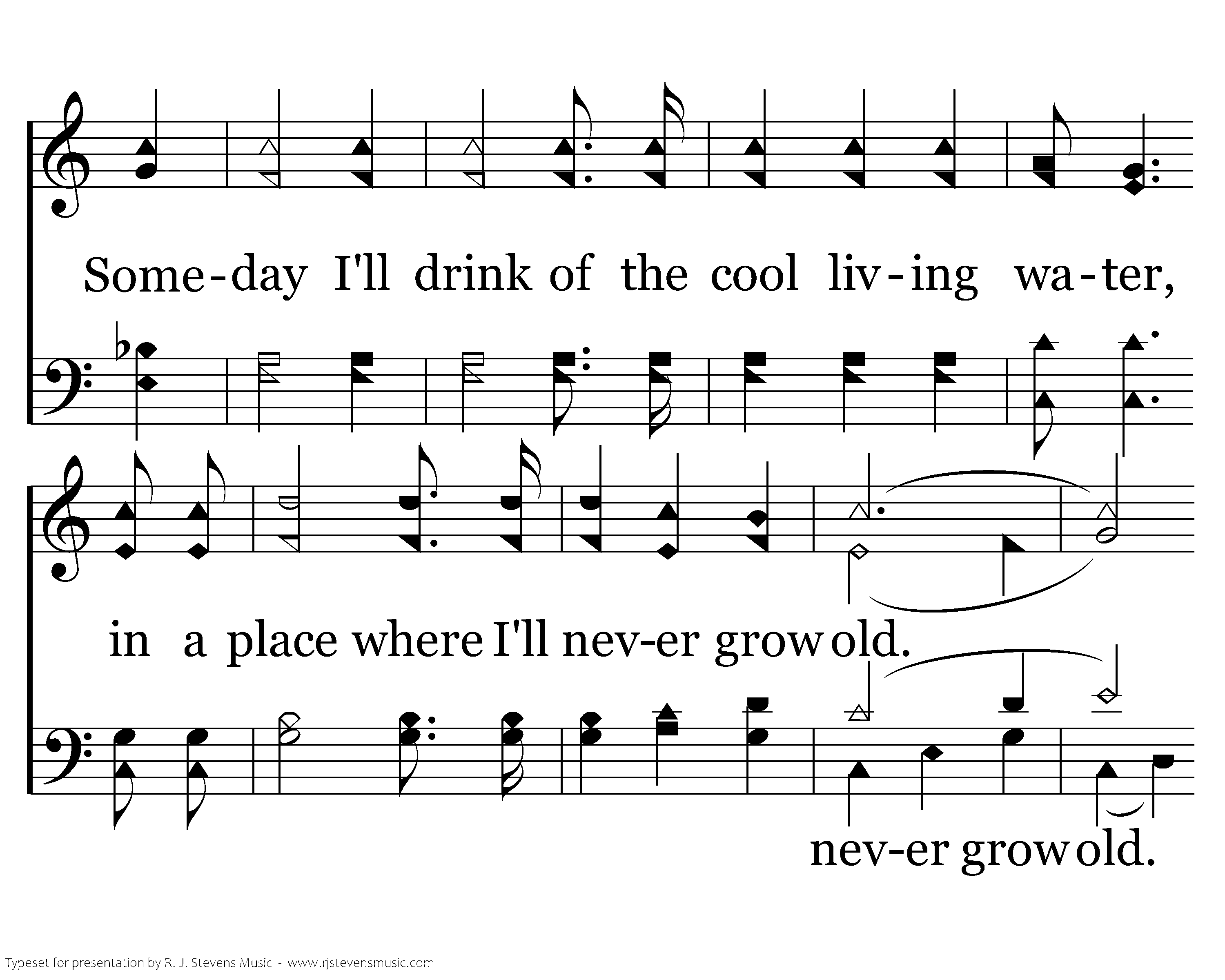 Someday I'll walk on the banks of the river; Someday I'll stand on the street made of gold; Someday I'll drink of the cool living water, in a place where I'll never grow old. Someday I'll sing with the heavenly chorus, sweet songs of praise thru the unending day. Someday I'll bow at the great throne of heaven, and meet my sweet Lord someday!
