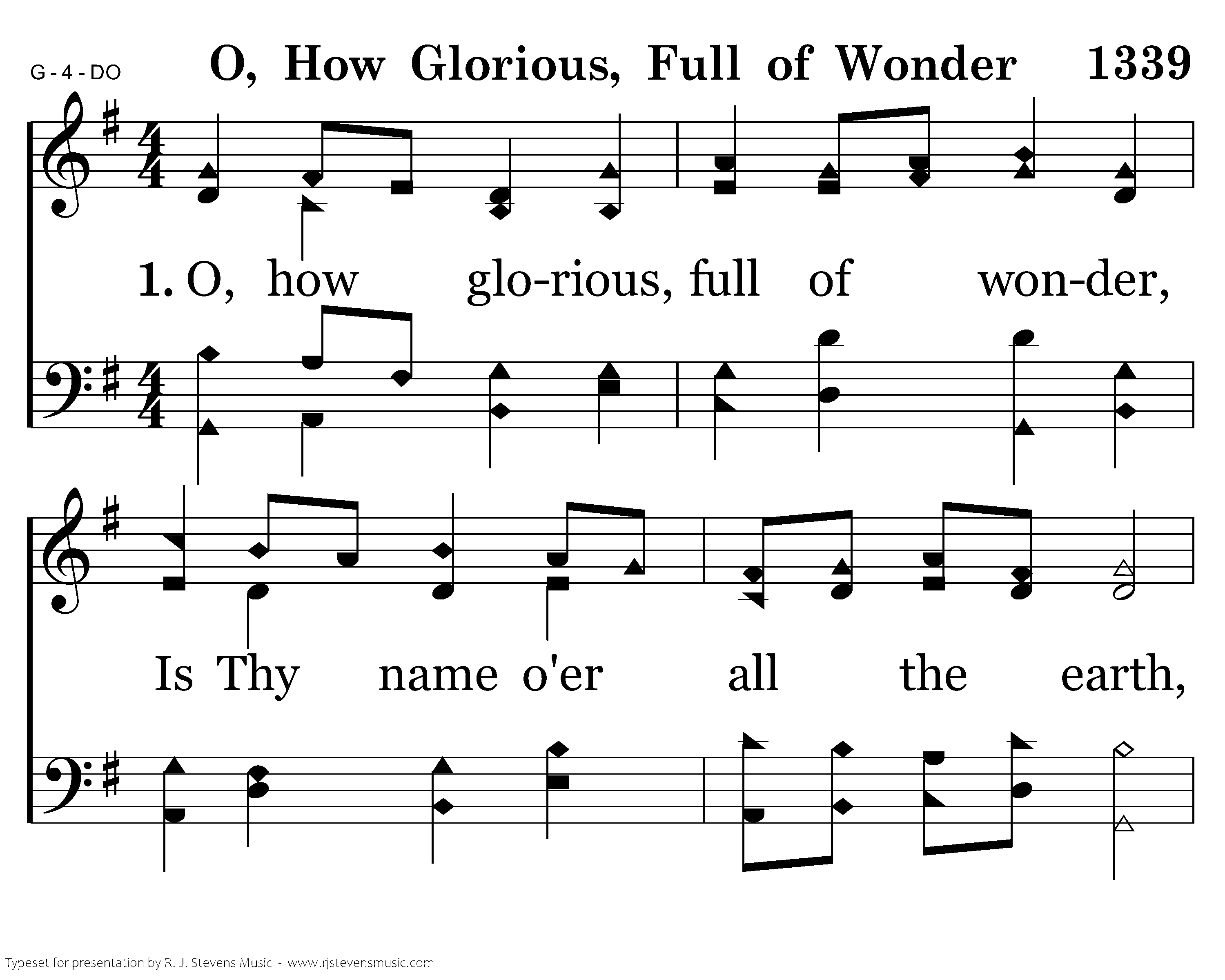O, how glorious, full of wonder, Is Thy name o'er all the earth, Thou, who wrought creation's splendor, Bringing suns and stars to birth! Rapt in rev'rence, we adore Thee, Marv'ling at Thy mystic ways. Humbly now we bow before Thee, Lifting up our hearts in praise.