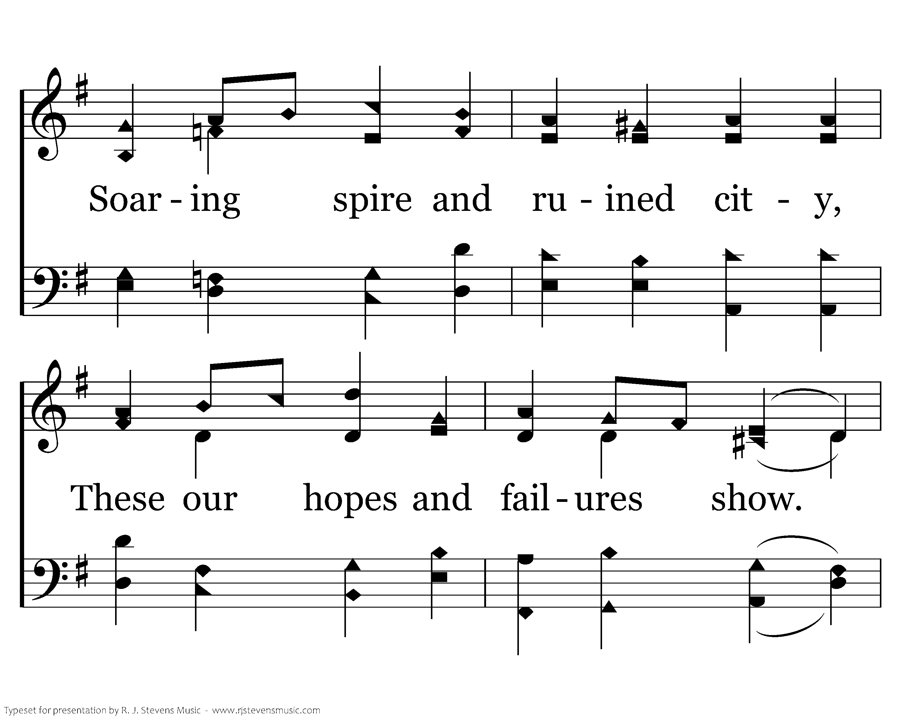 Thou hast given man dominion O'er the wonders of Thy hand, Made him fly with eagle pinion, Master over sea and land. Soaring spire and ruined city, These our hopes and failures show. Teach us more of human pity, That we in Thine image grow.