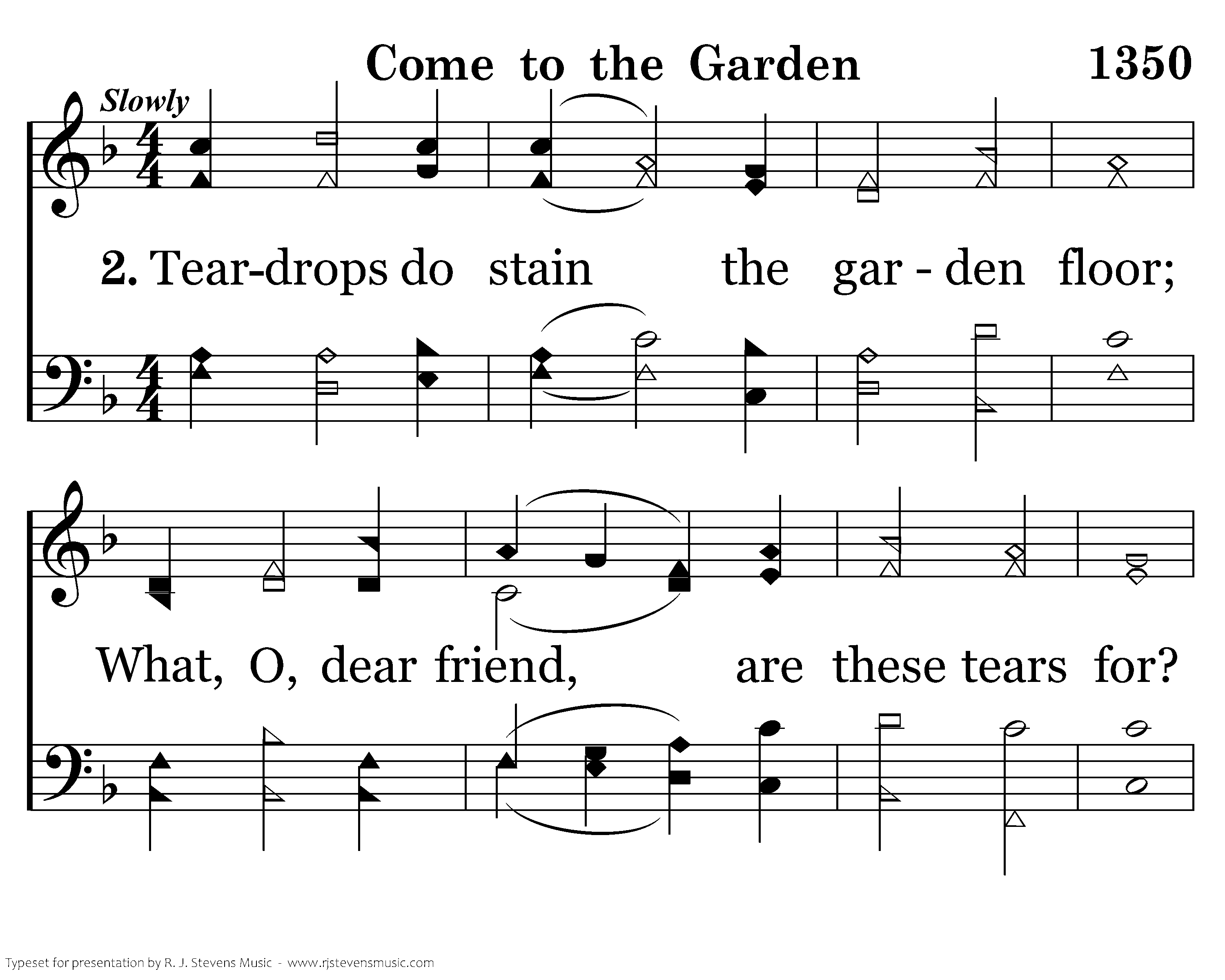 Come to the garden, O, come with me; Come there to see what we might see; Jesus, the Lord, was there, you know. There's where He went to pray alone.