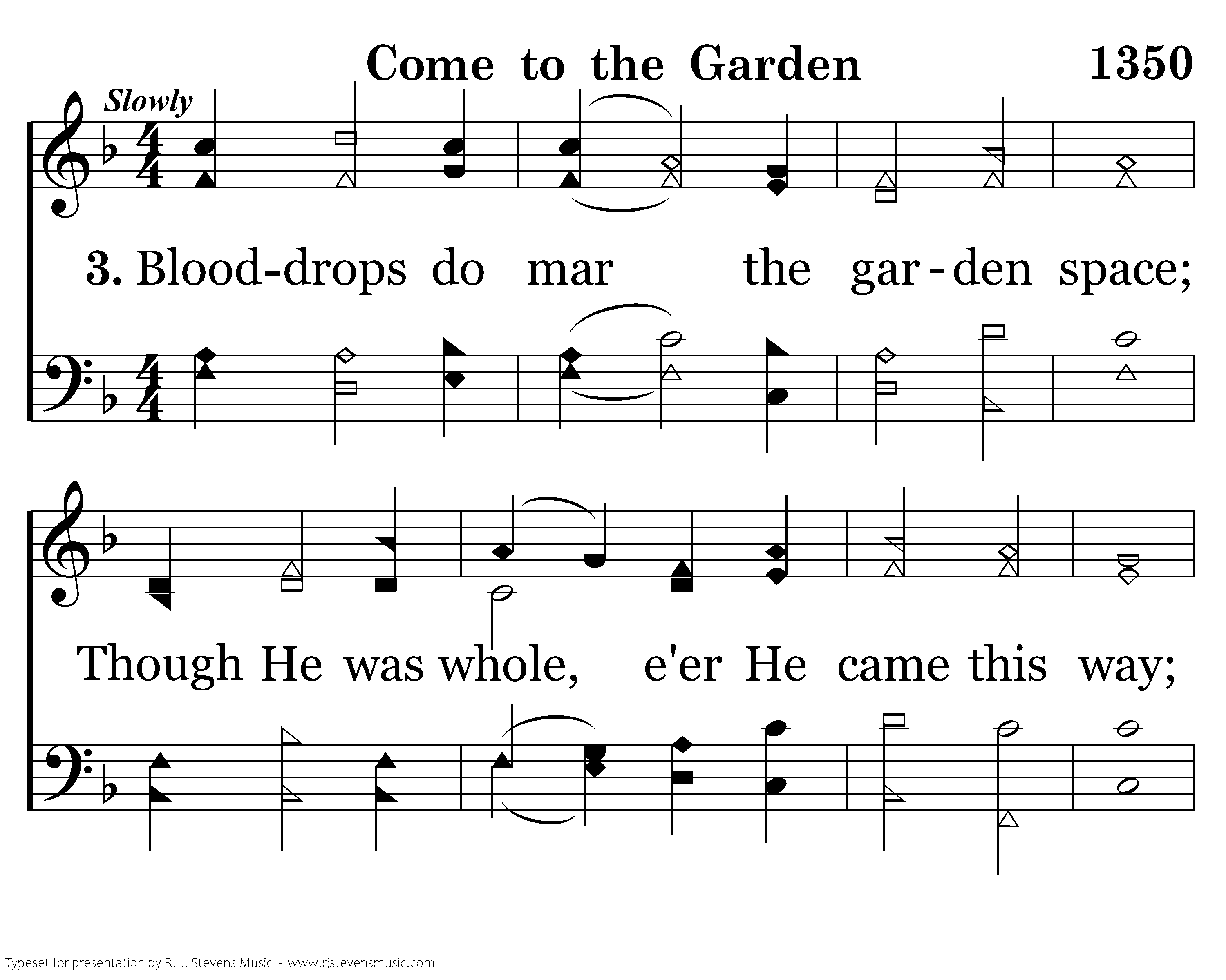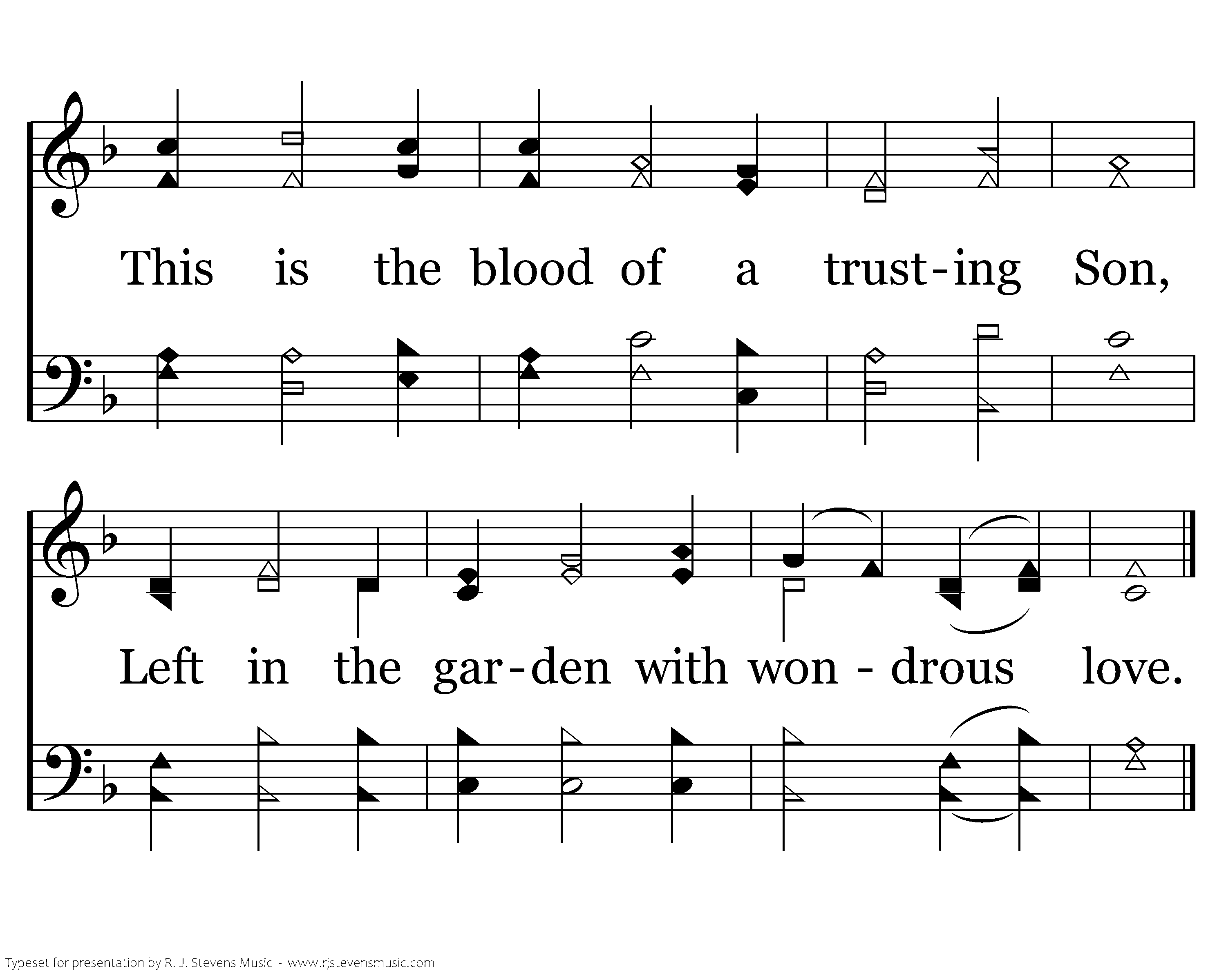 Blooddrops do mar the garden space; Though He was whole, e'er He came this way; This is the blood of a trusting Son, Left in the garden with wondrous love.