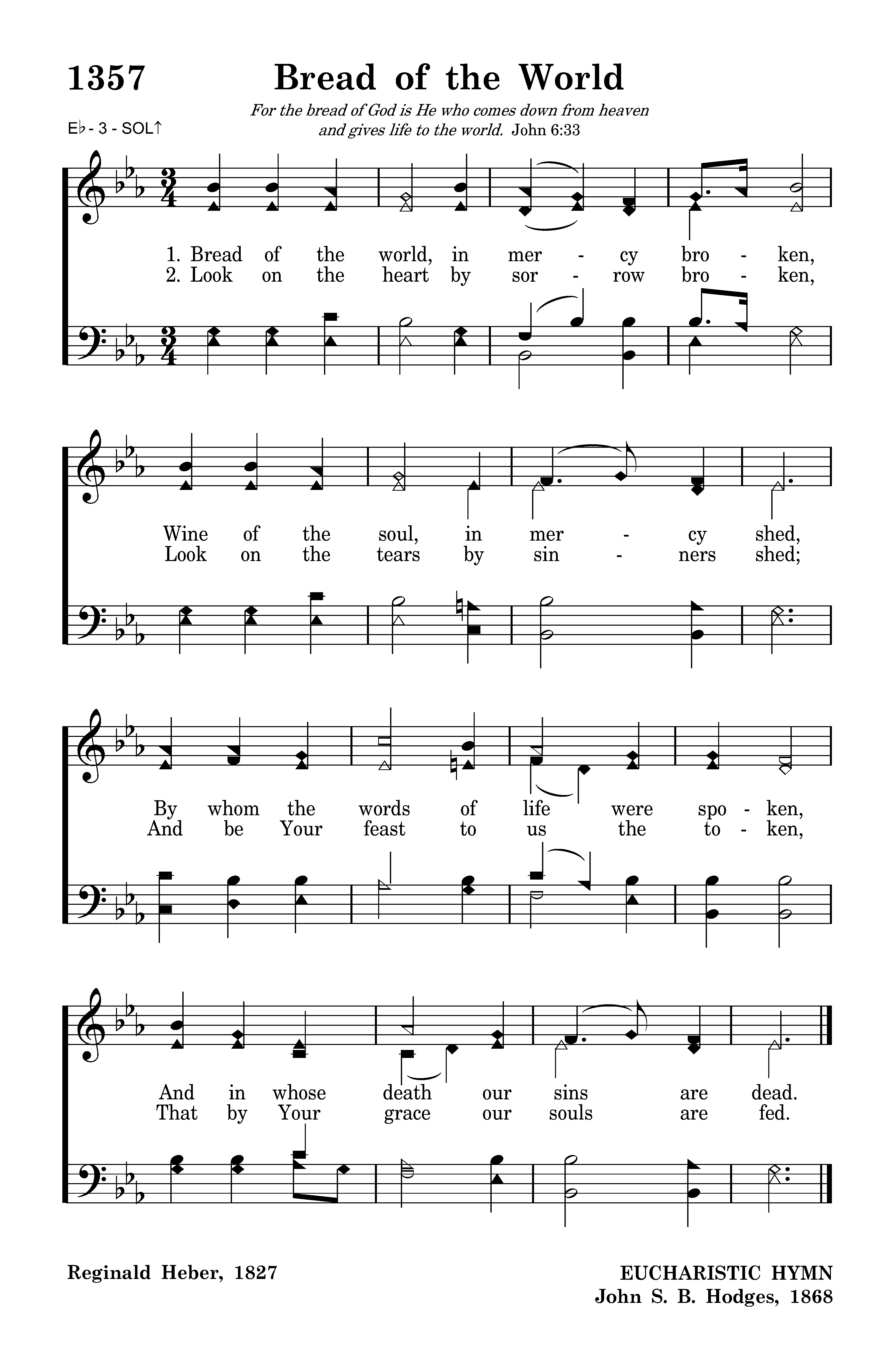 Bread of the world, in mercy broken, Wine of the soul, in mercy shed, By whom the words of life were spoken, And in whose death our sins are dead.