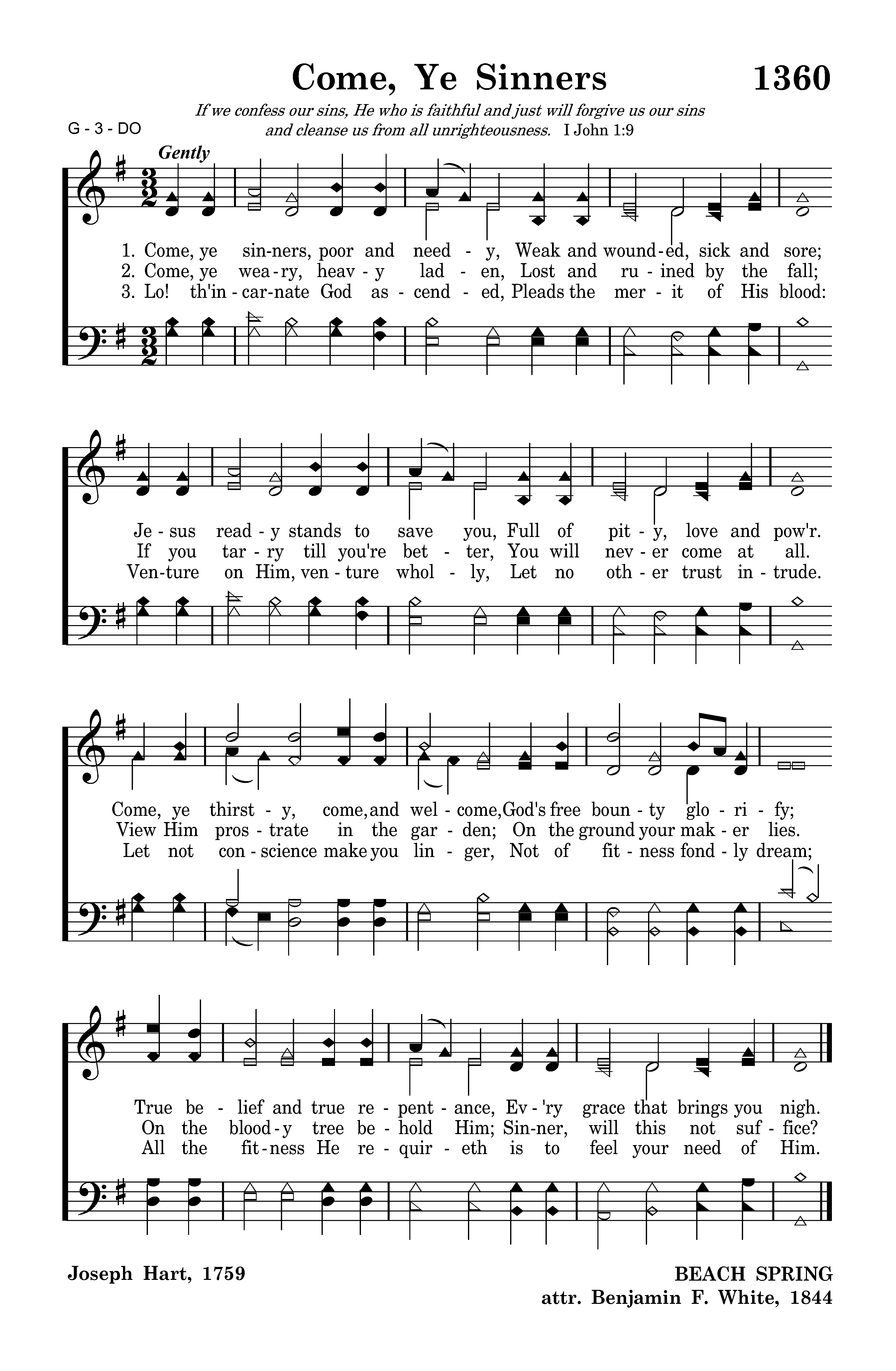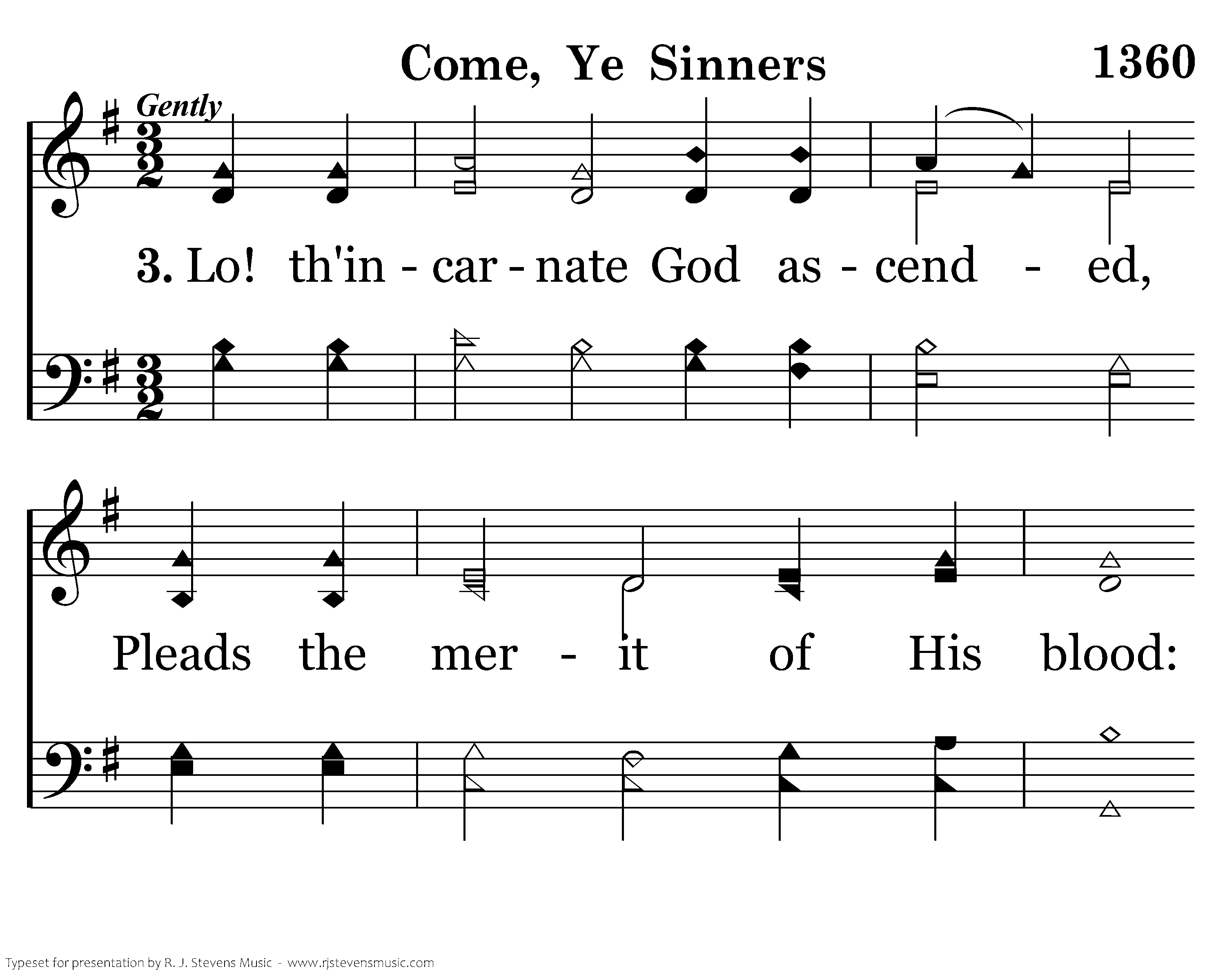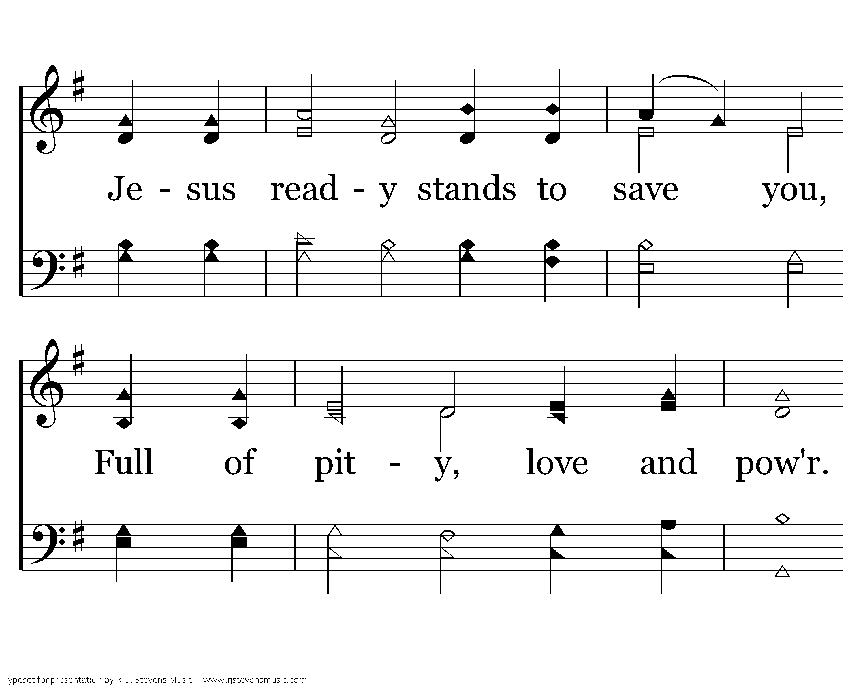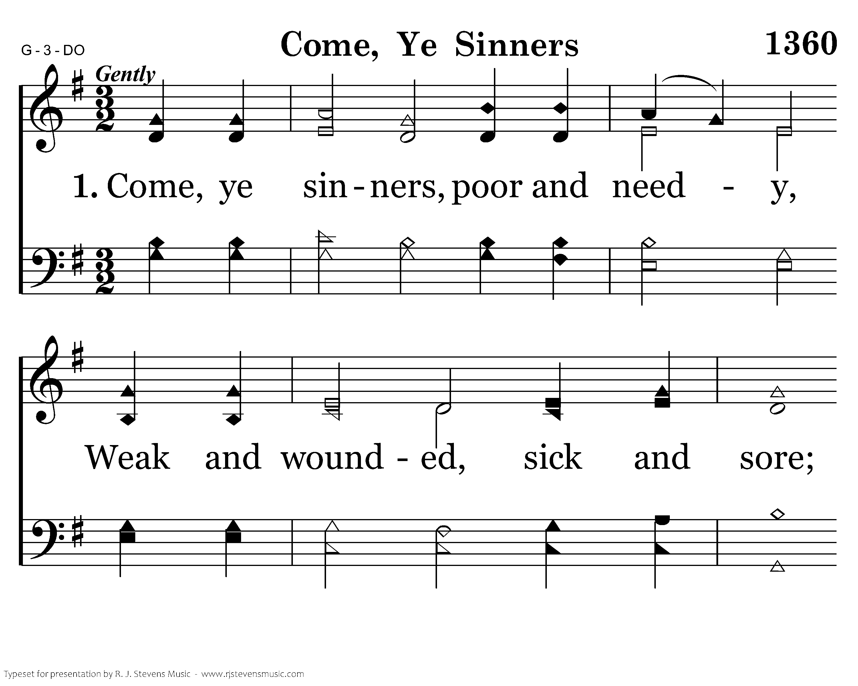 Come, ye sinners, poor and needy, Weak and wounded, sick and sore; Jesus ready stands to save you, Full of pity, love and pow'r. Come, ye thirsty, come, and welcome, God's free bounty glorify; True belief and true repentance, Ev'ry grace that brings you nigh.