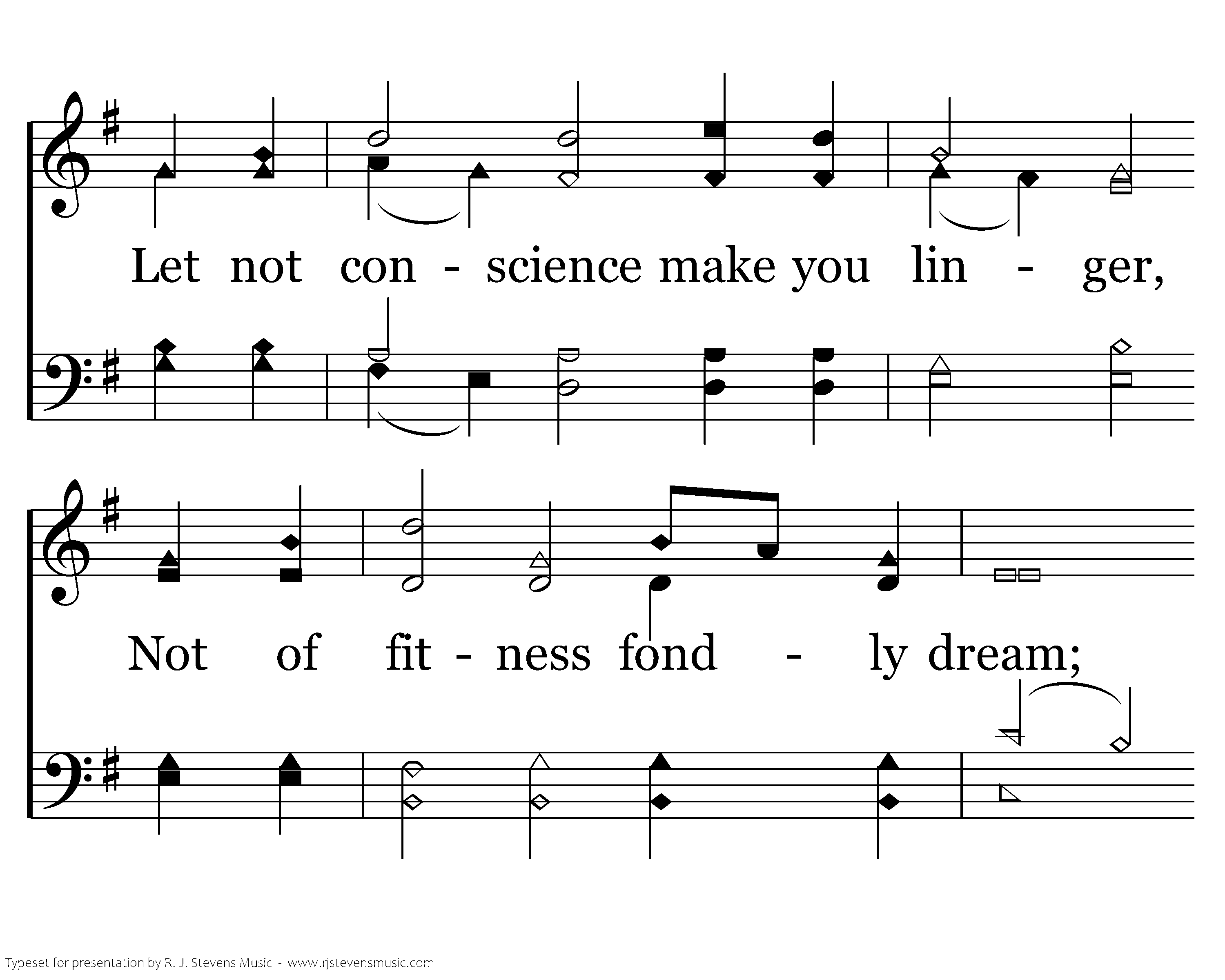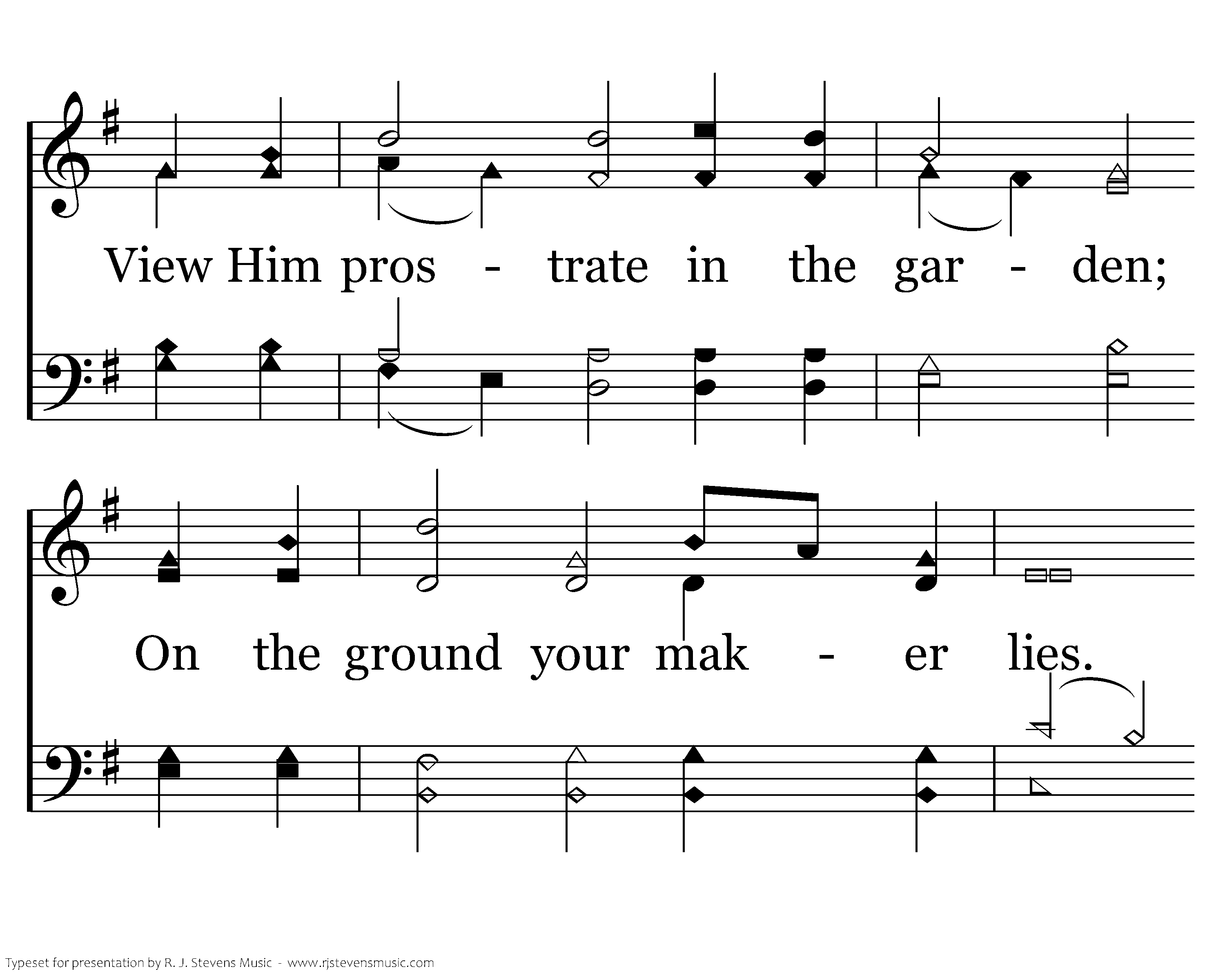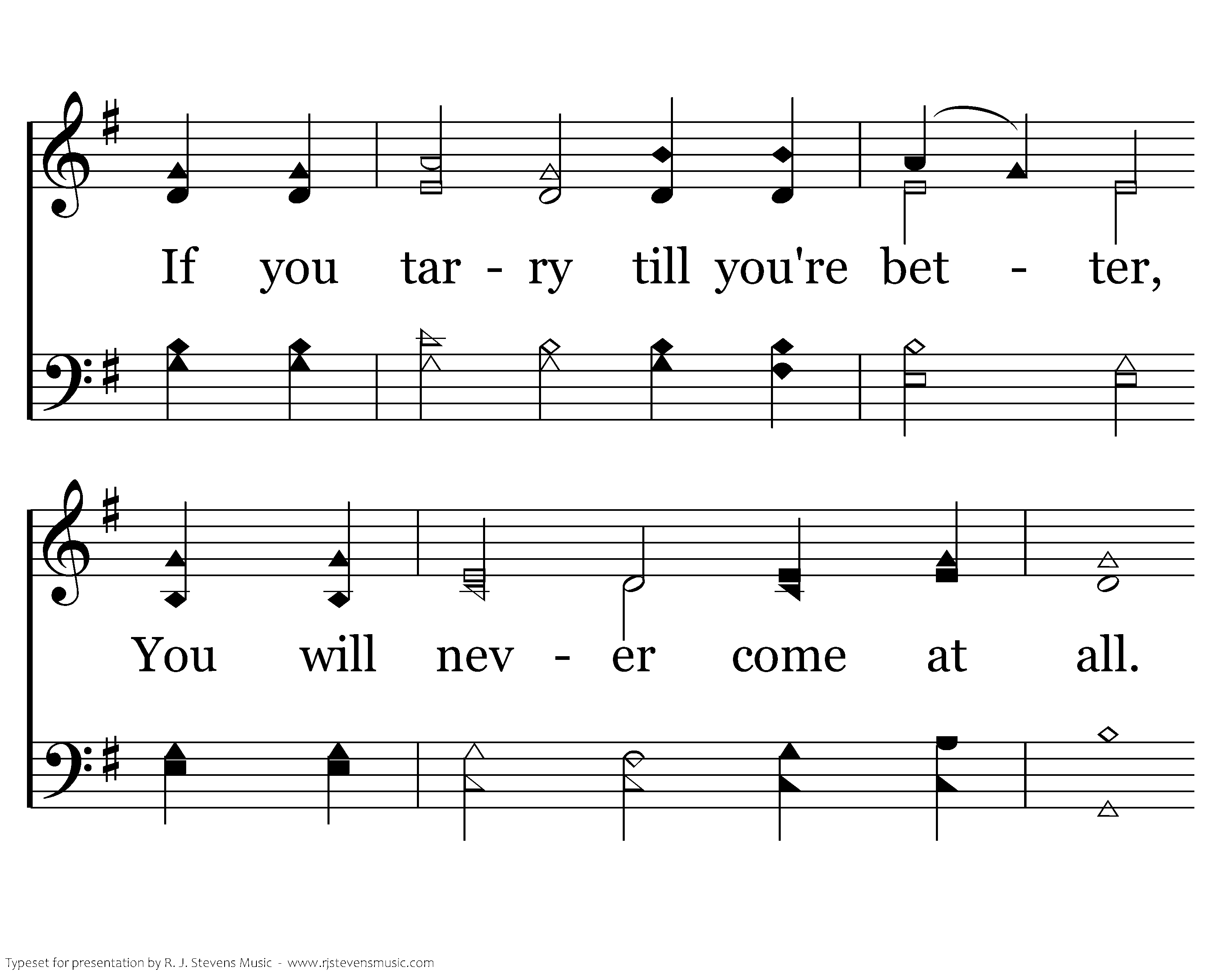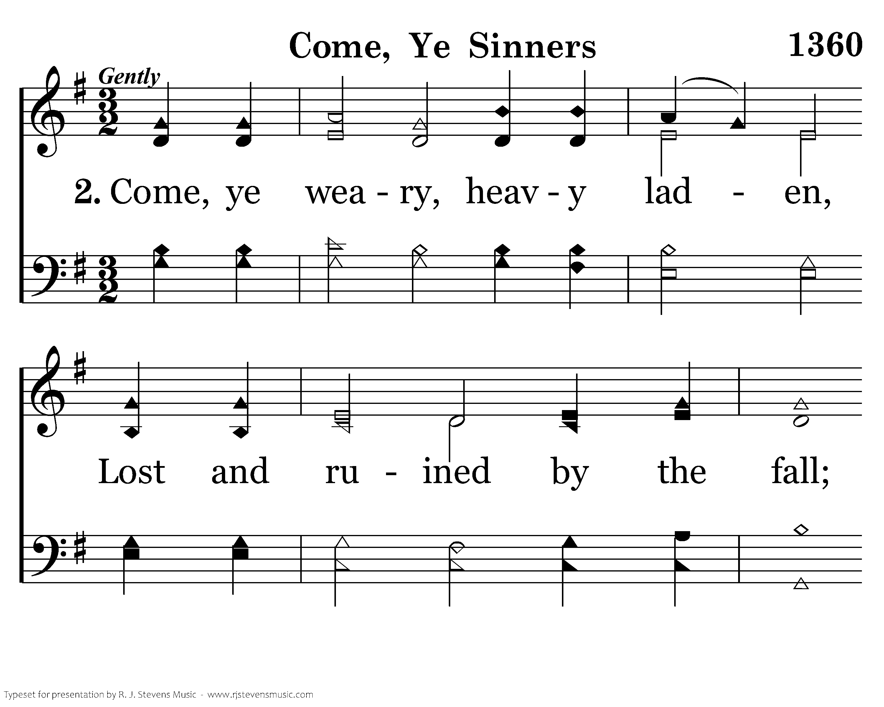 Come, ye weary, heavy laden, Lost and ruined by the fall; If you tarry till you're better, You will never come at all. View Him prostrate in the garden; On the ground your maker lies. On the bloody tree behold Him; Sinner, will this not suffice?