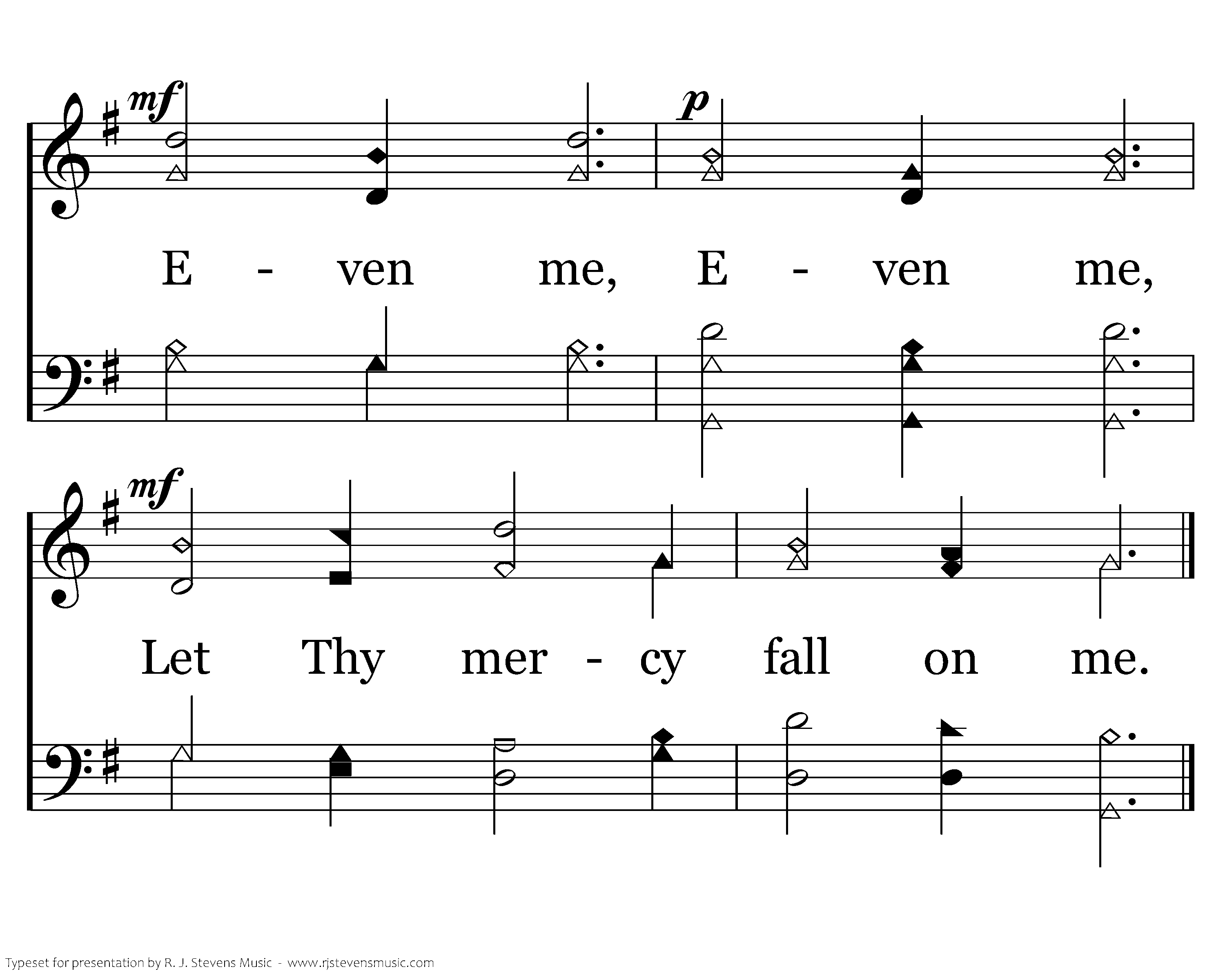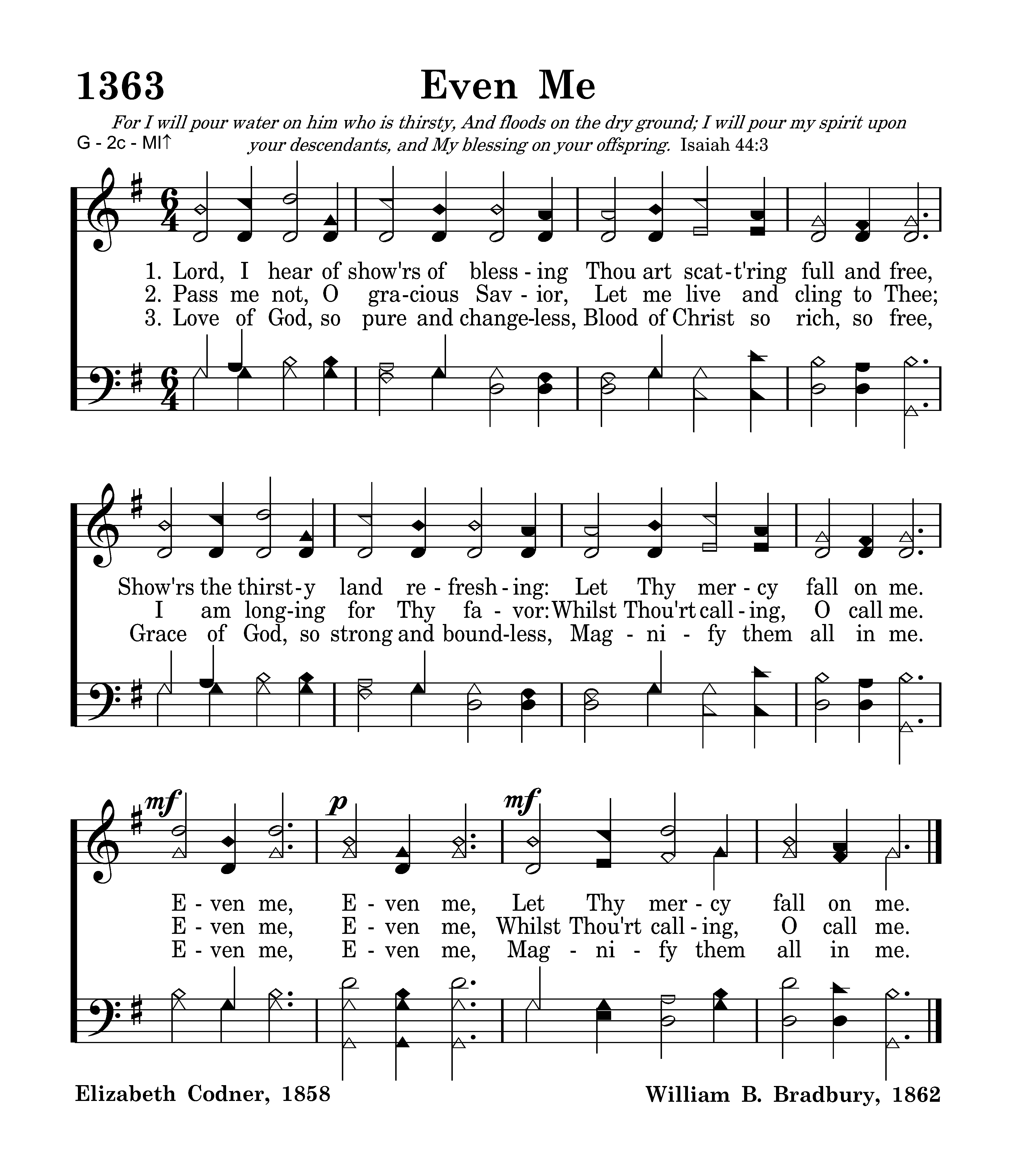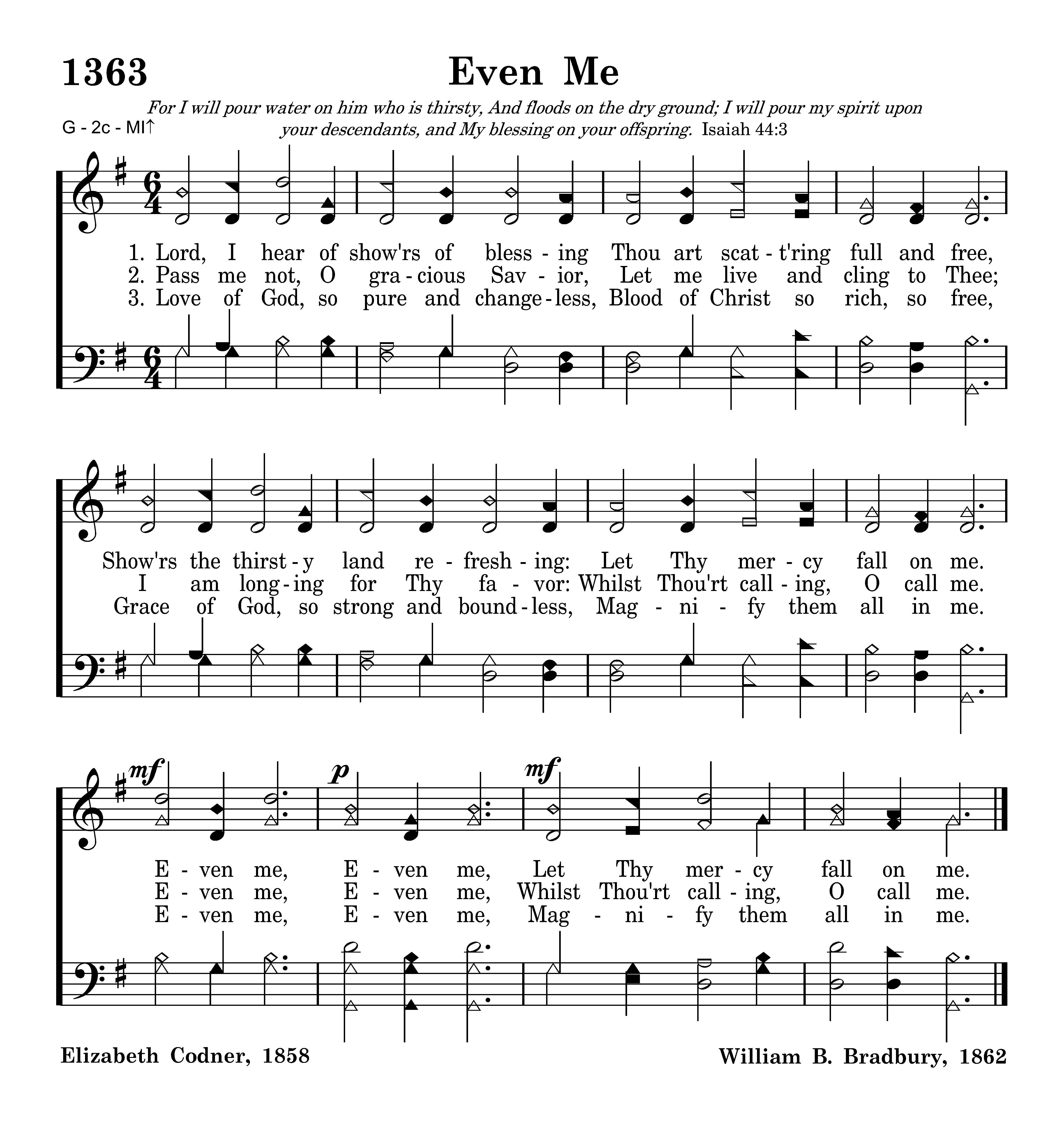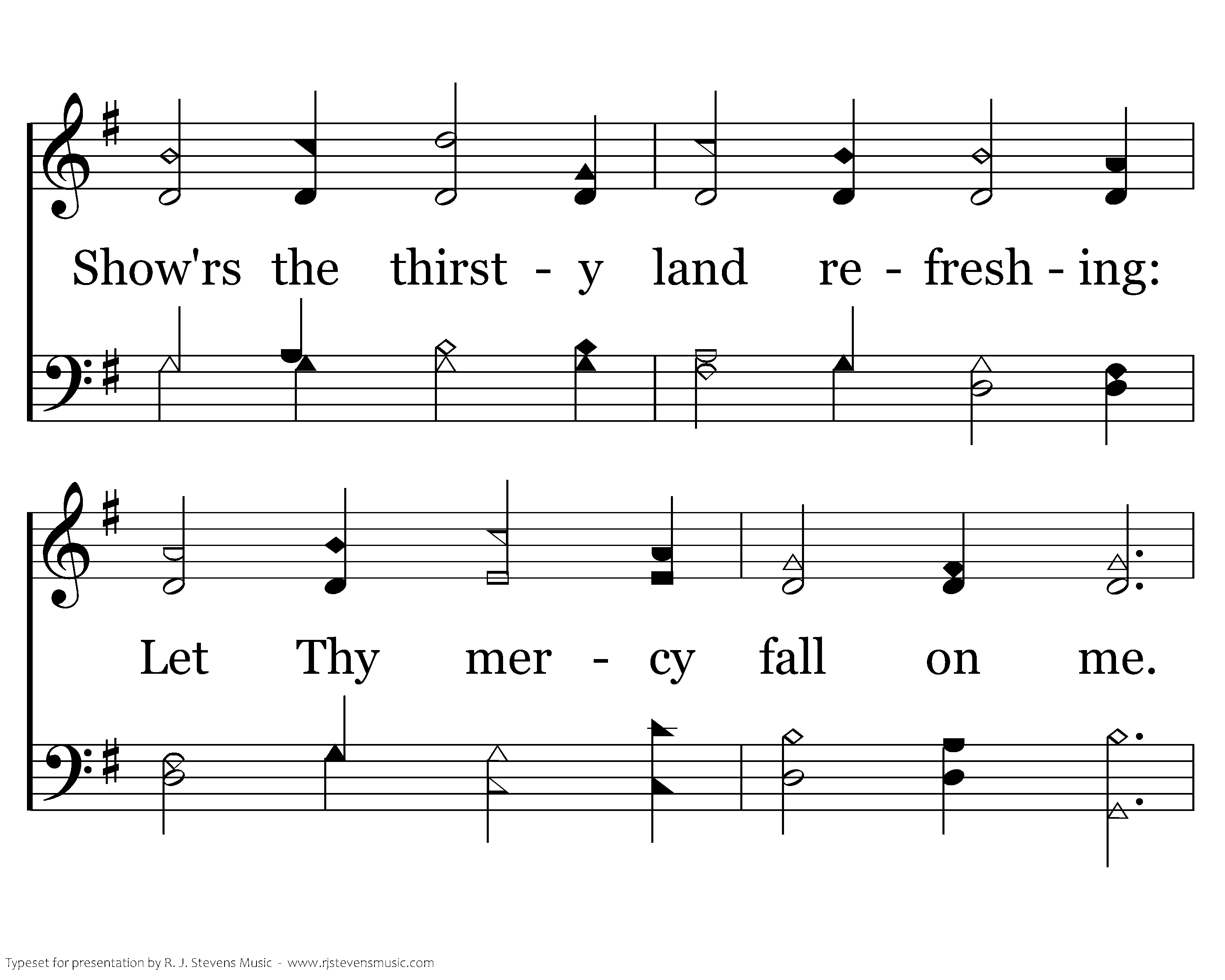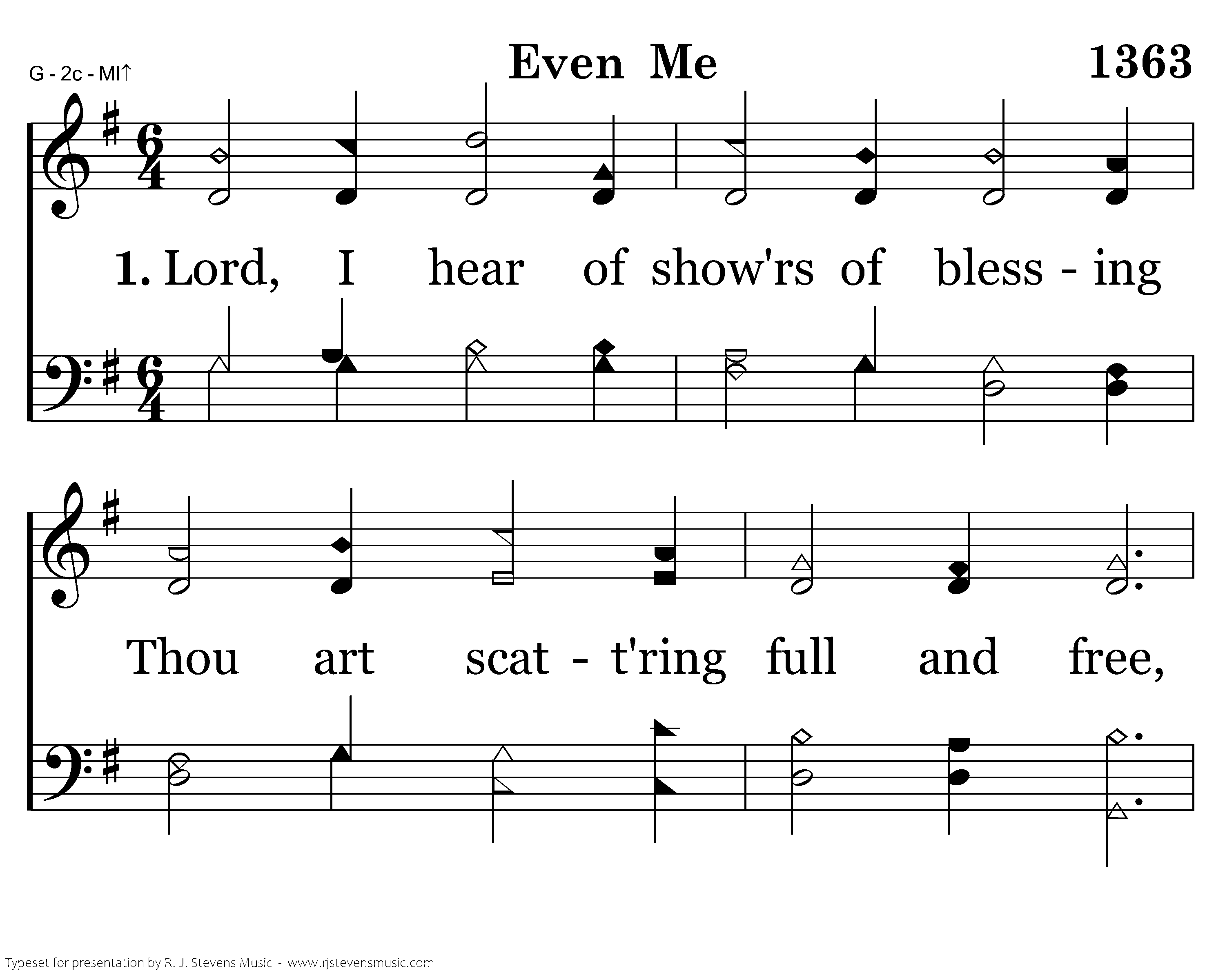 Lord, I hear of show'rs of blessing Thou art scatt'ring full and free, Show'rs the thirsty land refreshing: Let Thy mercy fall on me. Even me, Even me, Let Thy mercy fall on me.