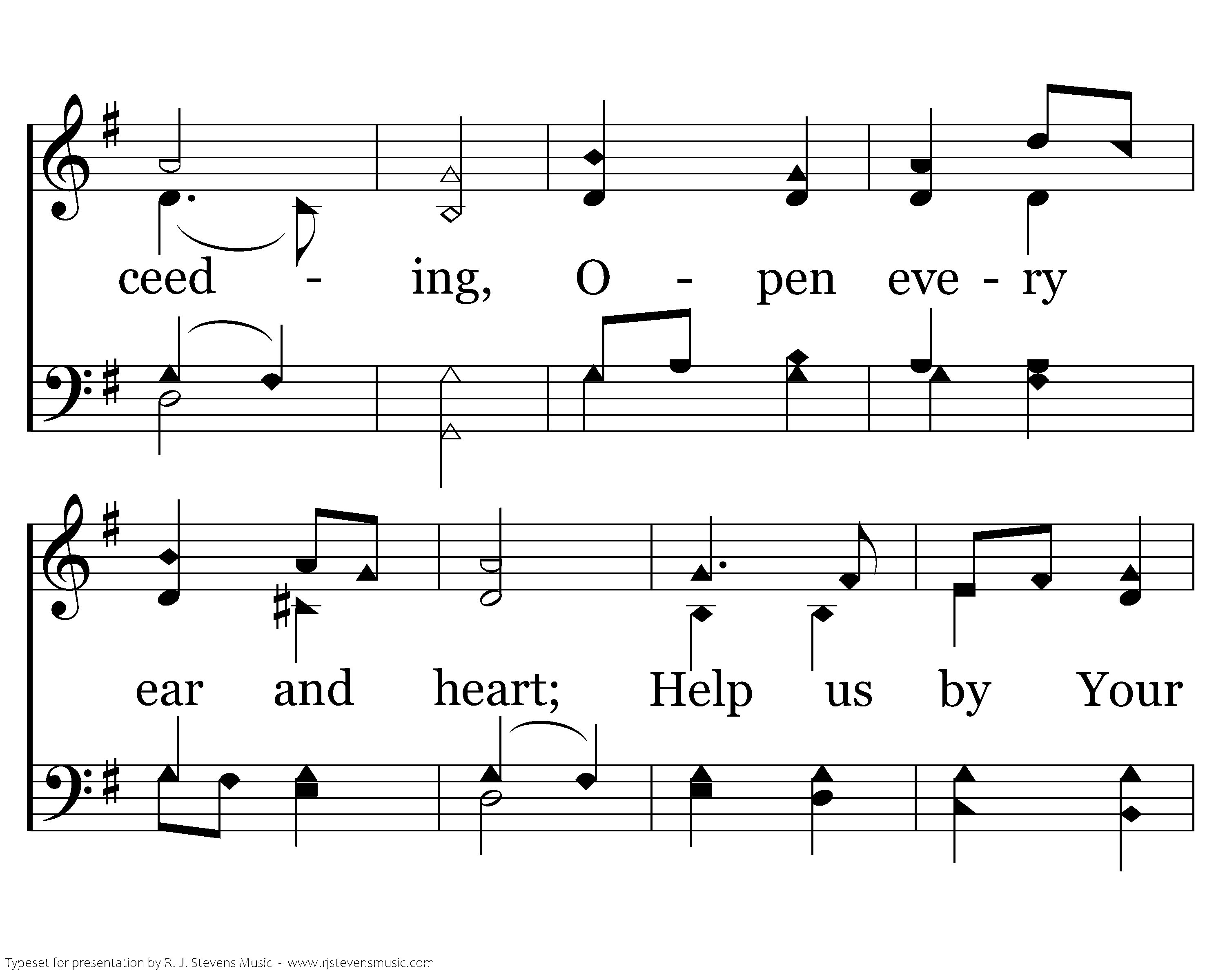 Glorious Lord, Yourself impart! Light of light, from God proceeding, Open every ear and heart; Help us by Your Spirit's pleading; Hear the cry each servant raises; Hear and bless our prayers and praises.