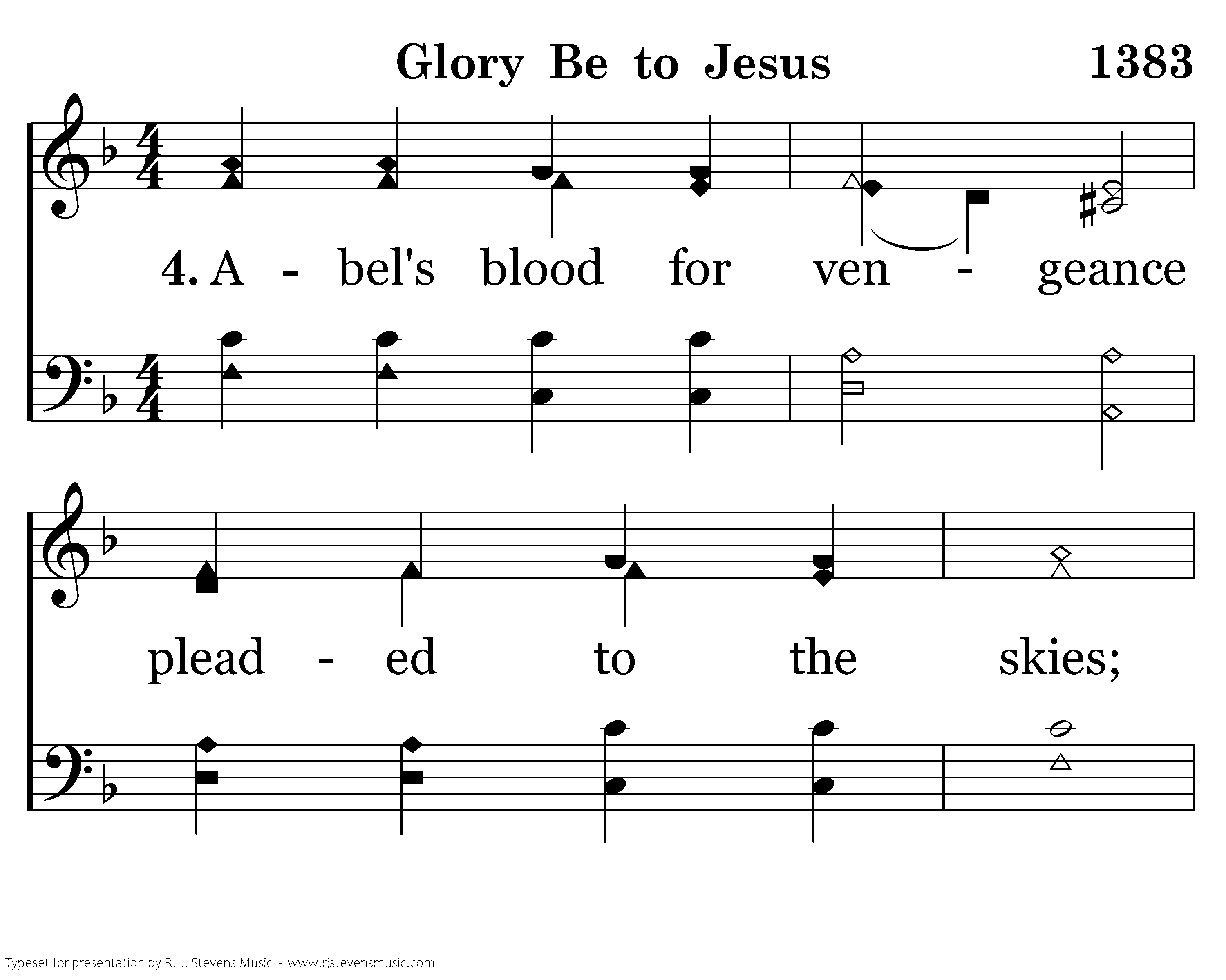 Abel's blood for vengeance pleaded to the skies; But the blood of Jesus for our pardon cries.