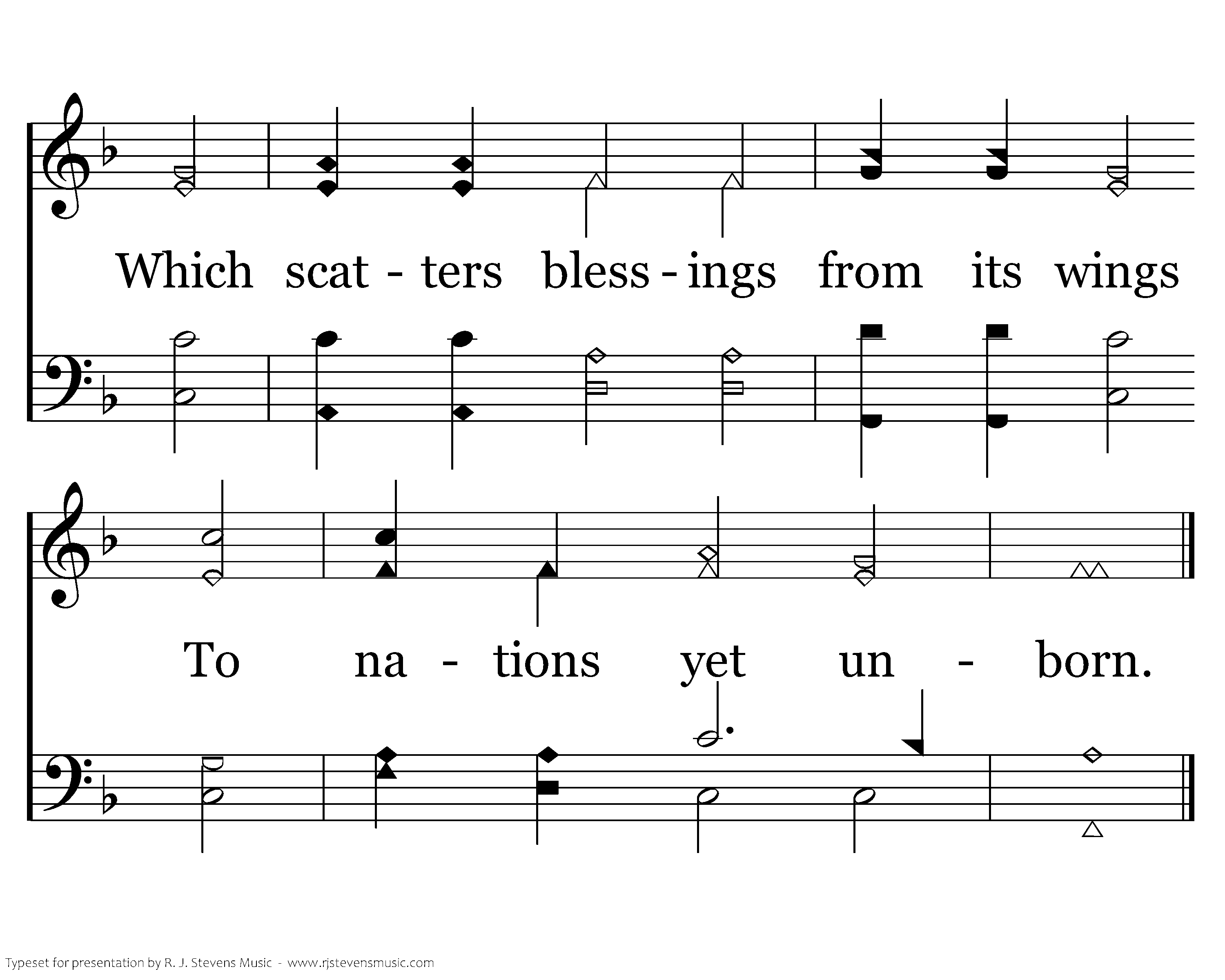 This day be grateful homage paid, And loud hosannas sung; Let gladness dwell in every heart And praise on every tongue. Ten thousand diff'rent lips shall join To hail this welcome morn, Which scatters blessings from its wings To nations yet unborn.