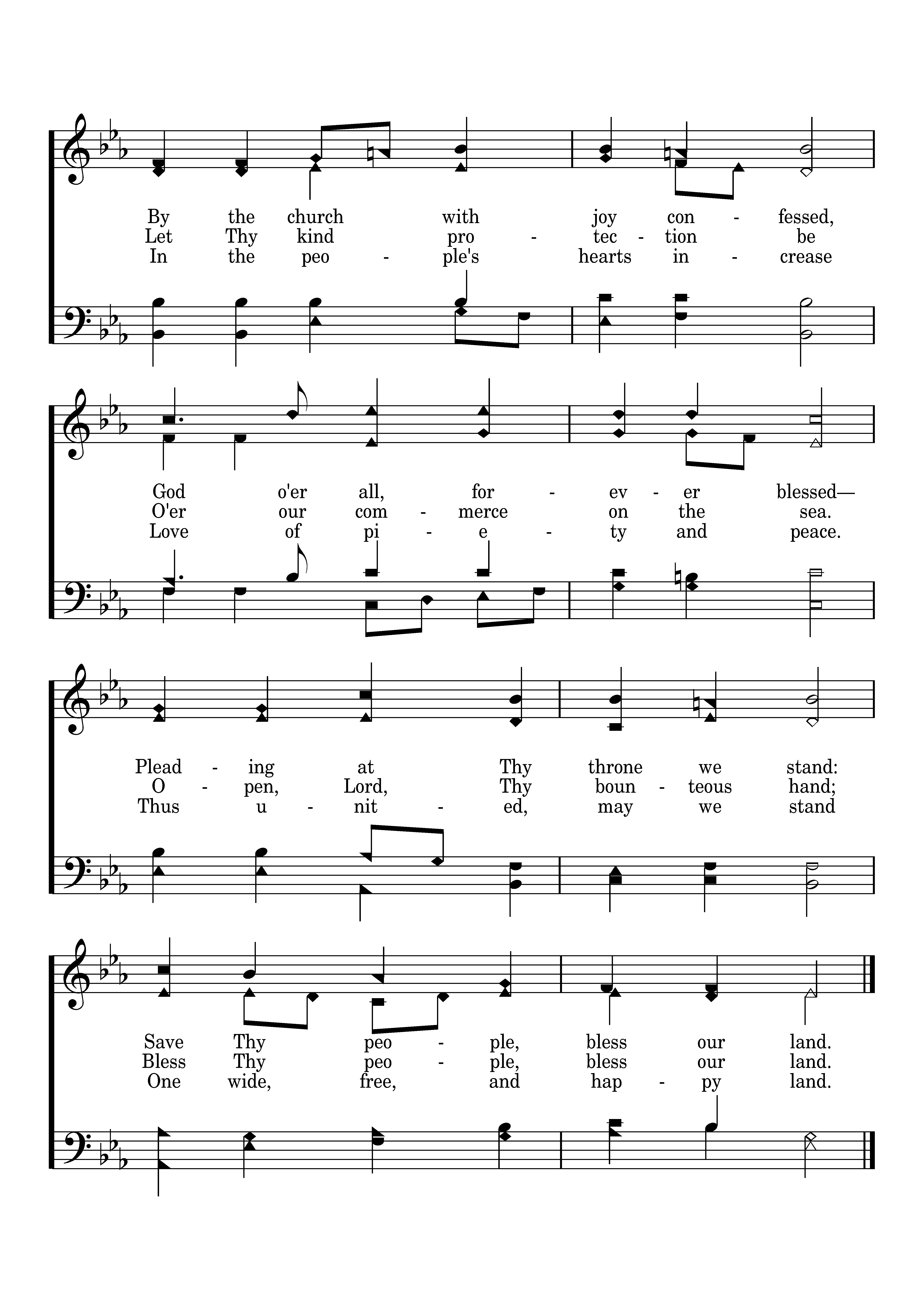 On our fields of grass and grain, Send, O Lord, the kindly rain; O'er our wide and goodly land, Crown the labors of each hand. Let Thy kind protection be O'er our commerce on the sea. Open, Lord, Thy bounteous hand; Bless Thy people, bless our land.