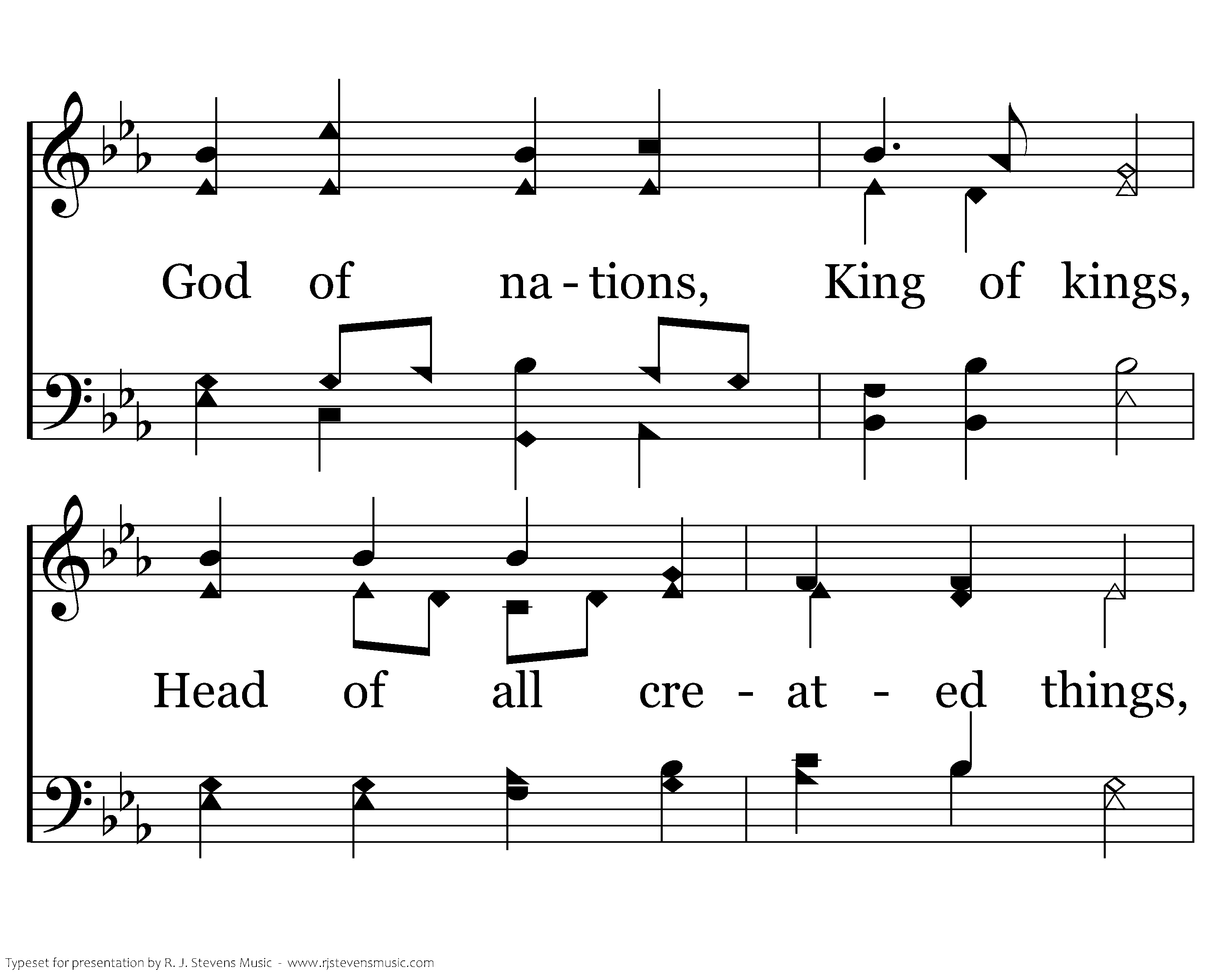Christ, by heav'nly hosts adored, Gracious, mighty, sov'reign Lord, God of nations, King of kings, Head of all created things, By the church with joy confessed, God o'er all, forever blessed Pleading at Thy throne we stand: Save Thy people, bless our land.