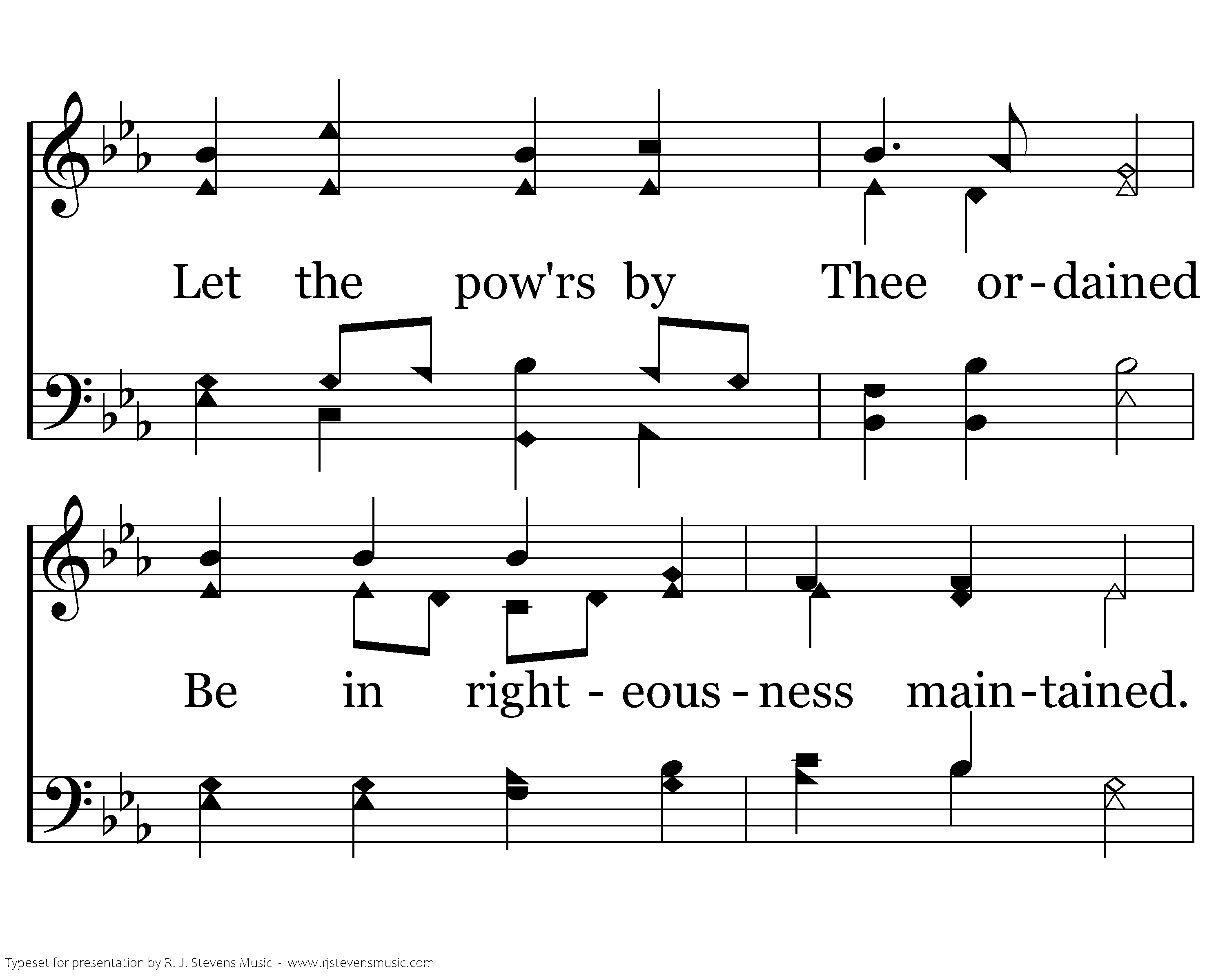 Let our rulers ever be Men that love and honor Thee; Let the pow'rs by Thee ordained Be in righteousness maintained. In the people's hearts increase Love of piety and peace. Thus united, may we stand One wide, free, and happy land.