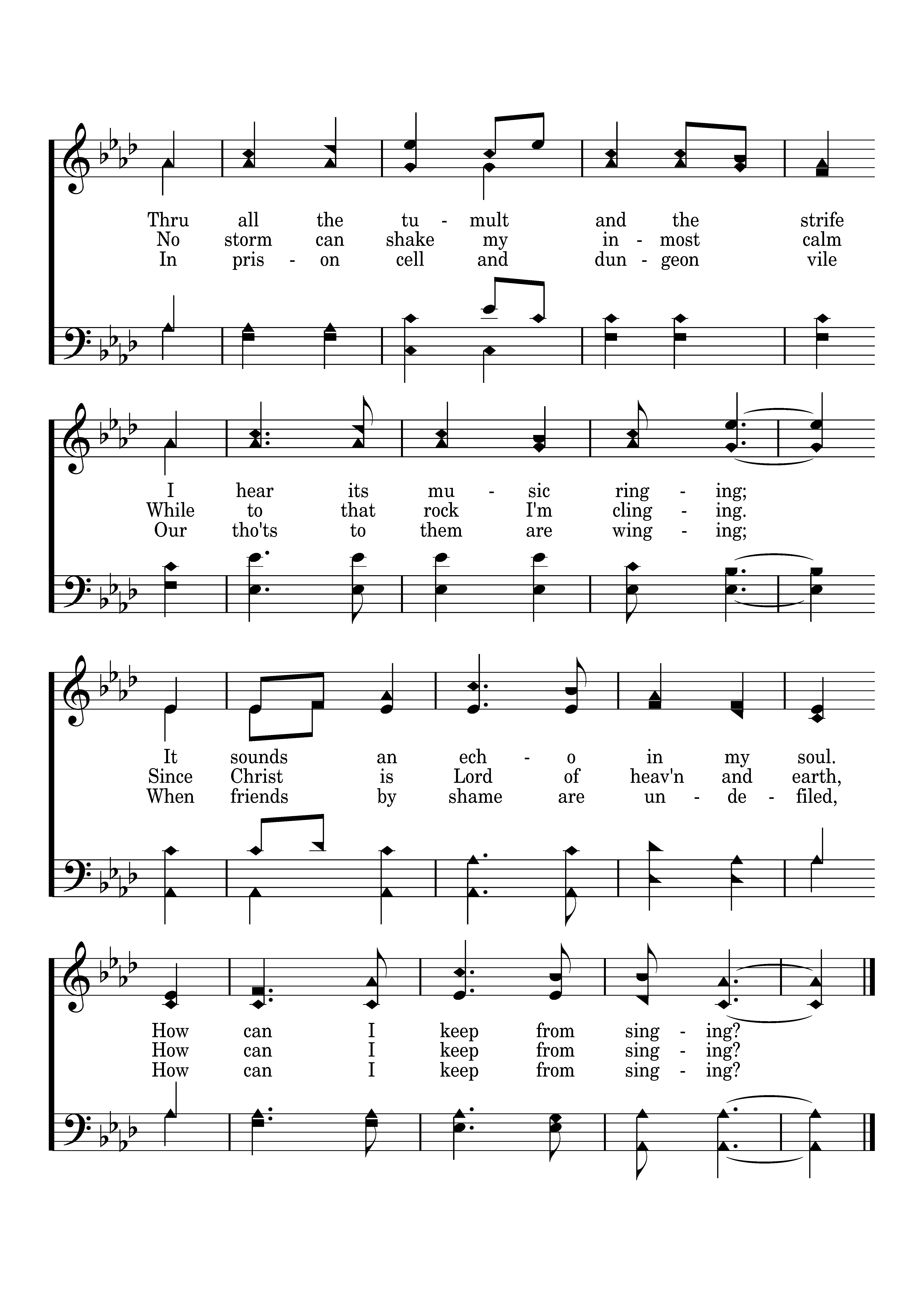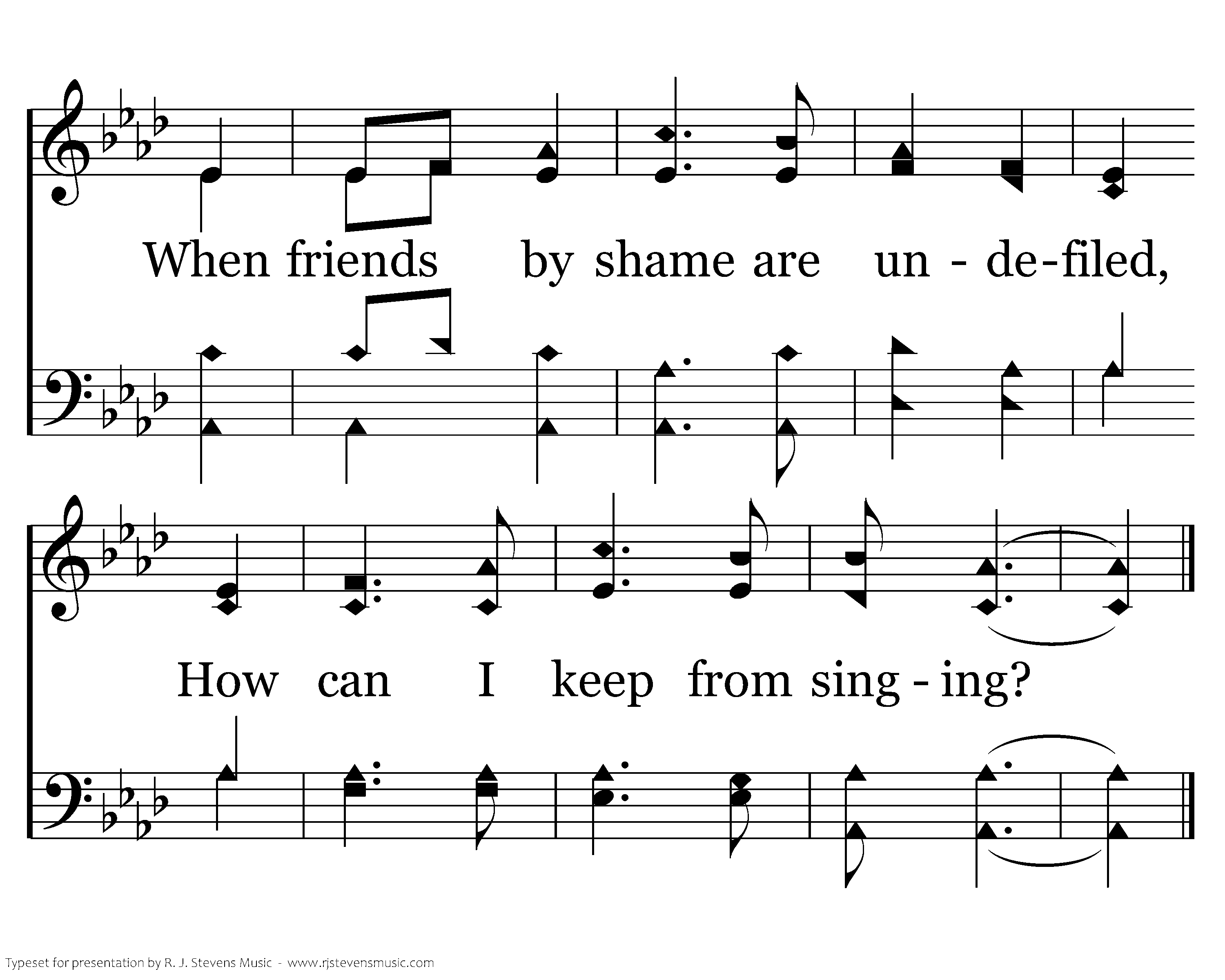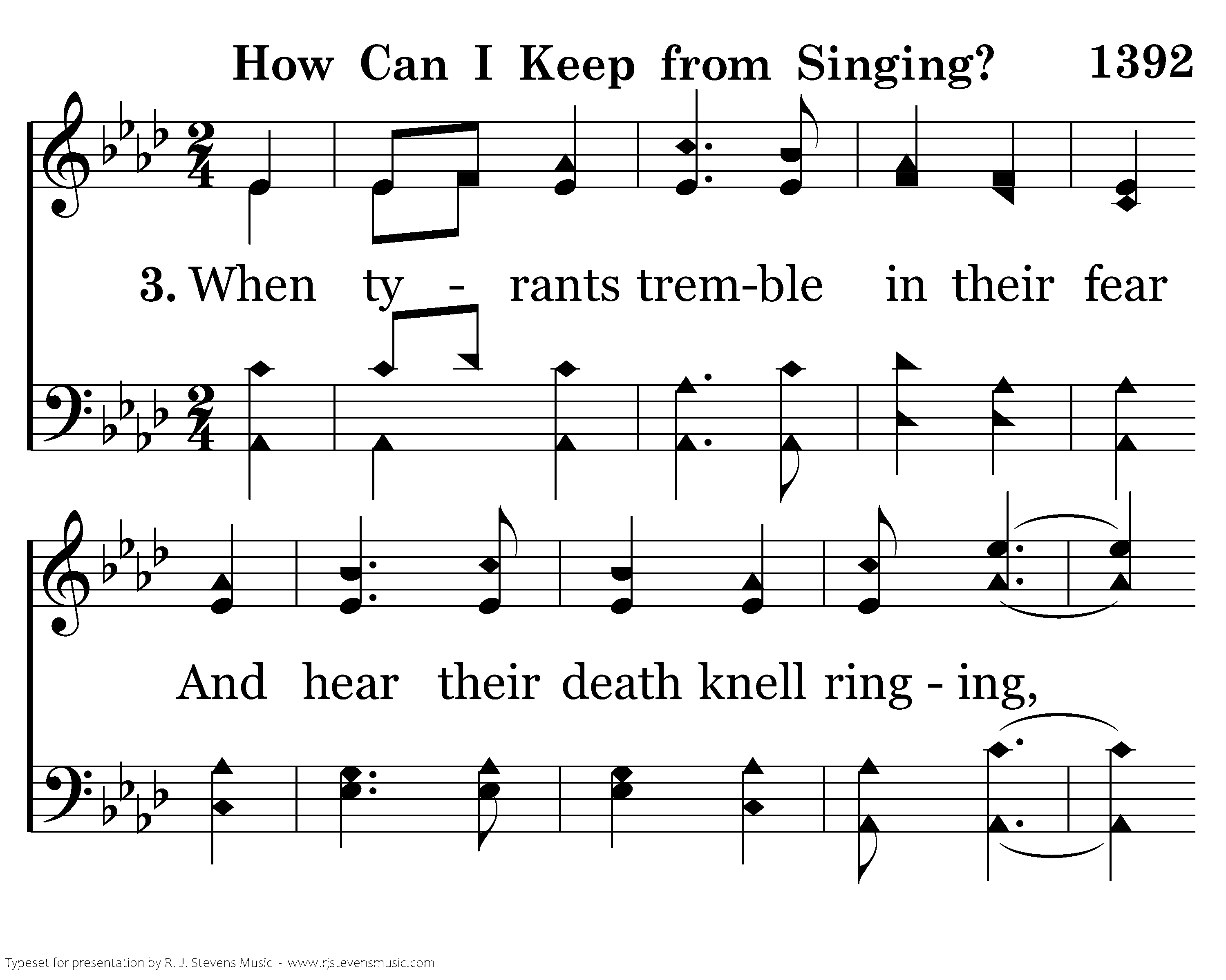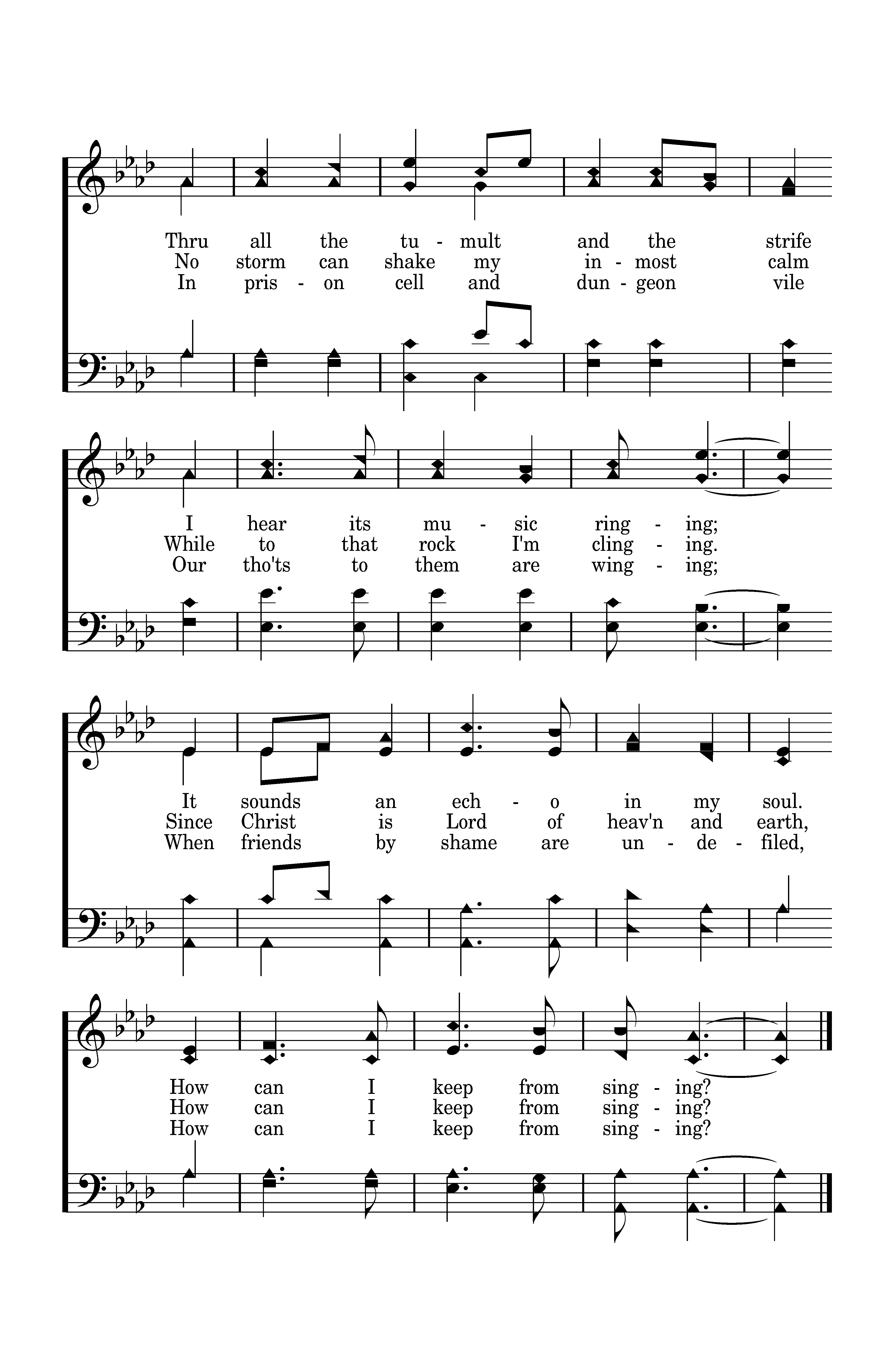 When tyrants tremble in their fear And hear their death knell ringing, When friends rejoice both far and near, How can I keep from sing-ing? In prison cell and dungeon vile Our tho'ts to them are winging; When friends by shame are undefiled, How can I keep from singing?