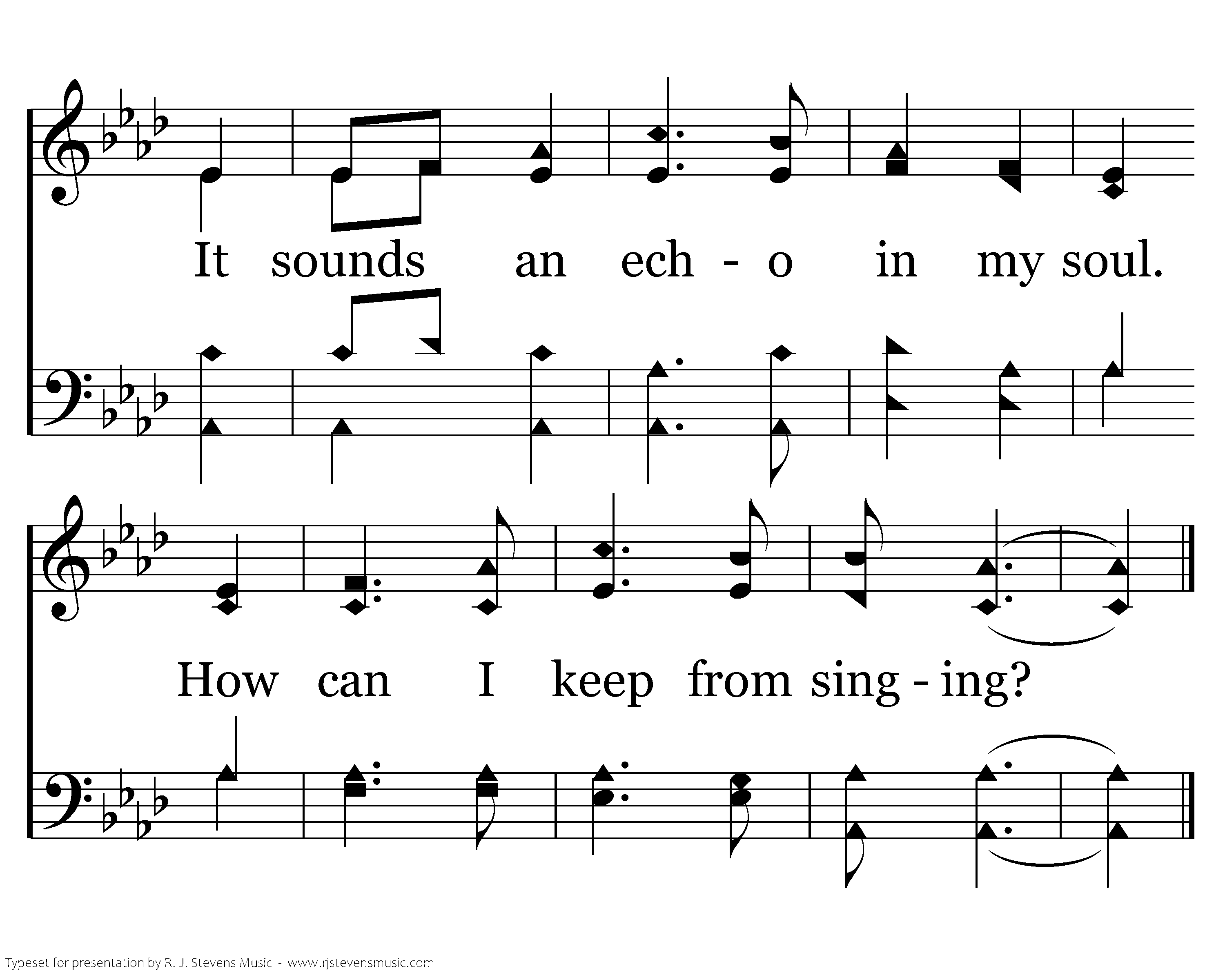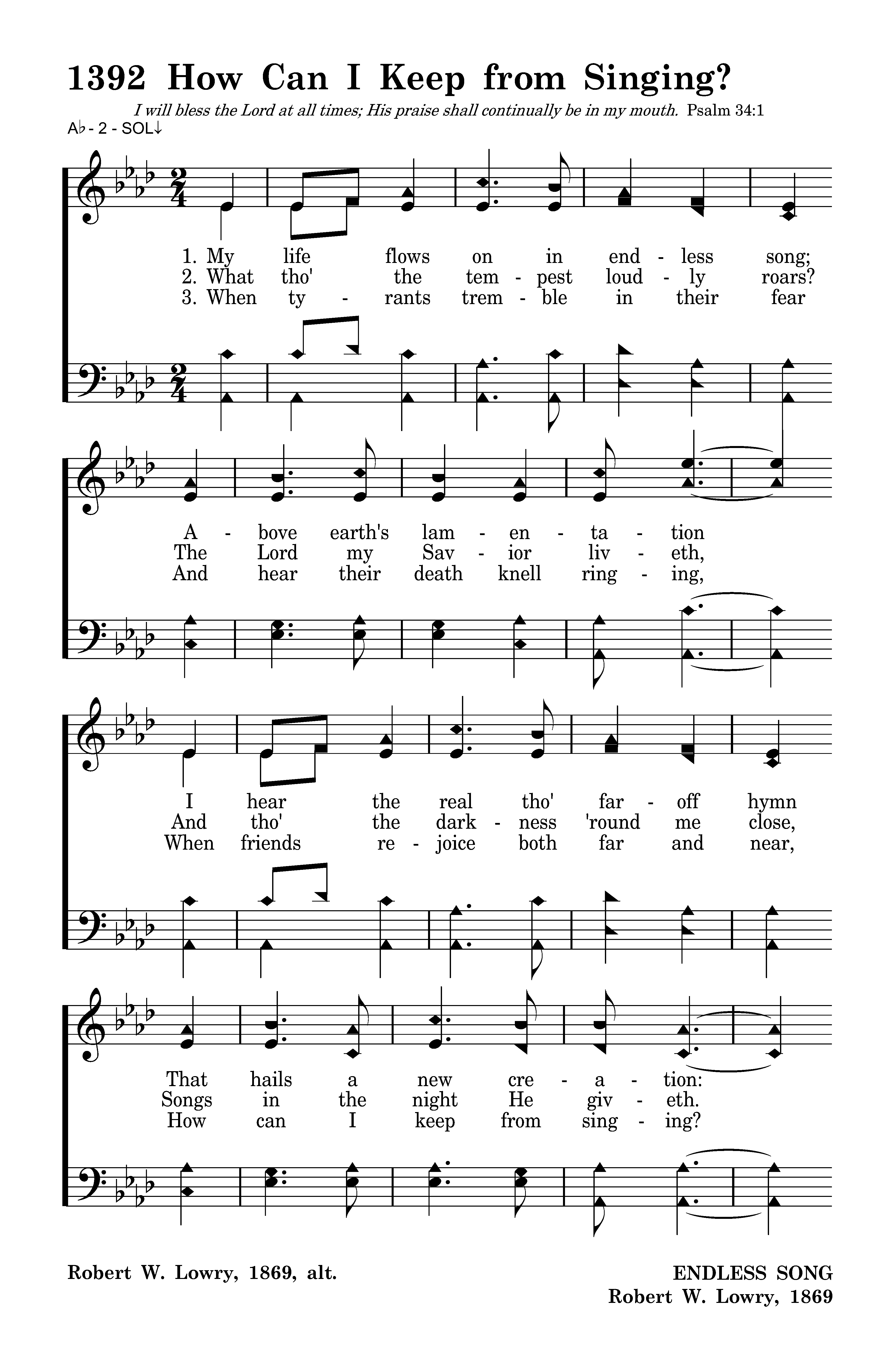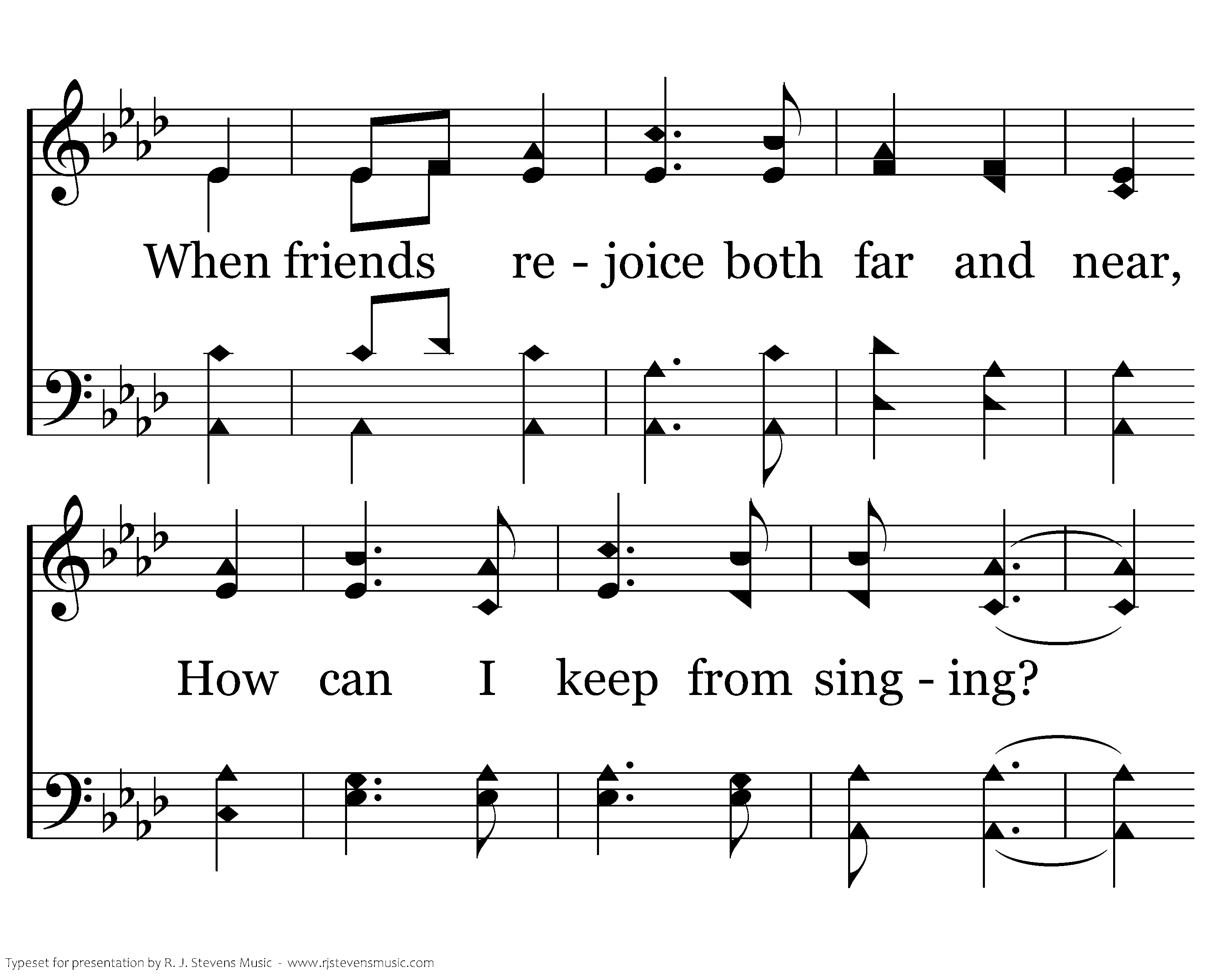 When tyrants tremble in their fear And hear their death knell ringing, When friends rejoice both far and near, How can I keep from sing-ing? In prison cell and dungeon vile Our tho'ts to them are winging; When friends by shame are undefiled, How can I keep from singing?