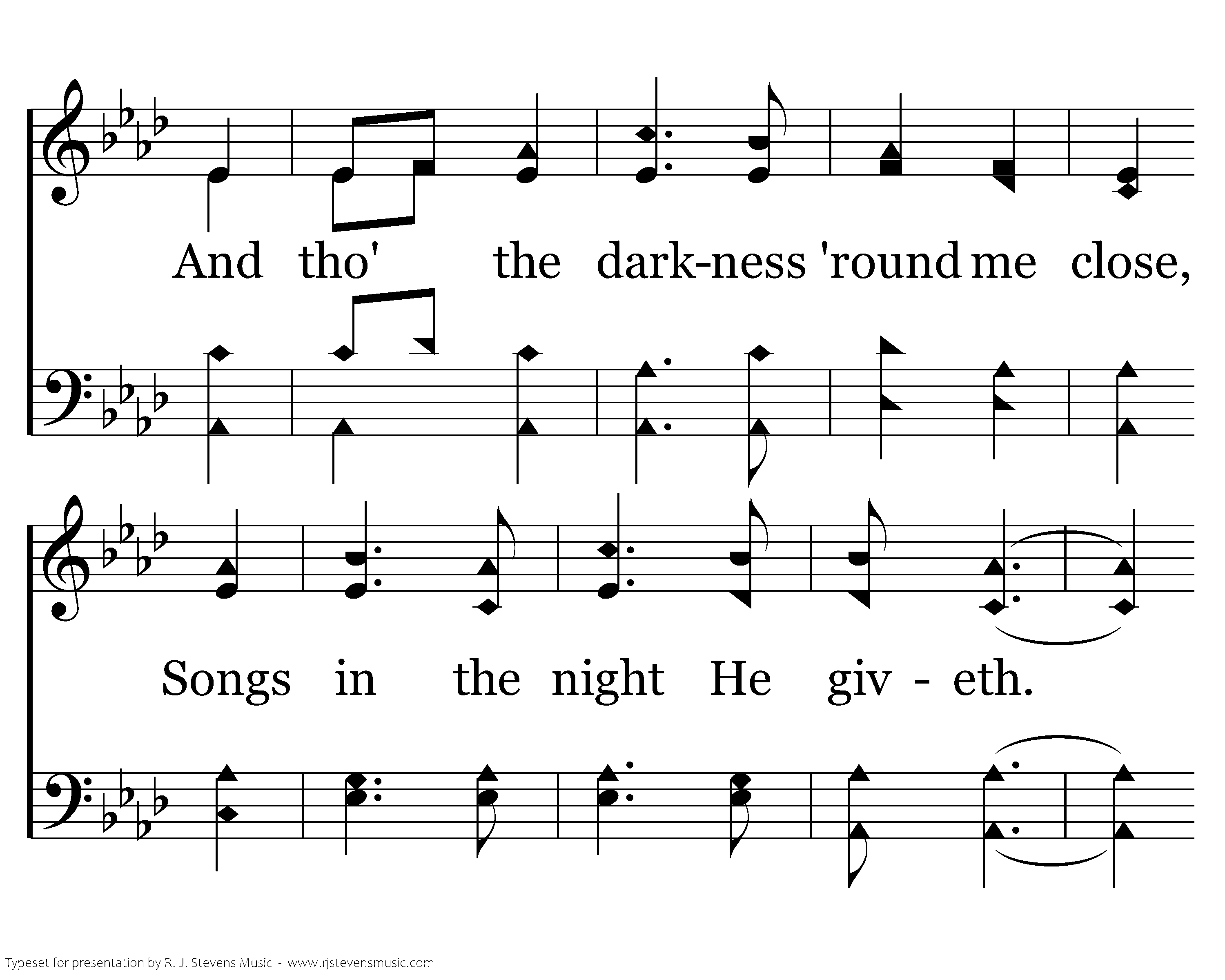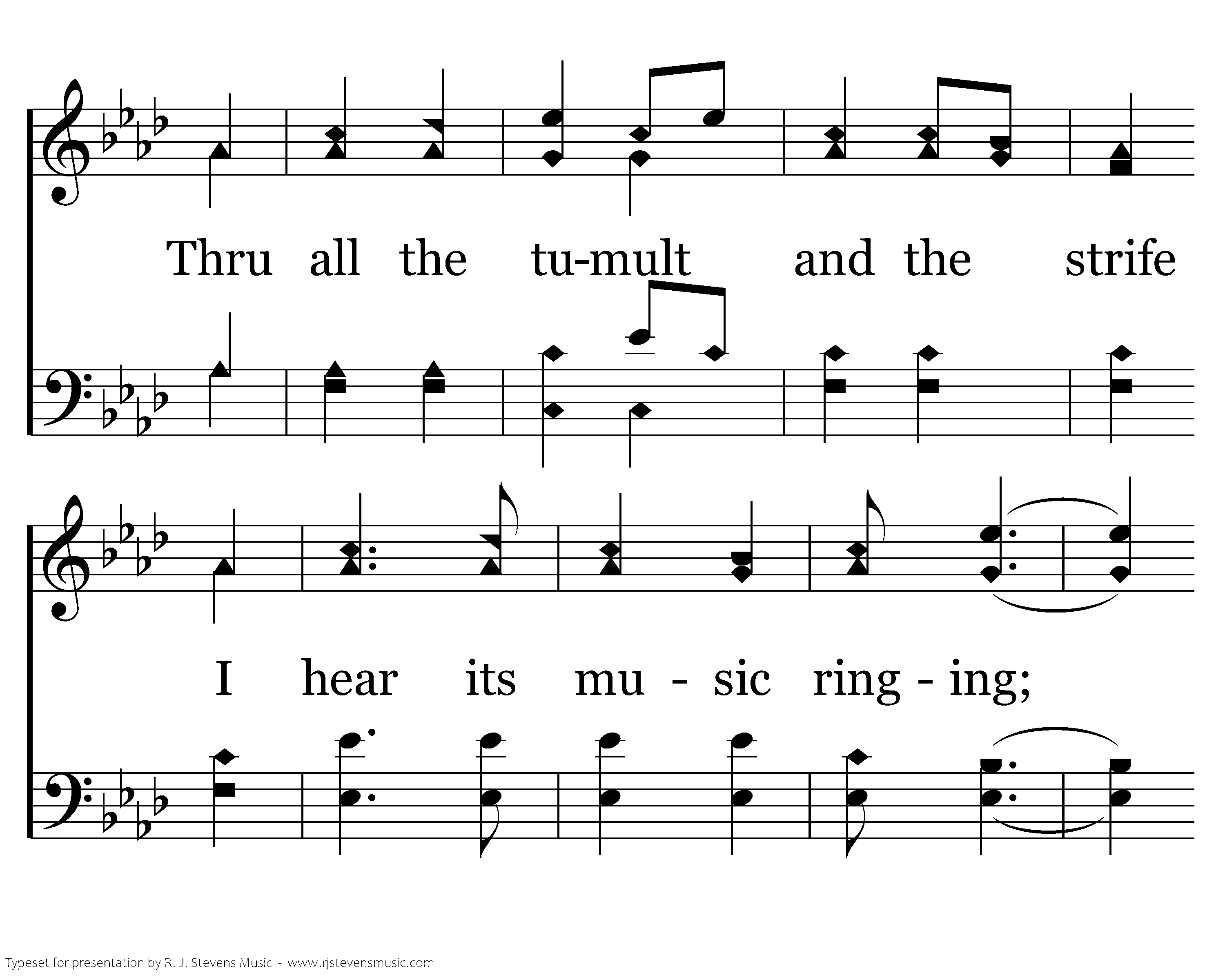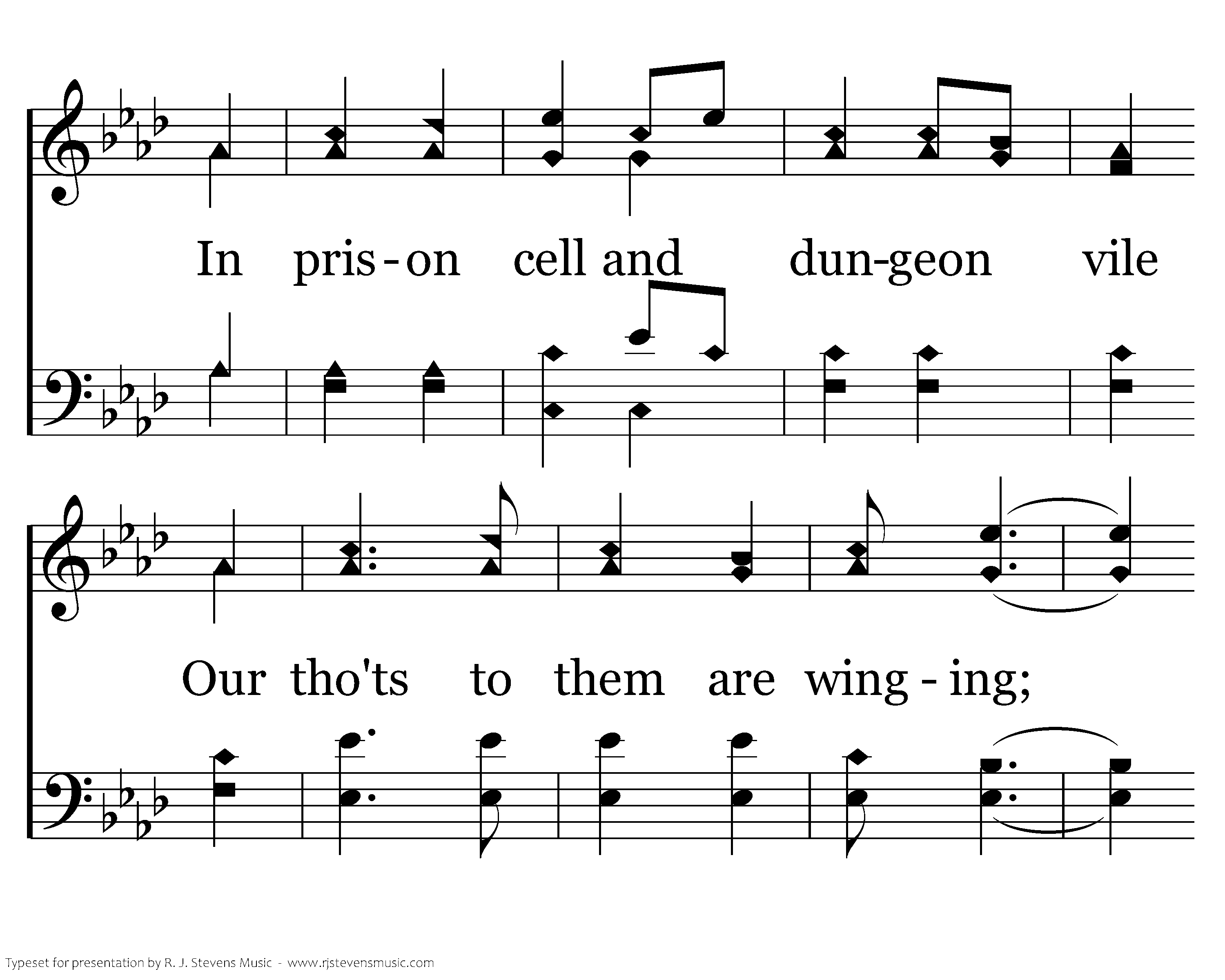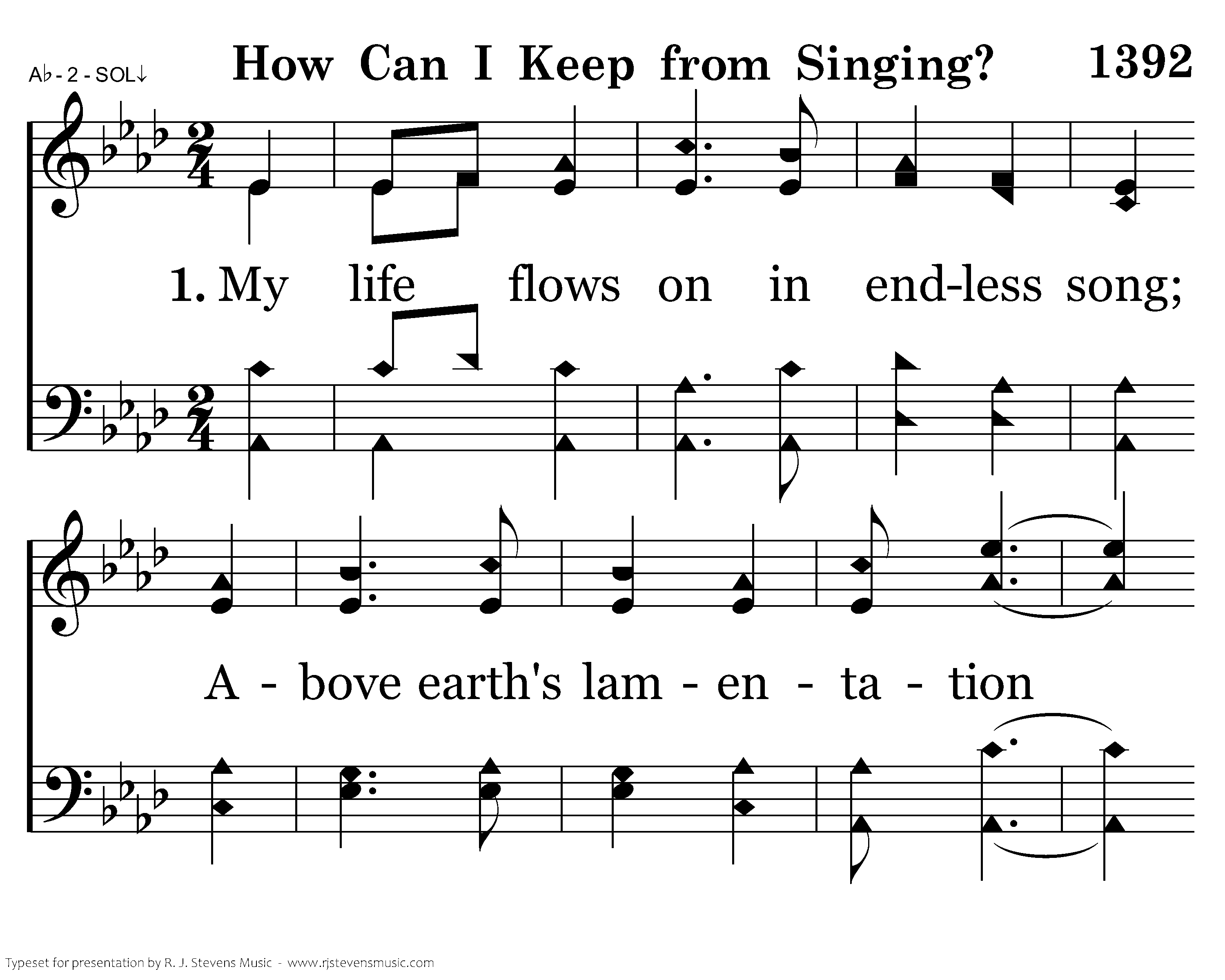 When tyrants tremble in their fear And hear their death knell ringing, When friends rejoice both far and near, How can I keep from sing-ing? In prison cell and dungeon vile Our tho'ts to them are winging; When friends by shame are undefiled, How can I keep from singing?