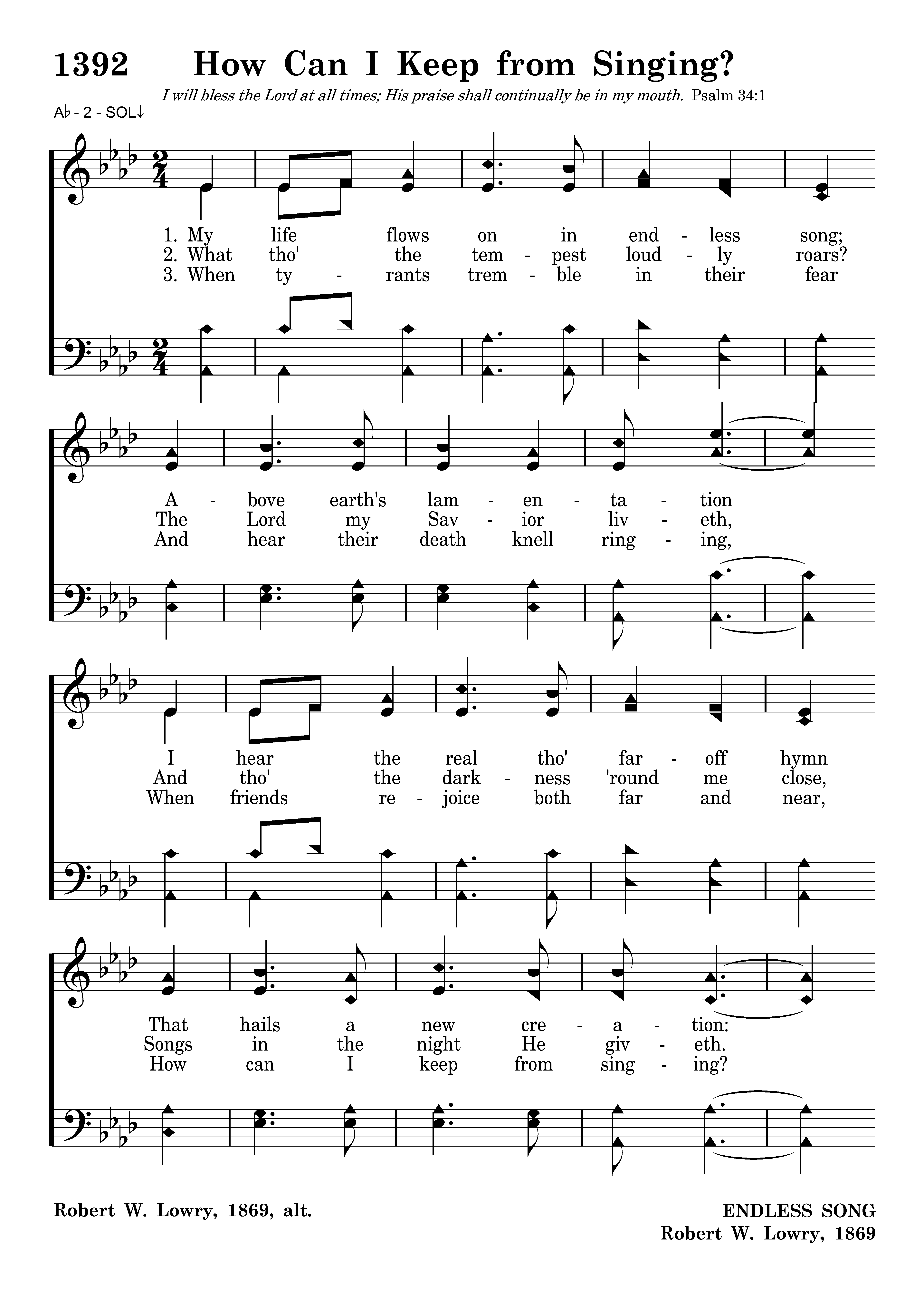 My life flows on in endless song; Above earth's lamentation I hear the real tho' faroff hymn That hails a new creation: Thru all the tumult and the strife I hear its music ringing; It sounds an echo in my soul. How can I keep from singing?