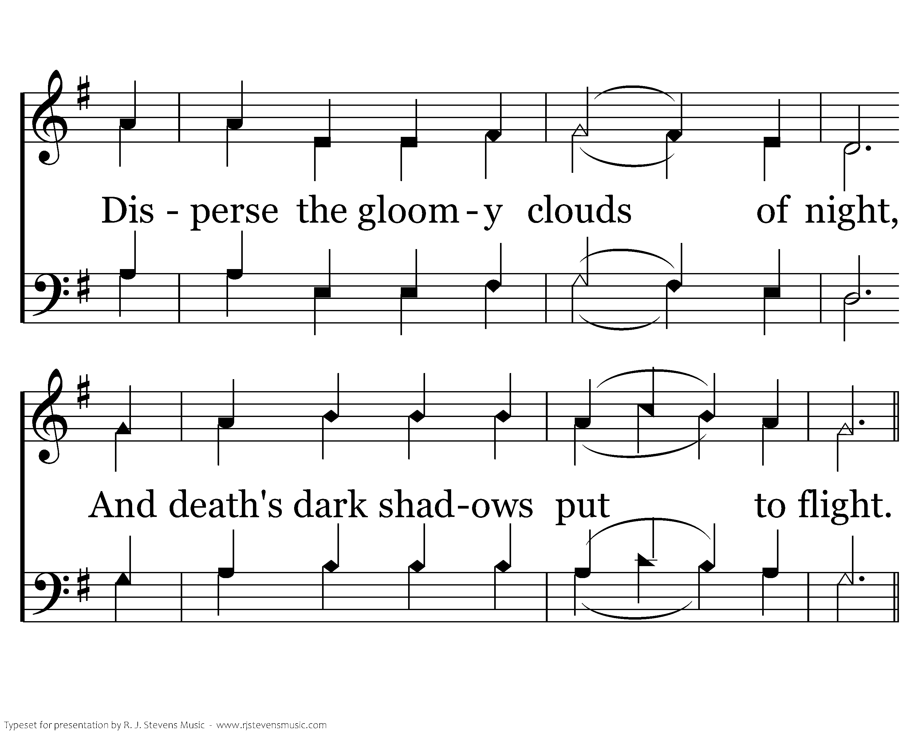 O come, Thou Dayspring, come and cheer Our spirits by Thine advent here; Disperse the gloomy clouds of night, And death's dark shadows put to flight.