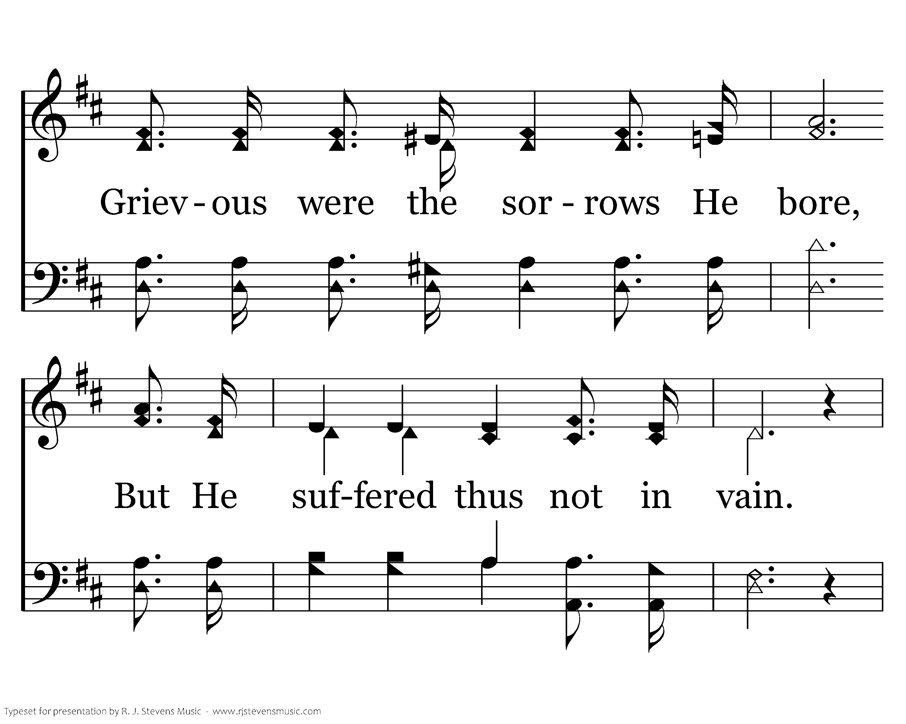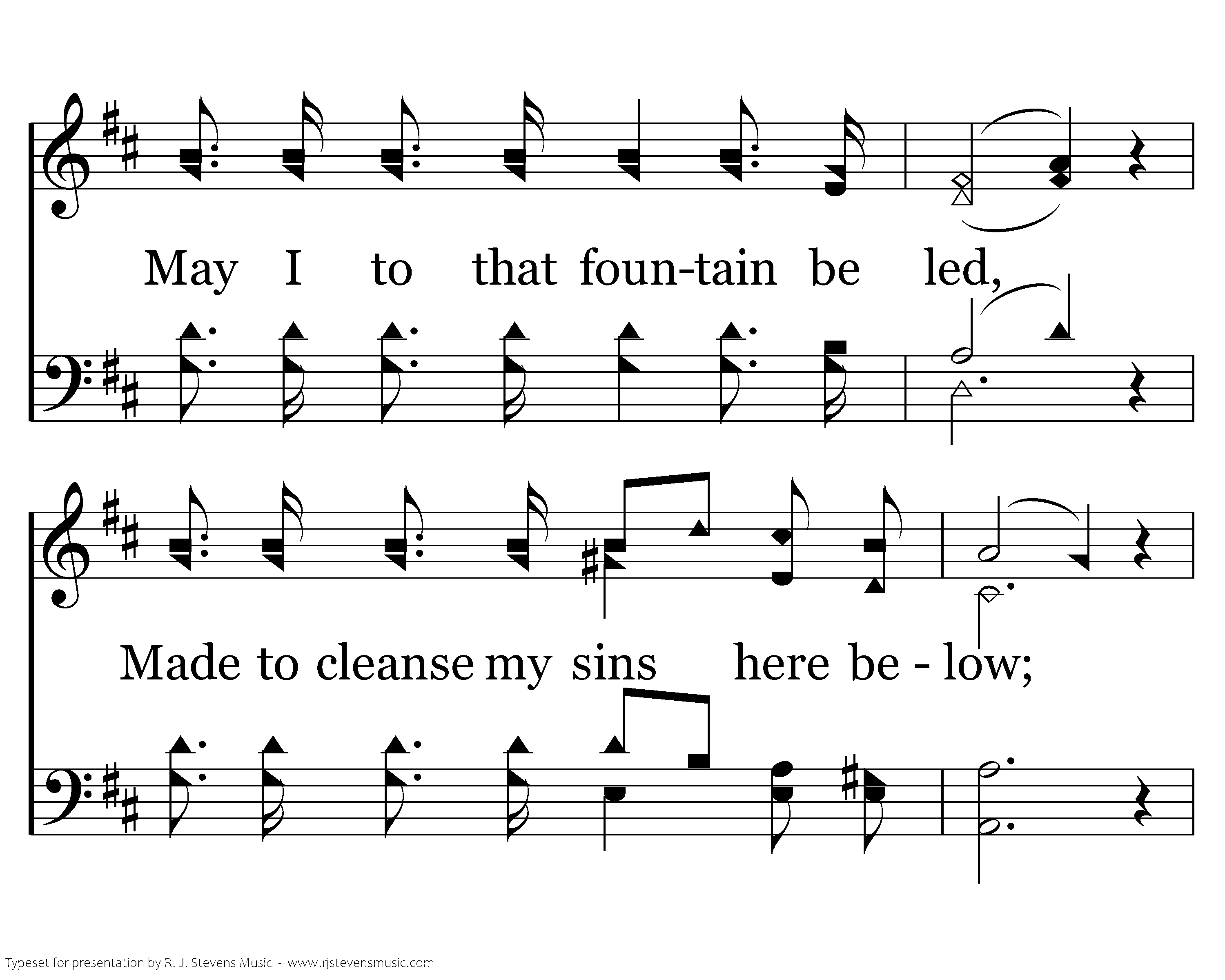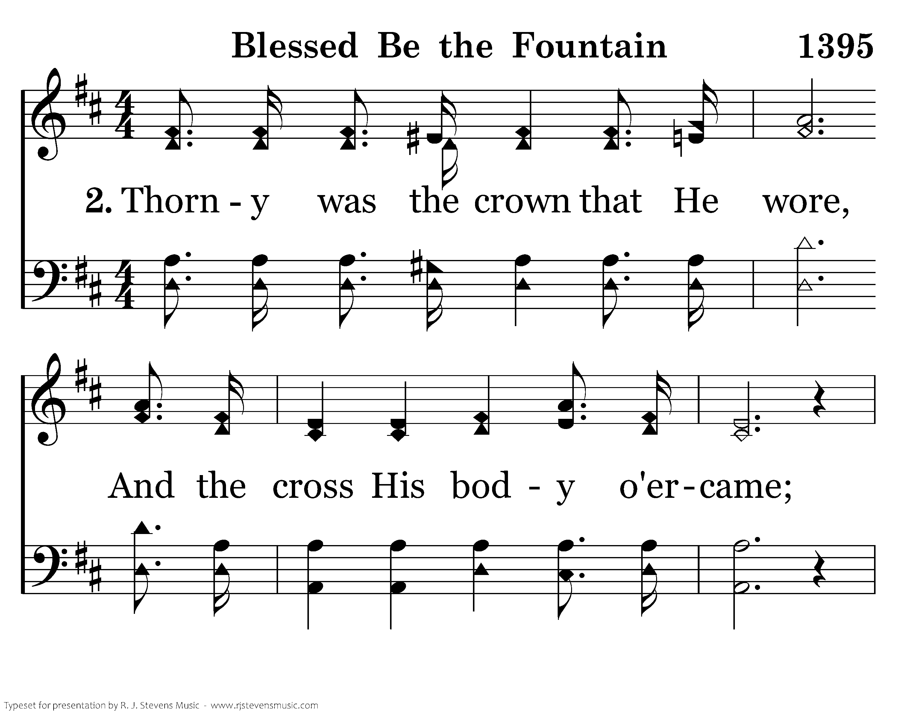 Thorny was the crown that He wore, And the cross His body o'ercame; Grievous were the sorrows He bore, But He suffered thus not in vain. May I to that fountain be led, Made to cleanse my sins here below; Wash me in the blood that He shed, And I shall be whiter than snow.
