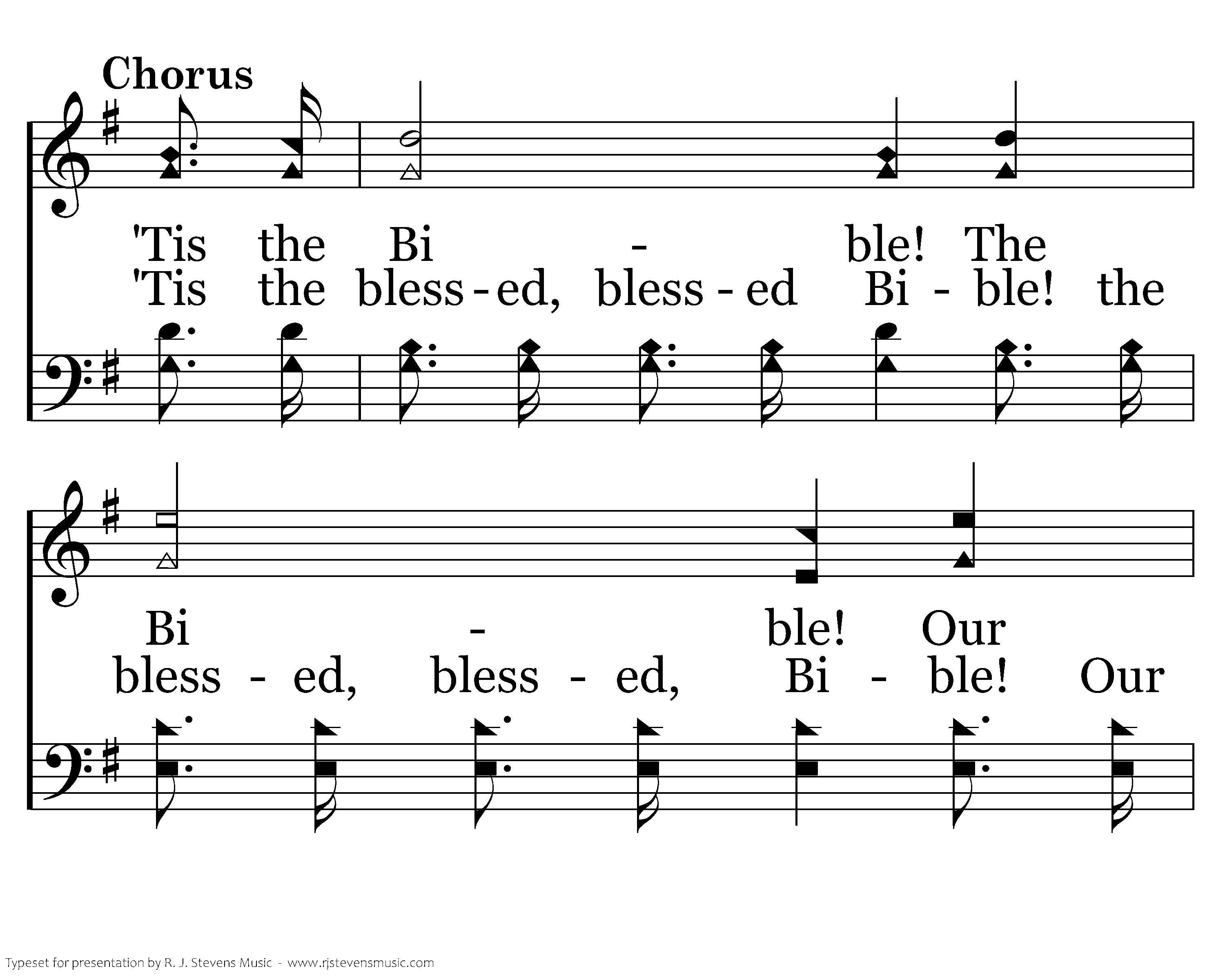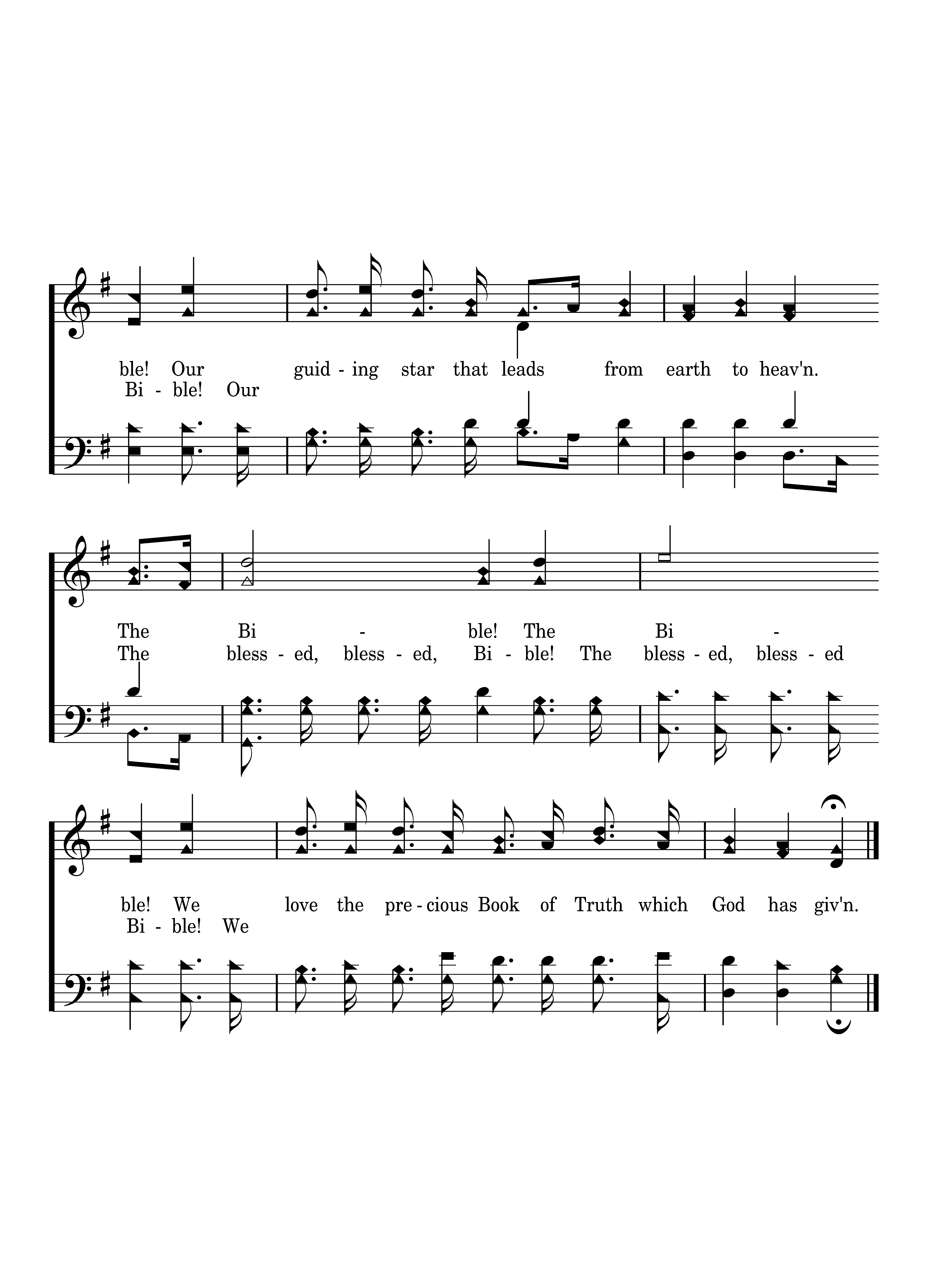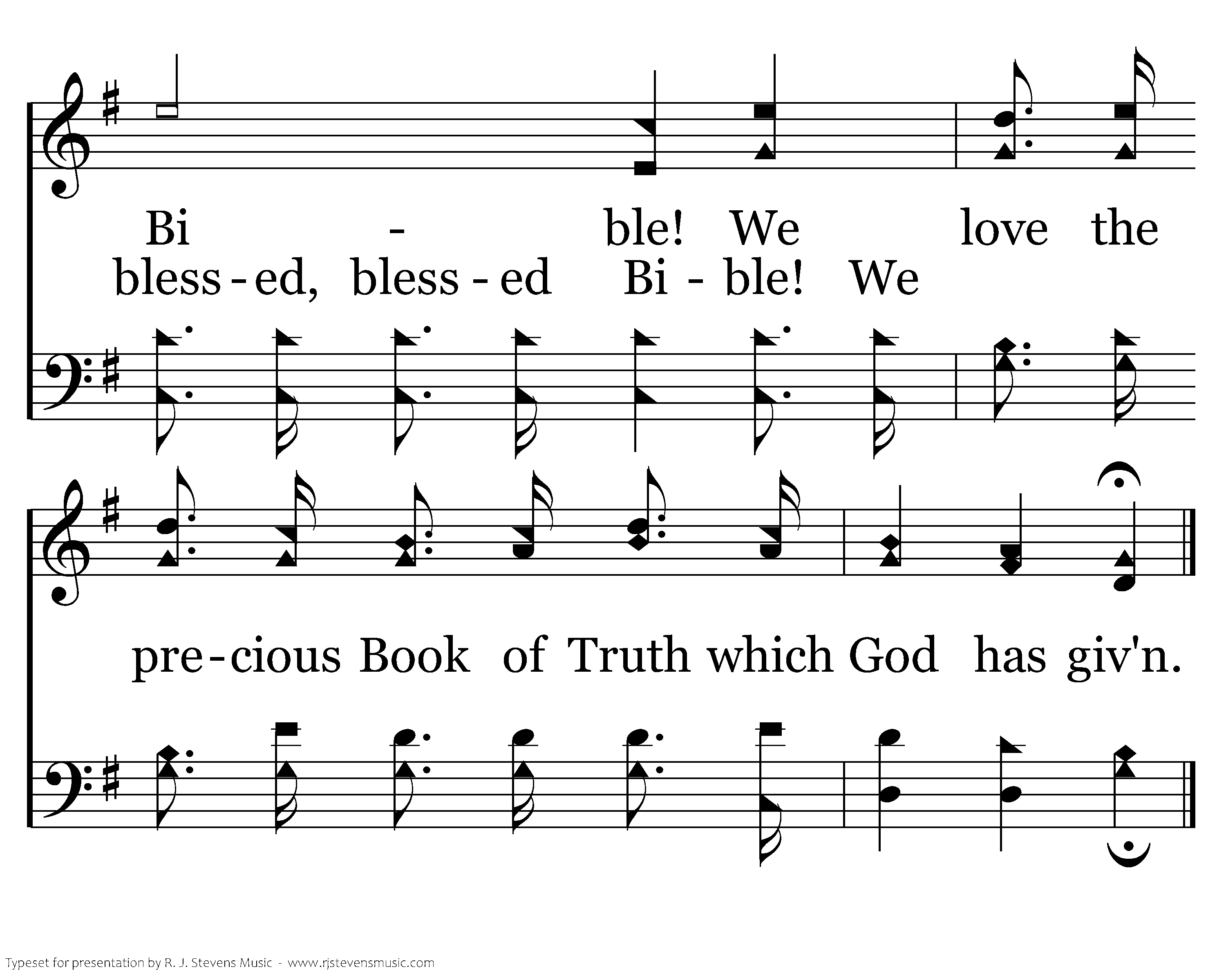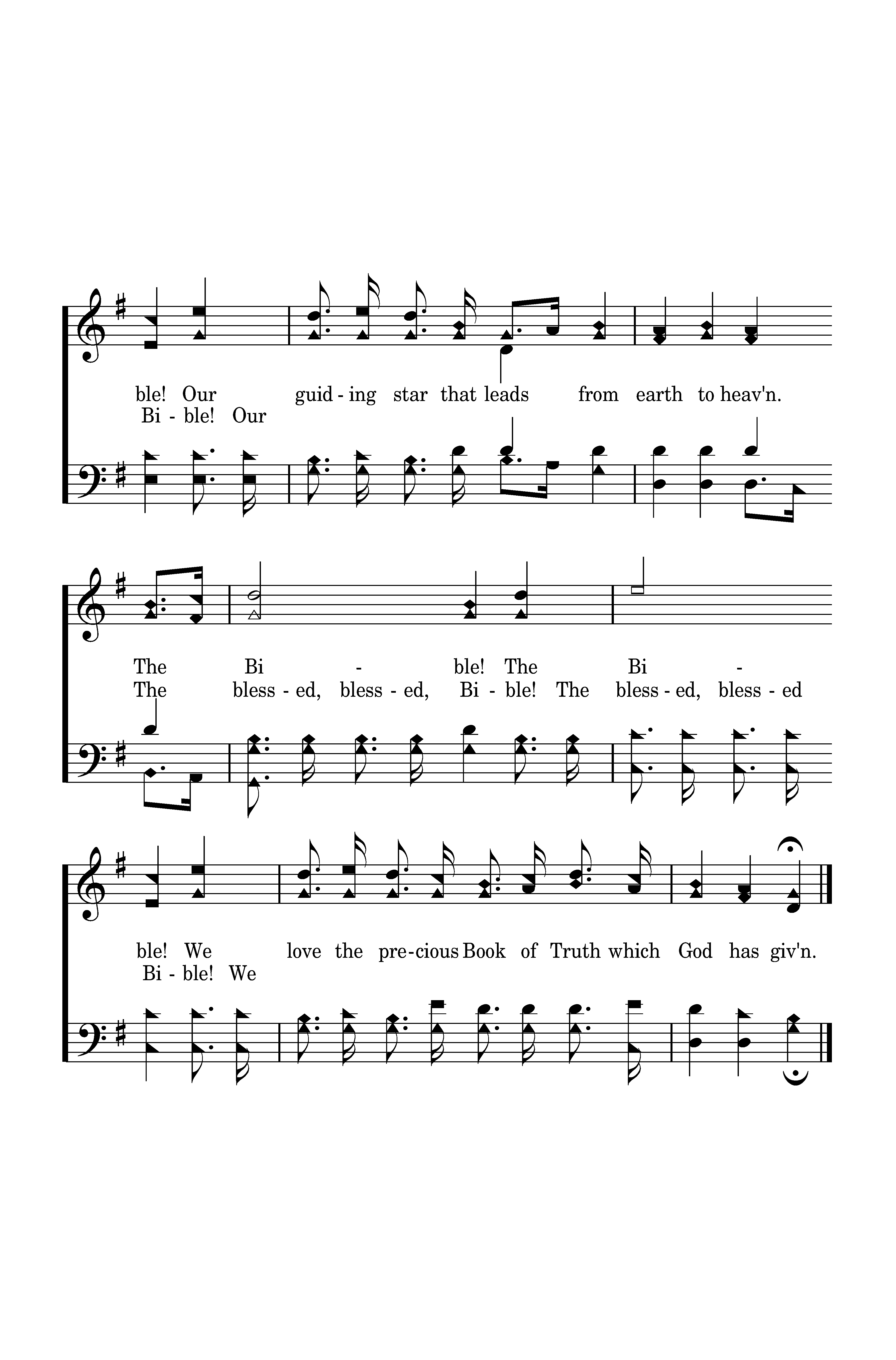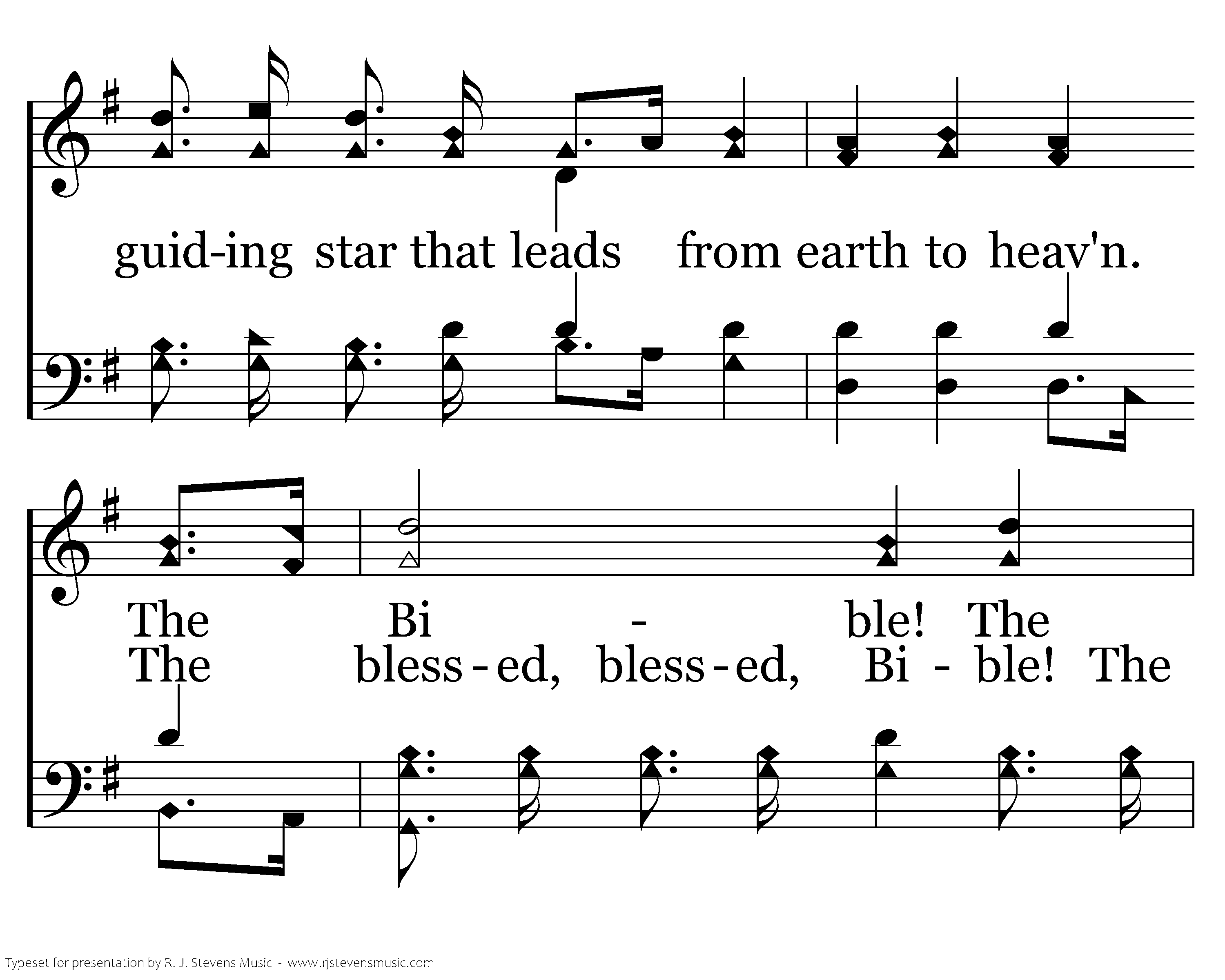 Tis the Bible! The Bible! Our guiding star that leads from earth to heav'n. The Bible! The Bible! We love the precious Book of Truth which God has giv'n. 'Tis the bless-ed, bless-ed Bi-ble!