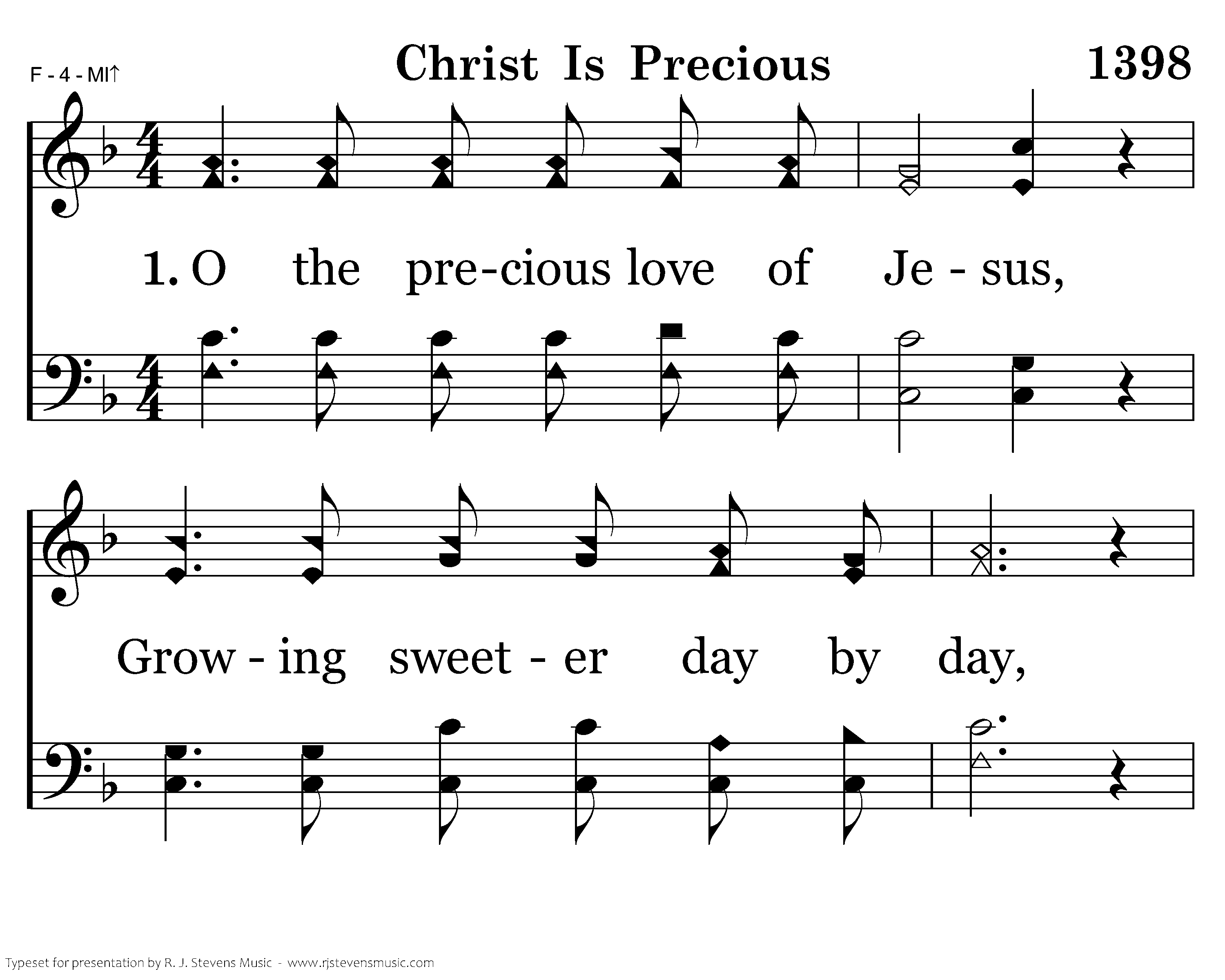 O the precious love of Jesus, Growing sweeter day by day, Tuning all my heart, so joyous, To a heav'nly melody.