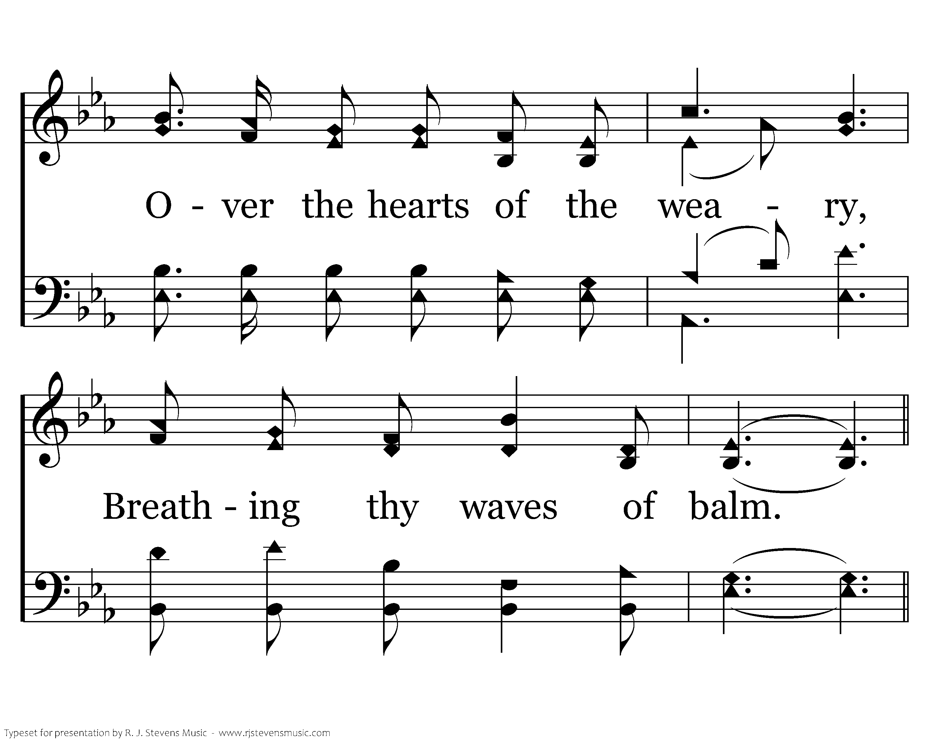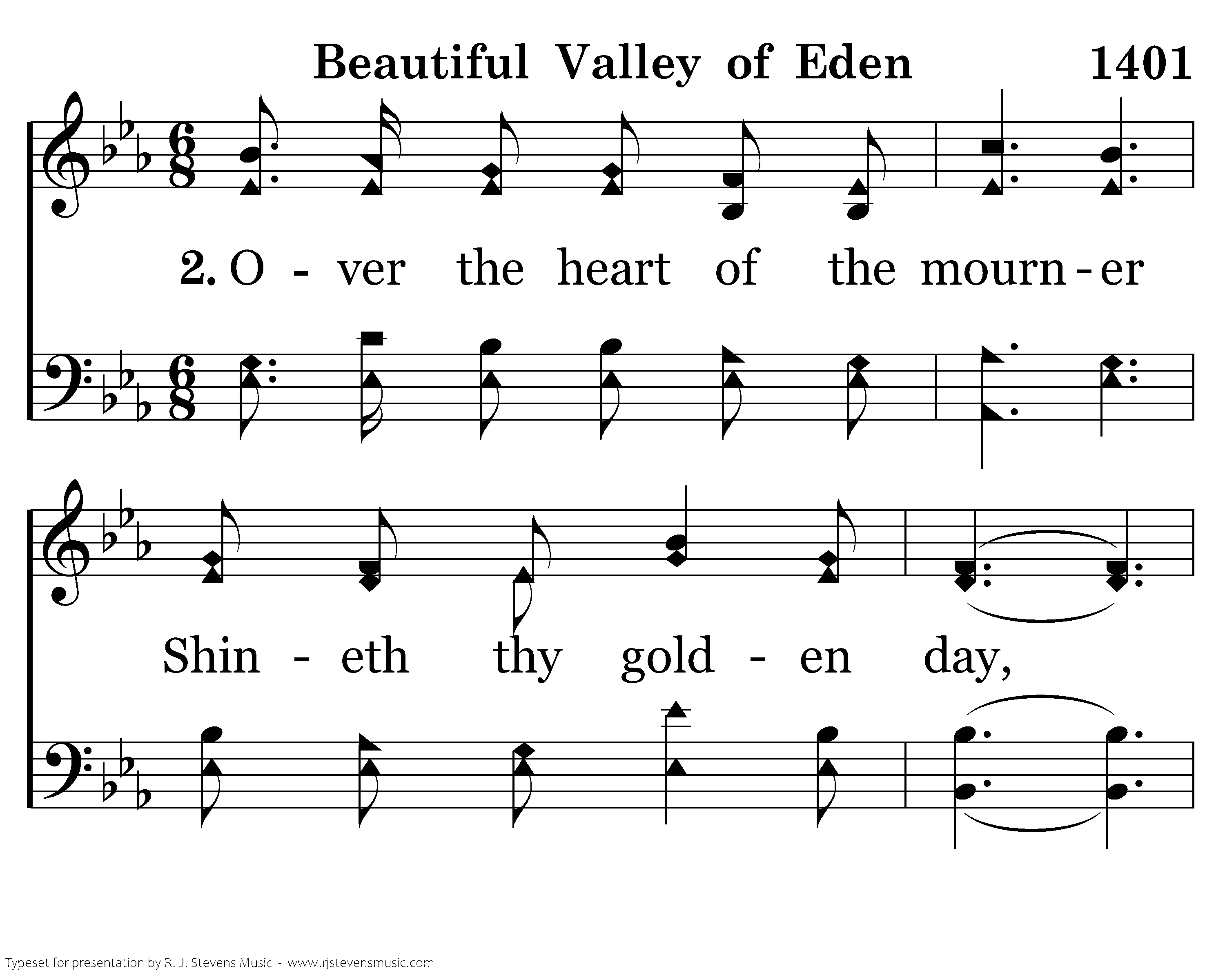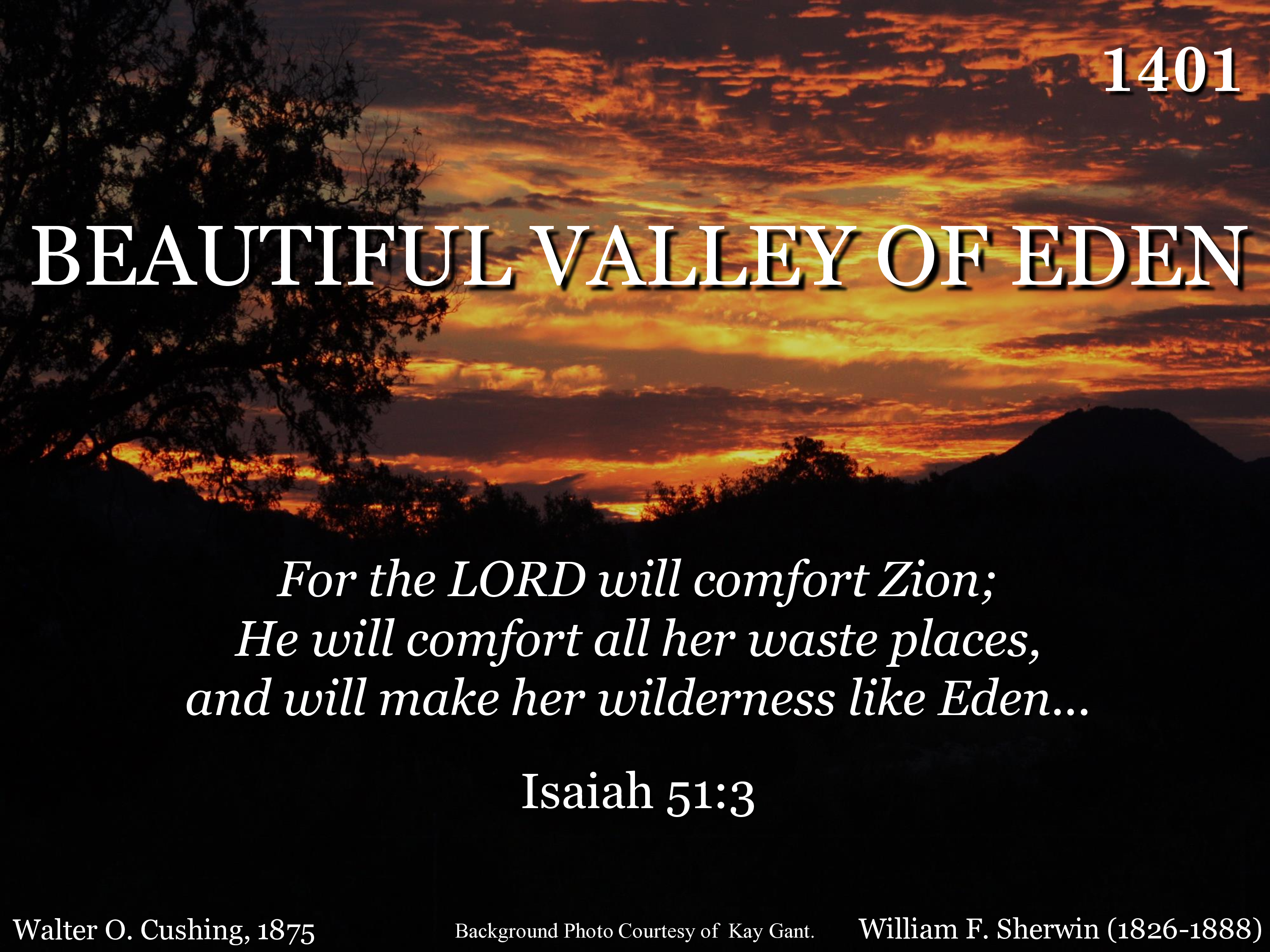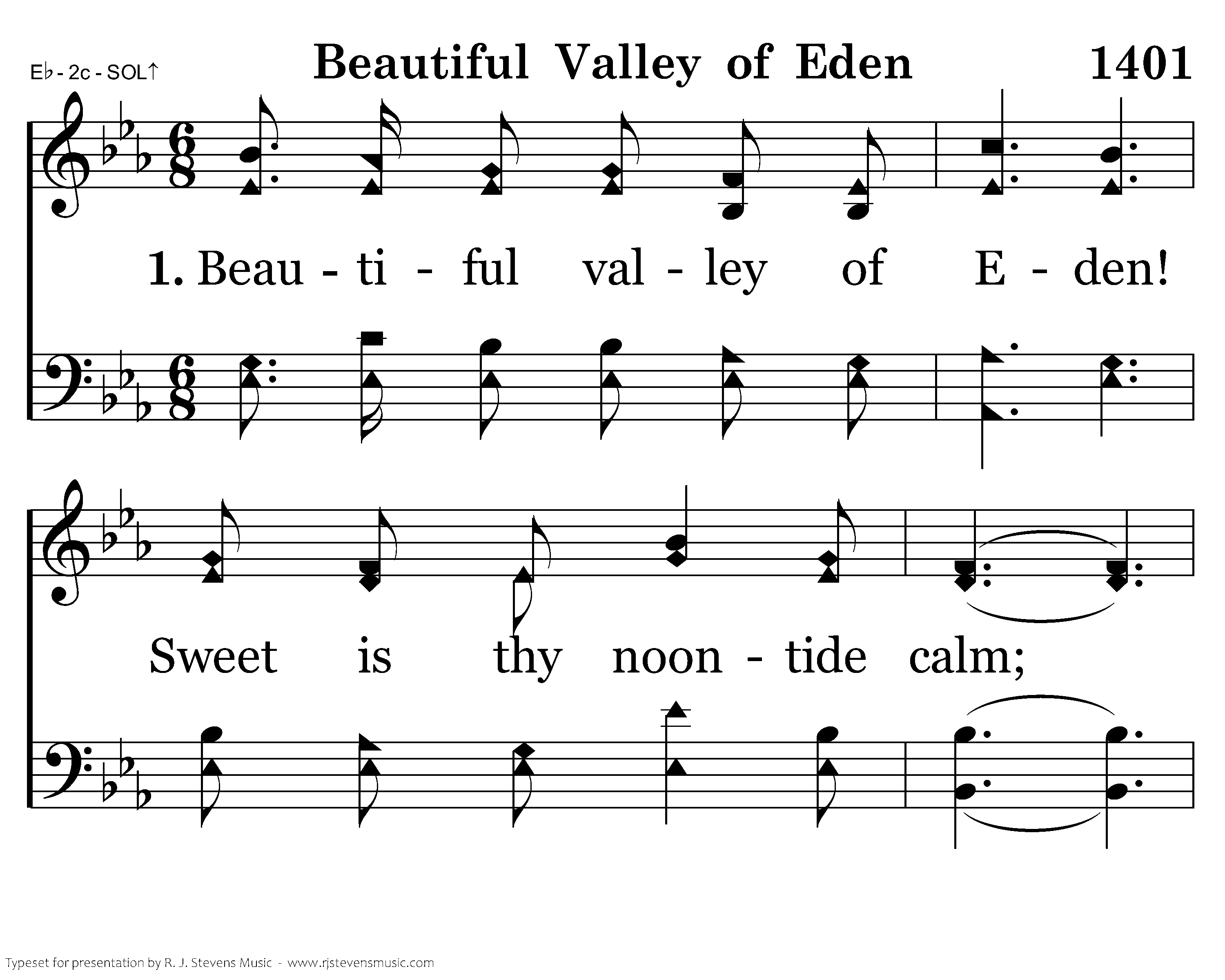 Beautiful valley of Eden! Sweet is thy noontide calm; Over the hearts of the weary, Breathing thy waves of balm.