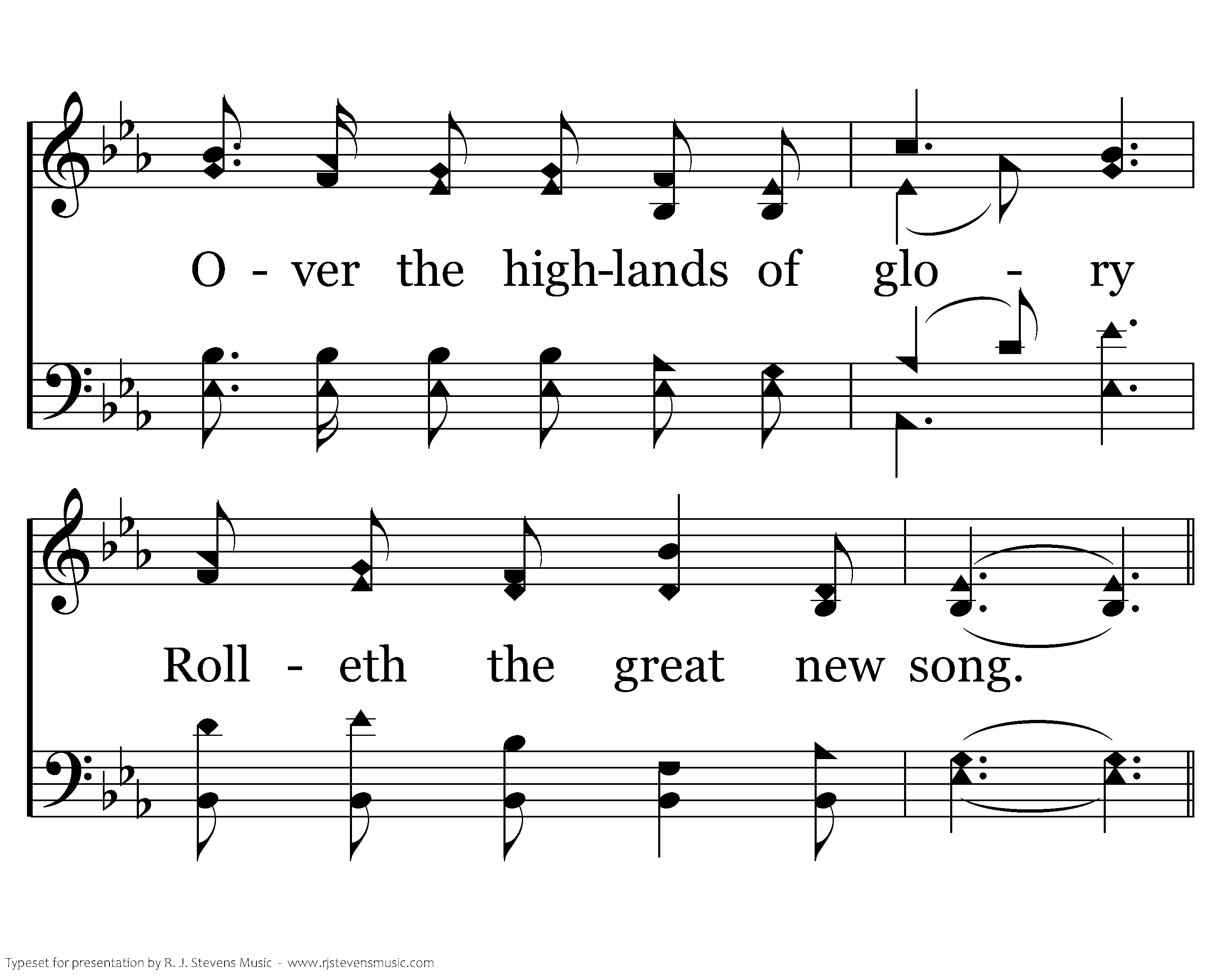 There is the home of my Savior; There, with the bloodwashed throng, Over the highlands of glory Rolleth the great new song.