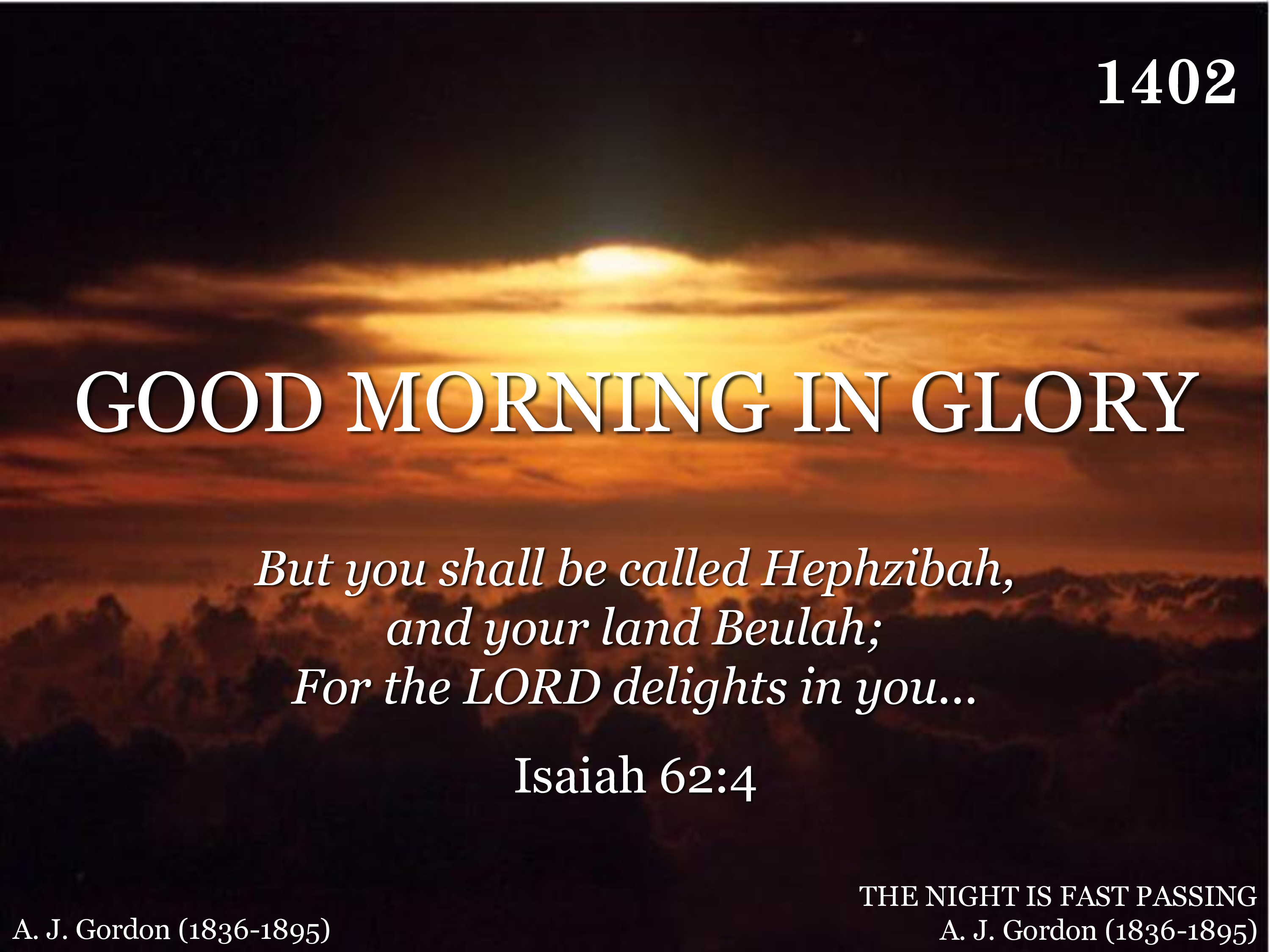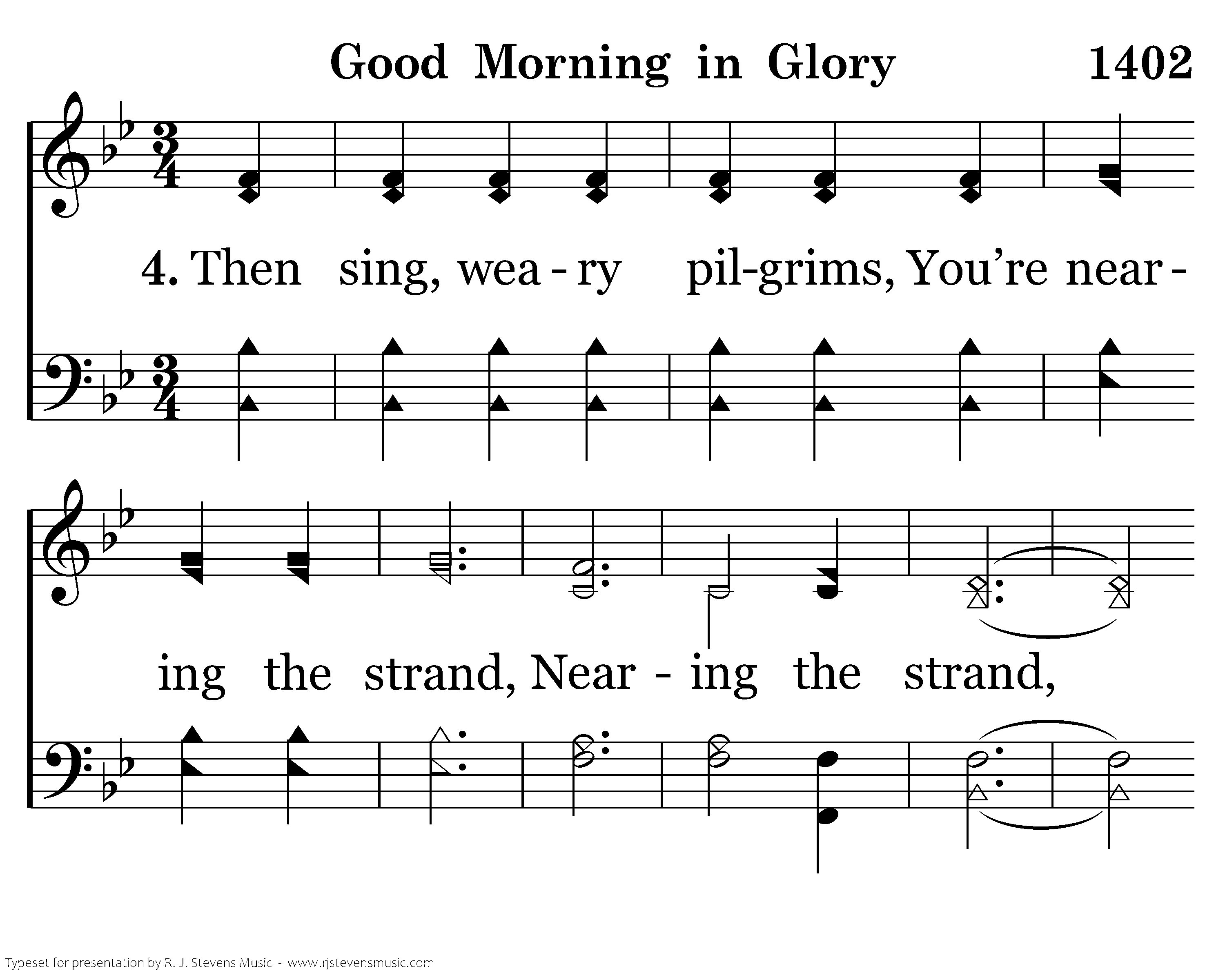 We’ll say good morning in glory, Good morning, good morning, We’ll say good morning in glory, When the darkness has turned to day.