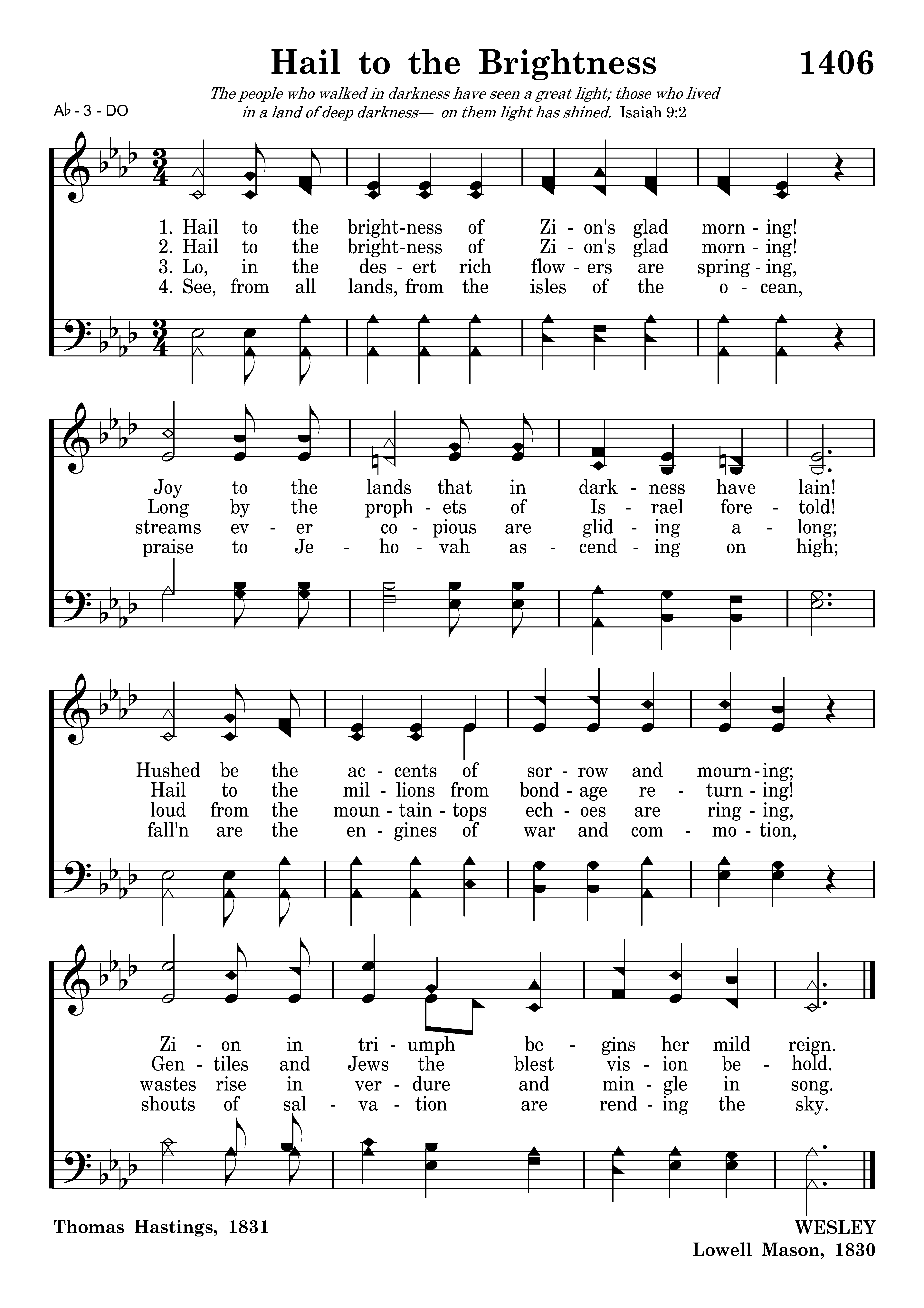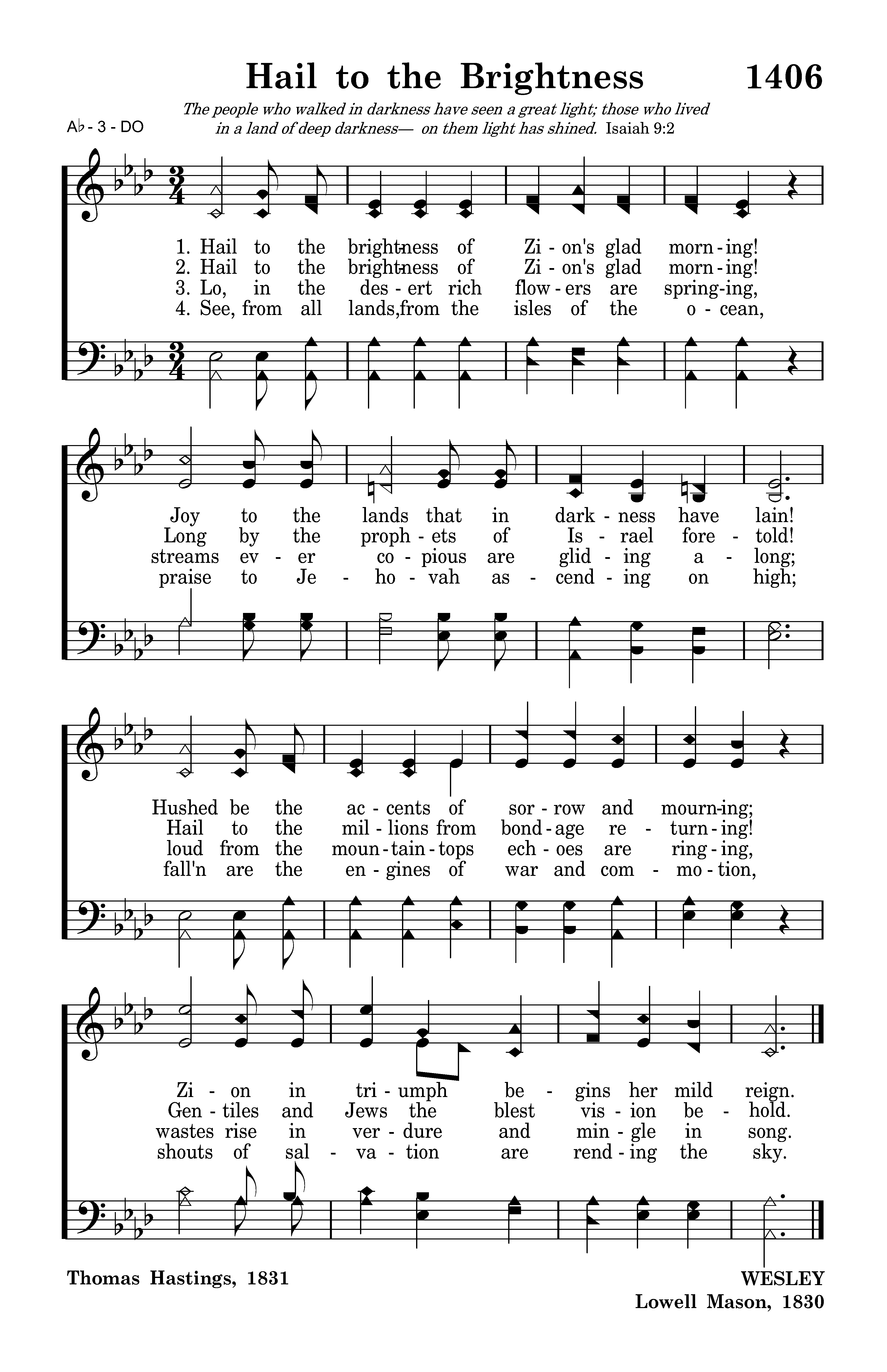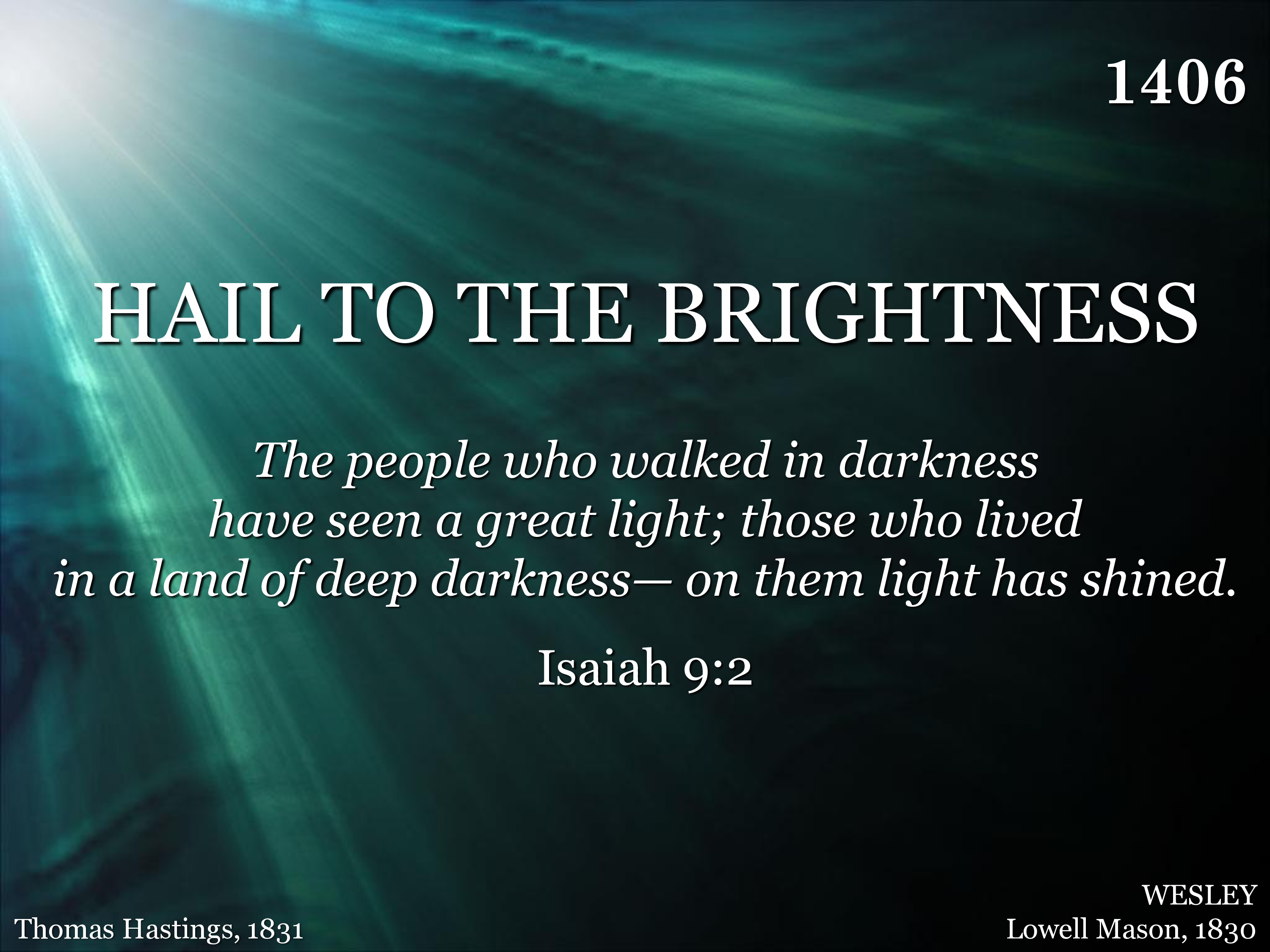 Hail to the brightness of Zion's glad morning! Joy to the lands that in darkness have lain! Hushed be the accents of sorrow and mourning; Zion in triumph begins her mild reign.