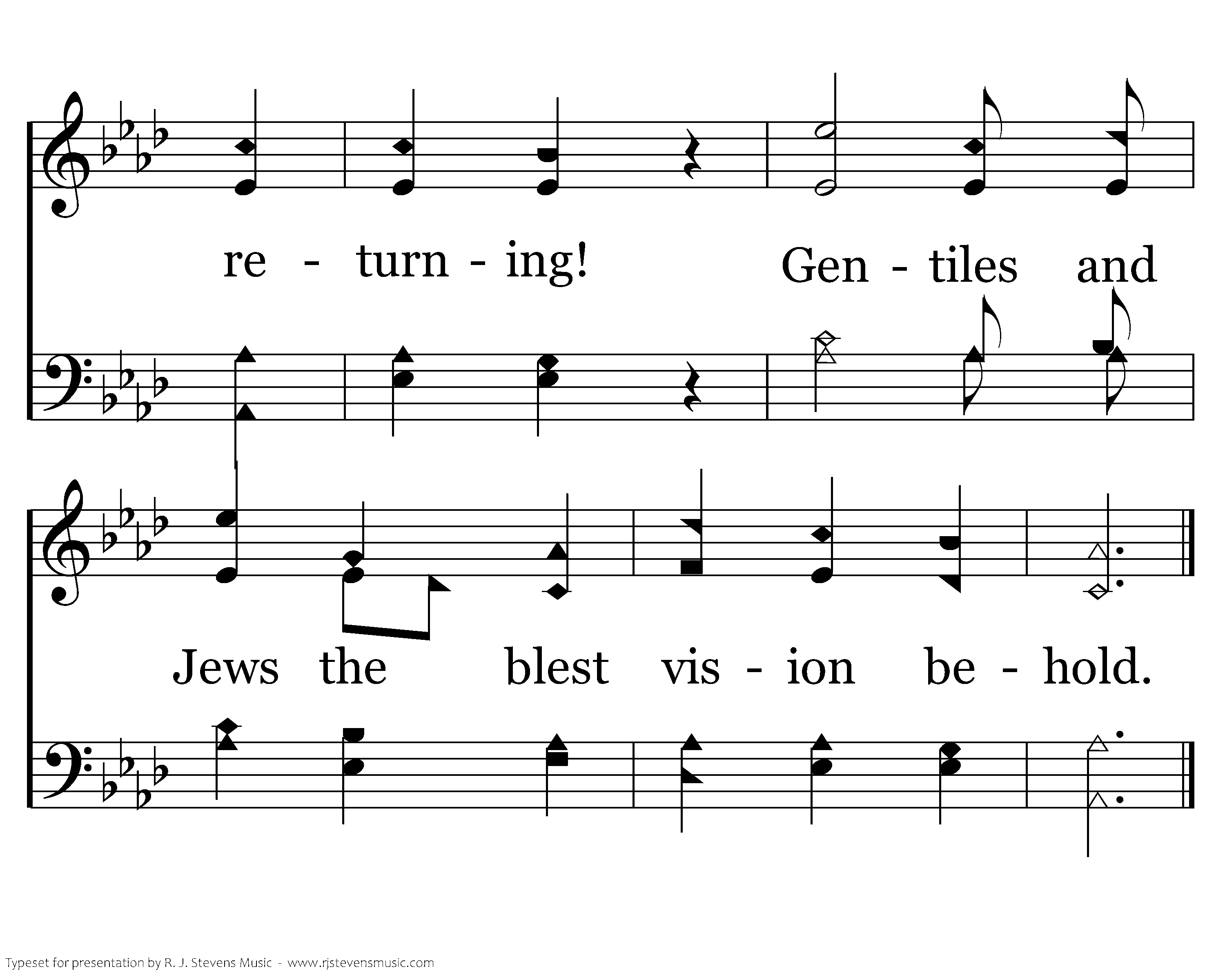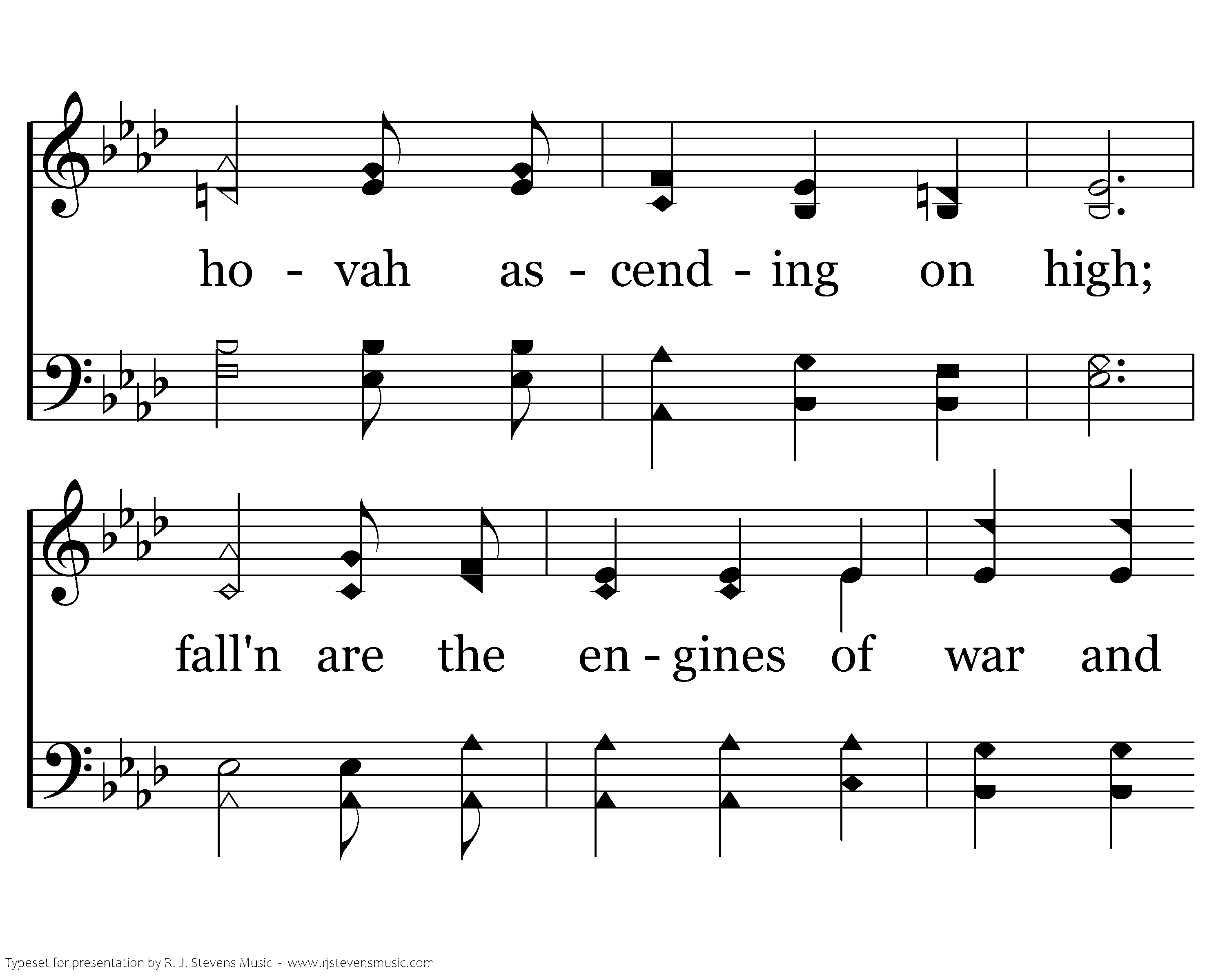See, from all lands, from the isles of the ocean, praise to Jehovah ascending on high; fall'n are the engines of war and commotion, shouts of salvation are rending the sky.