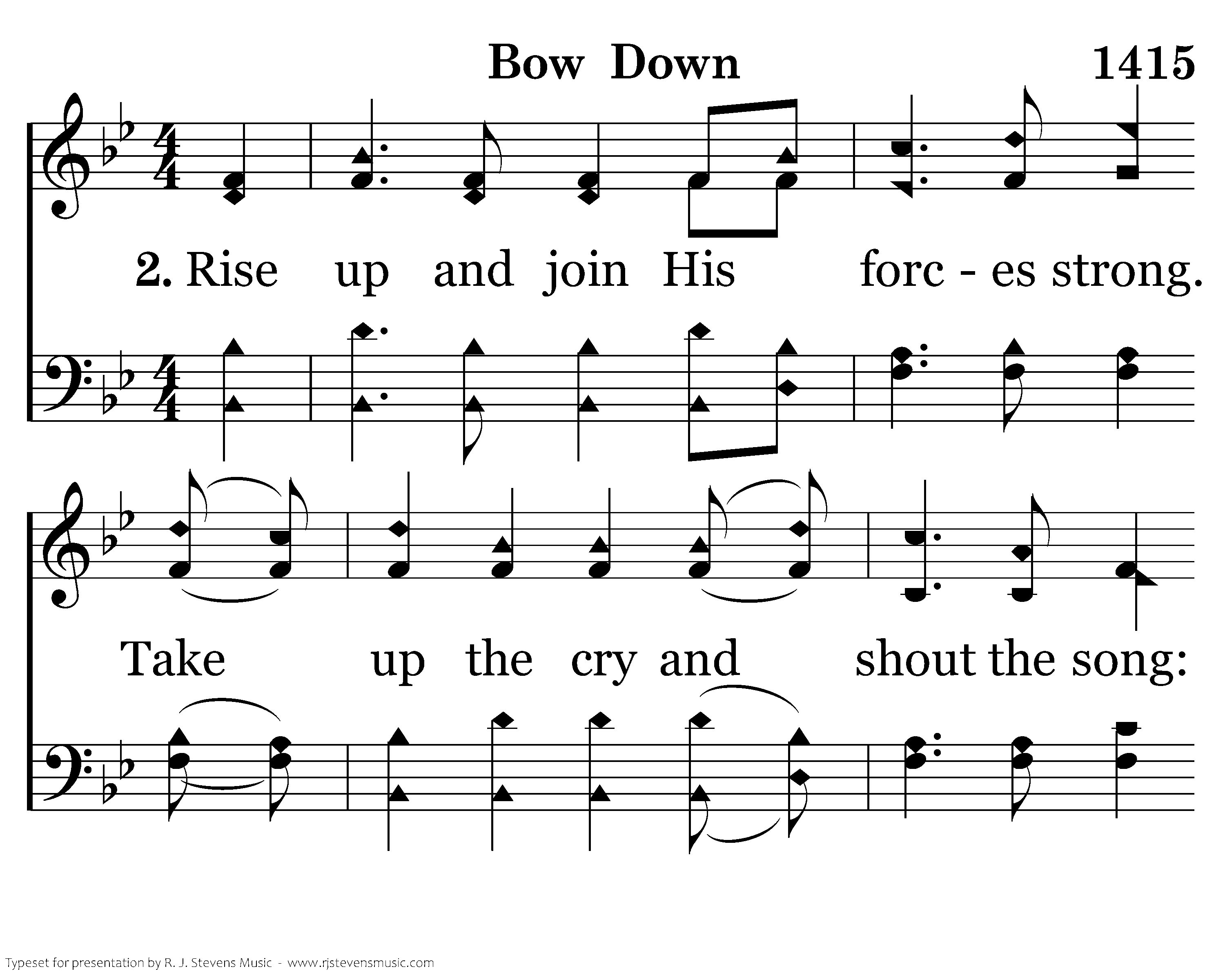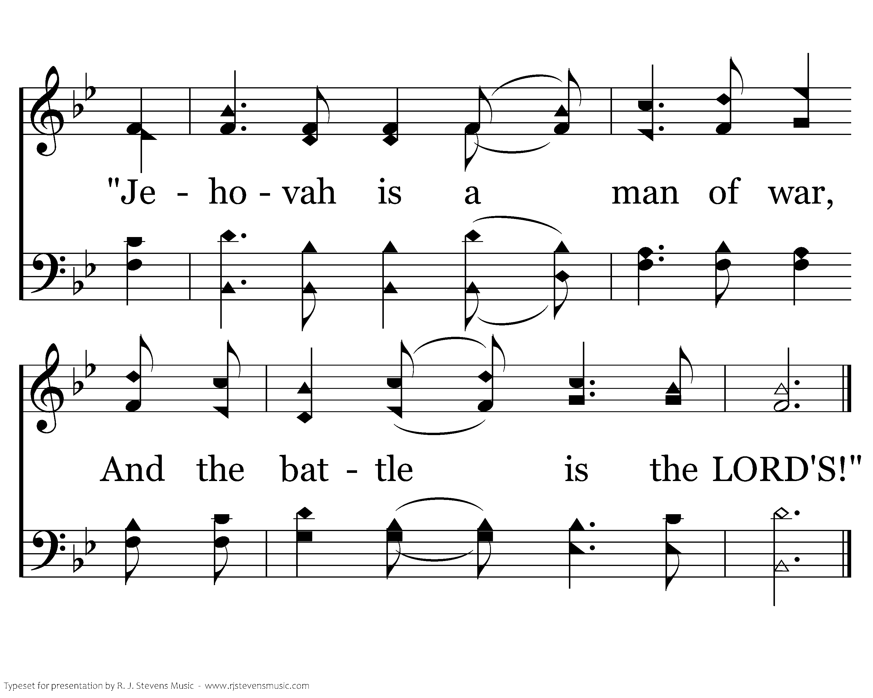 Rise up and join His forces strong. Take up the cry and shout the song: "Jehovah is a man of war, And the battle is the LORD'S!"