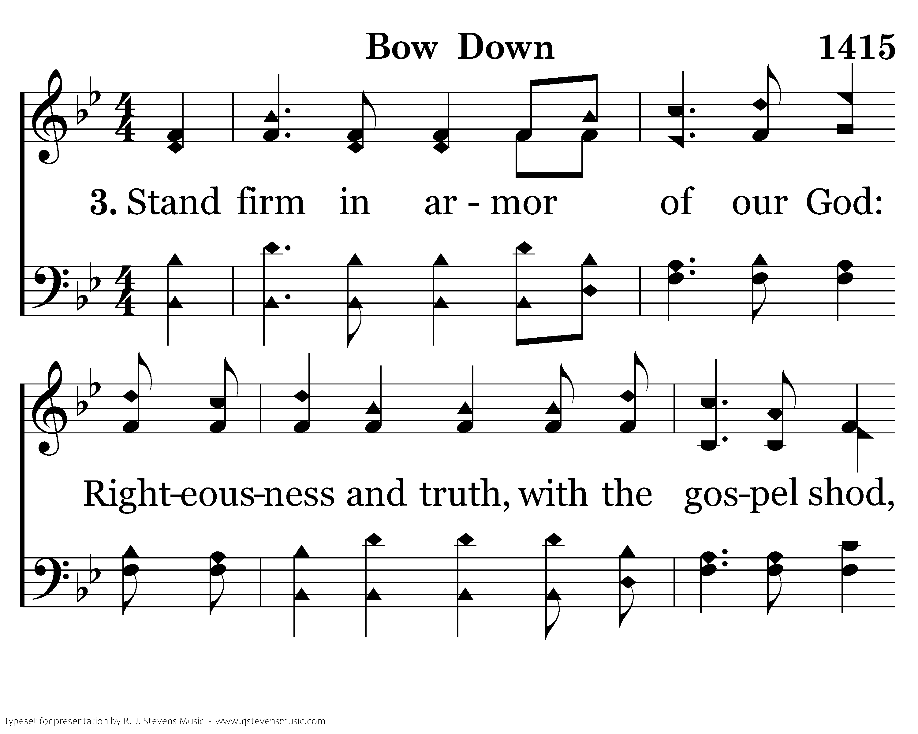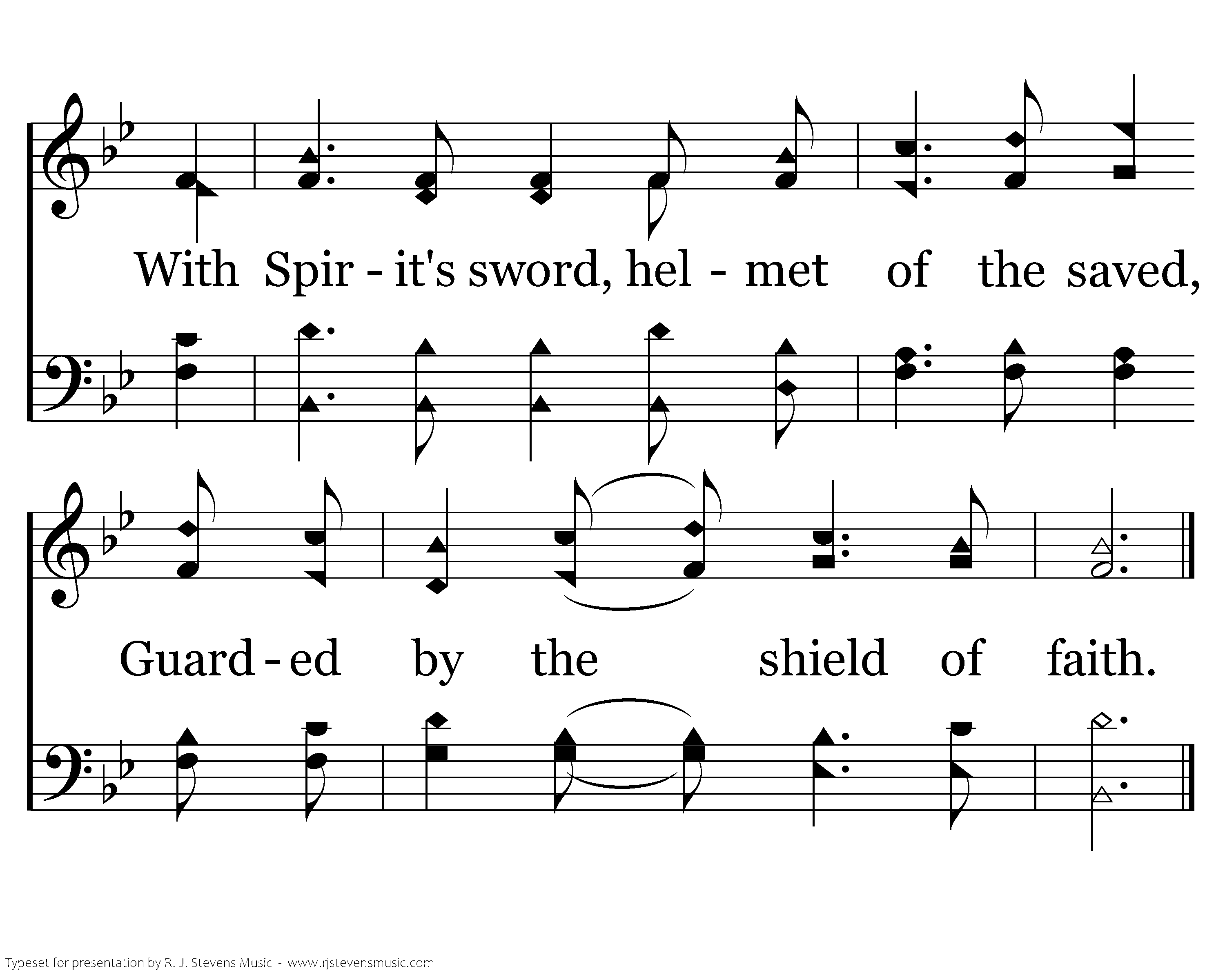 Stand firm in armor of our God: Righteousness and truth, with the gospel shod, With Spirit's sword, helmet of the saved, Guarded by the shield of faith.