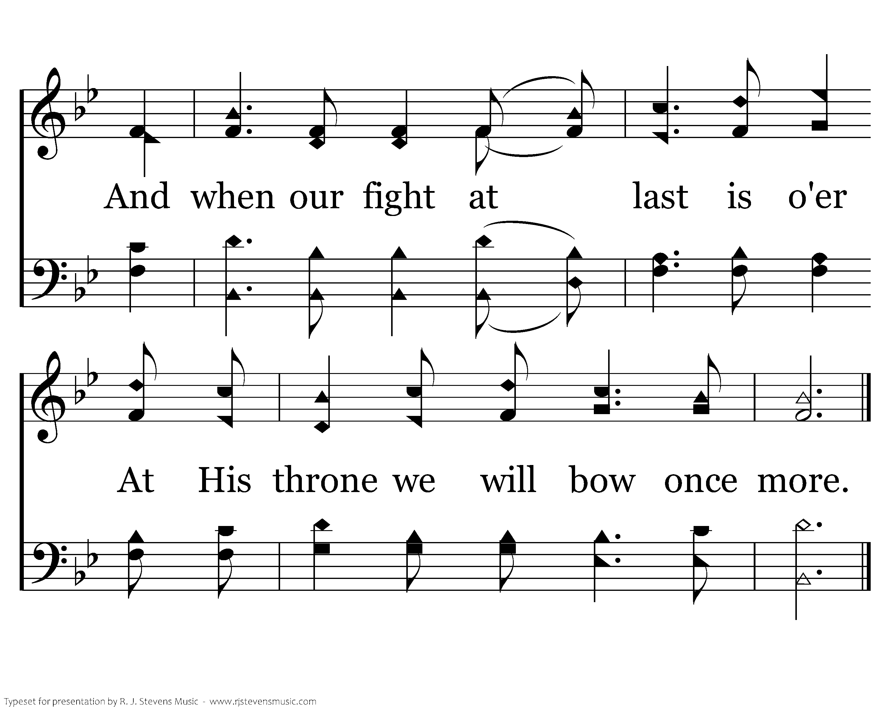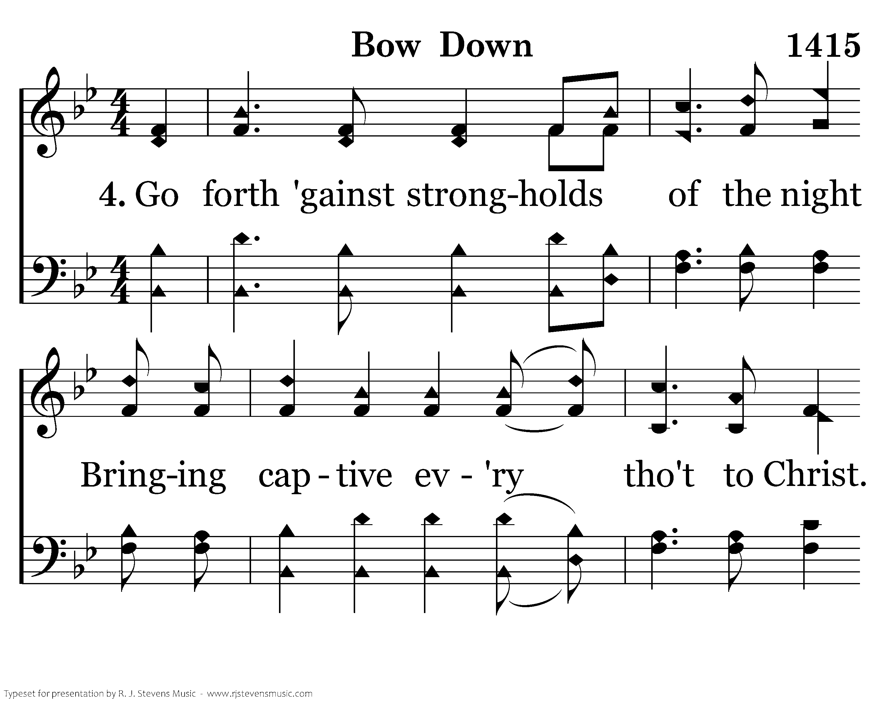 Go forth 'gainst strongholds of the night Bringing captive ev'ry thought to Christ. And when our fight at last is o'er At His throne we will bow once more.