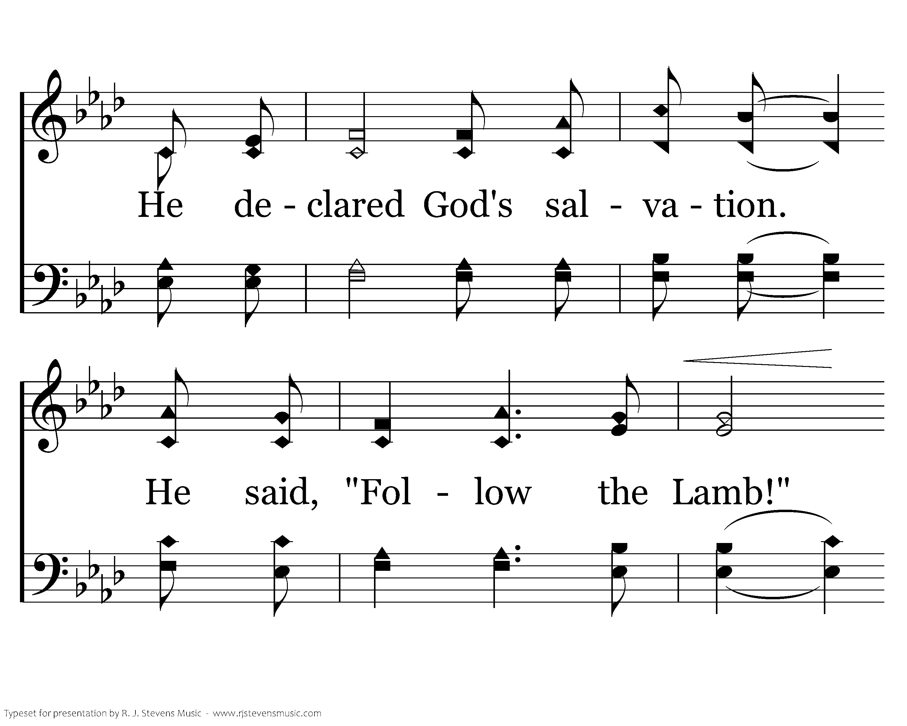 Then I heard of one crying, "Make the paths straight for Him," He declared God's salvation. He said, "Follow the Lamb!" And a voice came from heaven: "I am please in My Son," As the Spirit descended On the beloved One.