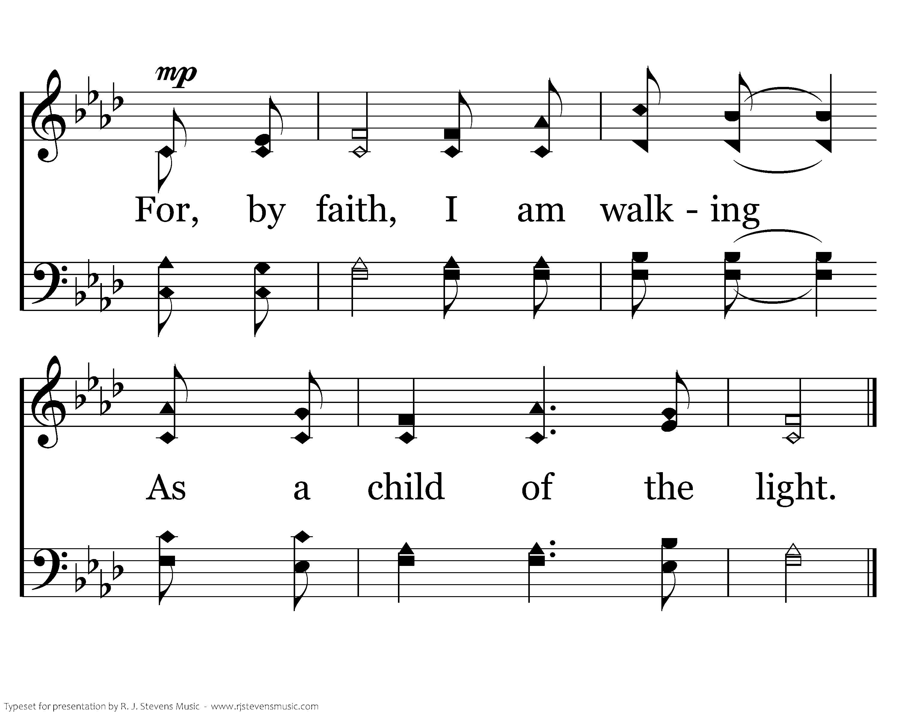 Thru the valley of shadow, In the presence of foes, Nevermore will I tremble At their threats or my woes. Perfect love is within me, Casting out fear and night. For, by faith, I am walking As a child of the light.