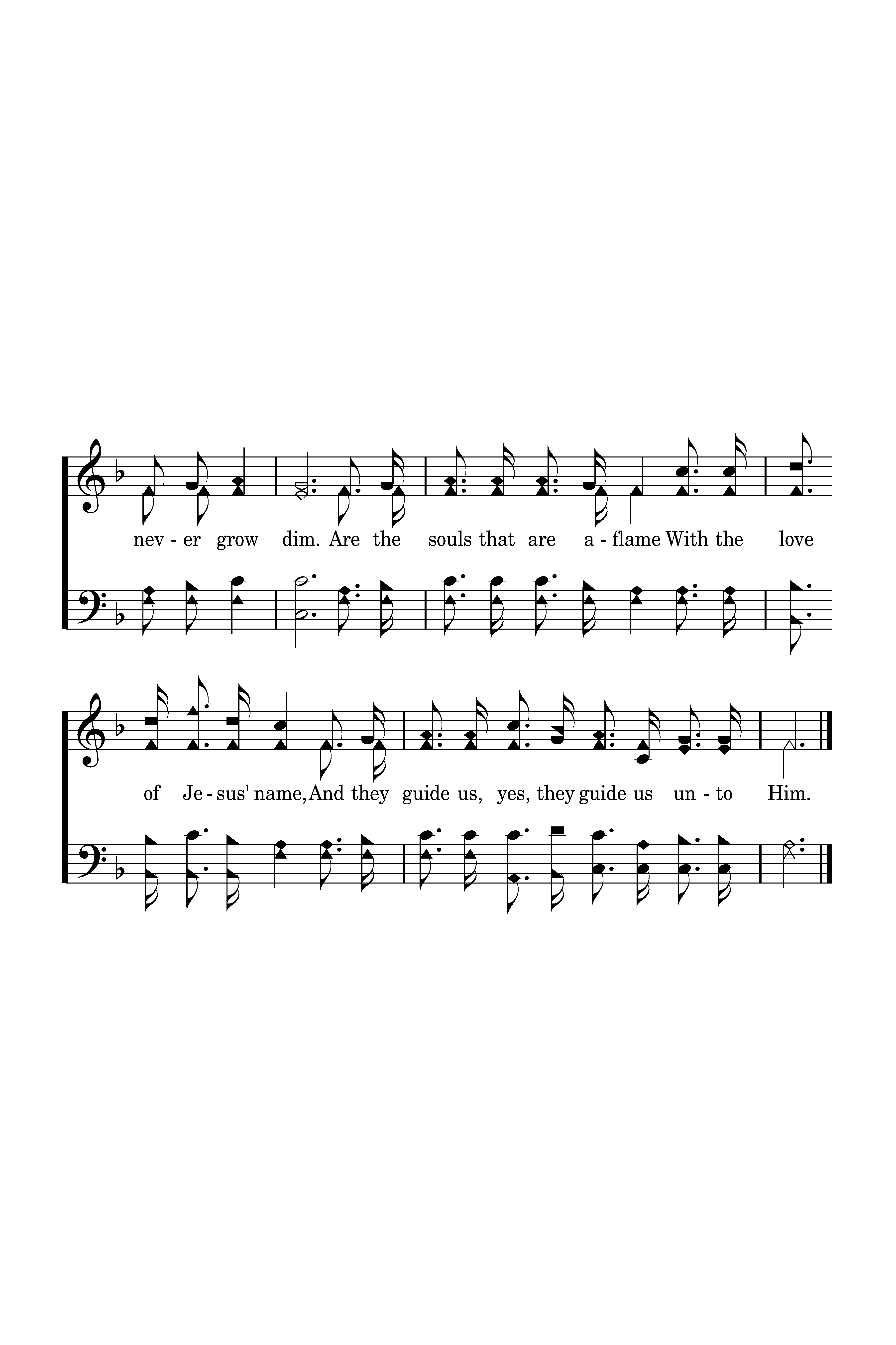 O, the lights along the shore That never grow dim, Never, never grow dim. Are the souls that are aflame With the love of Jesus' name, And they guide us, yes, they guide us unto Him.