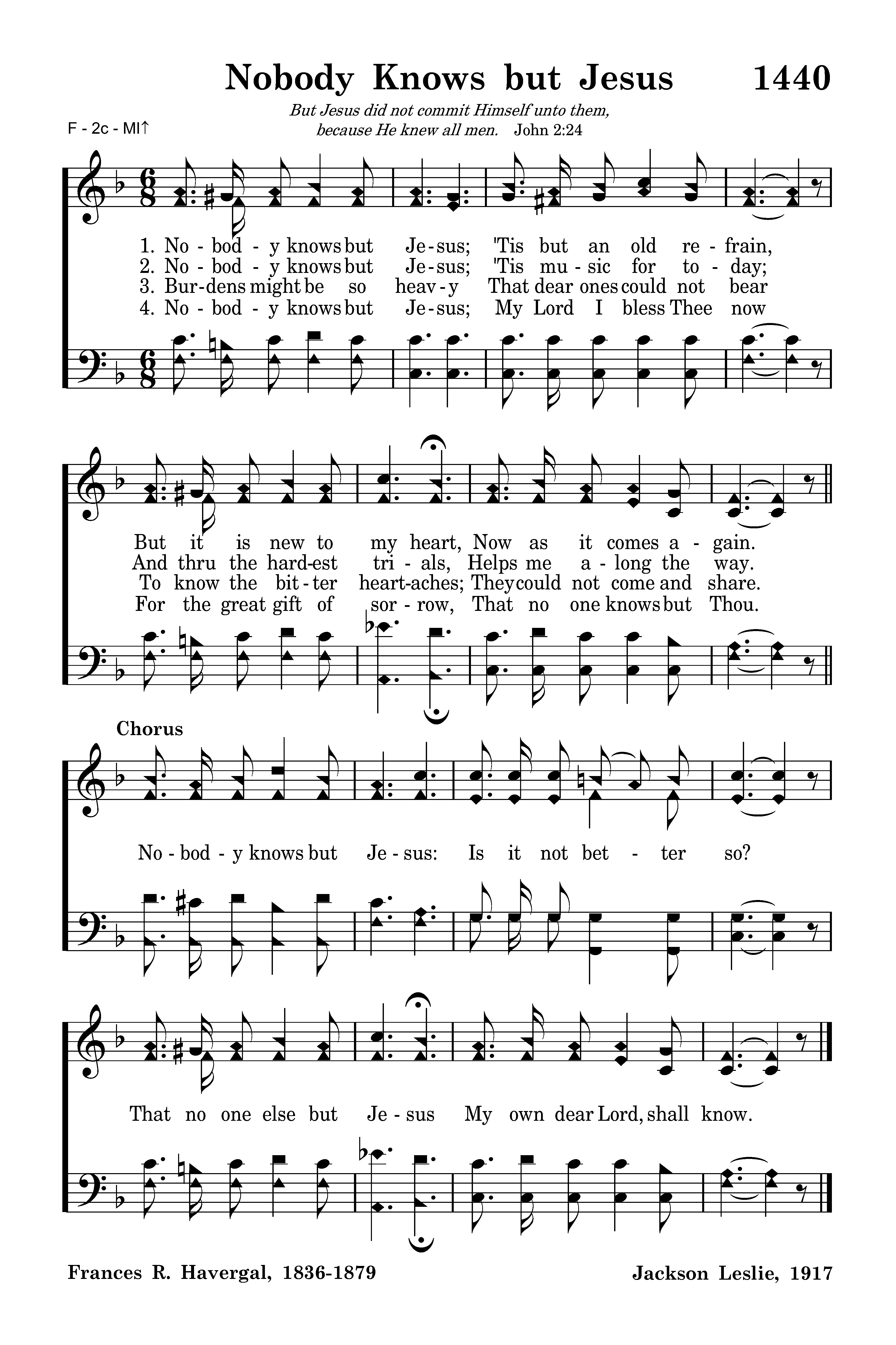 Nobody knows but Jesus; 'Tis but an old refrain, But it is new to my heart, Now as it comes again.